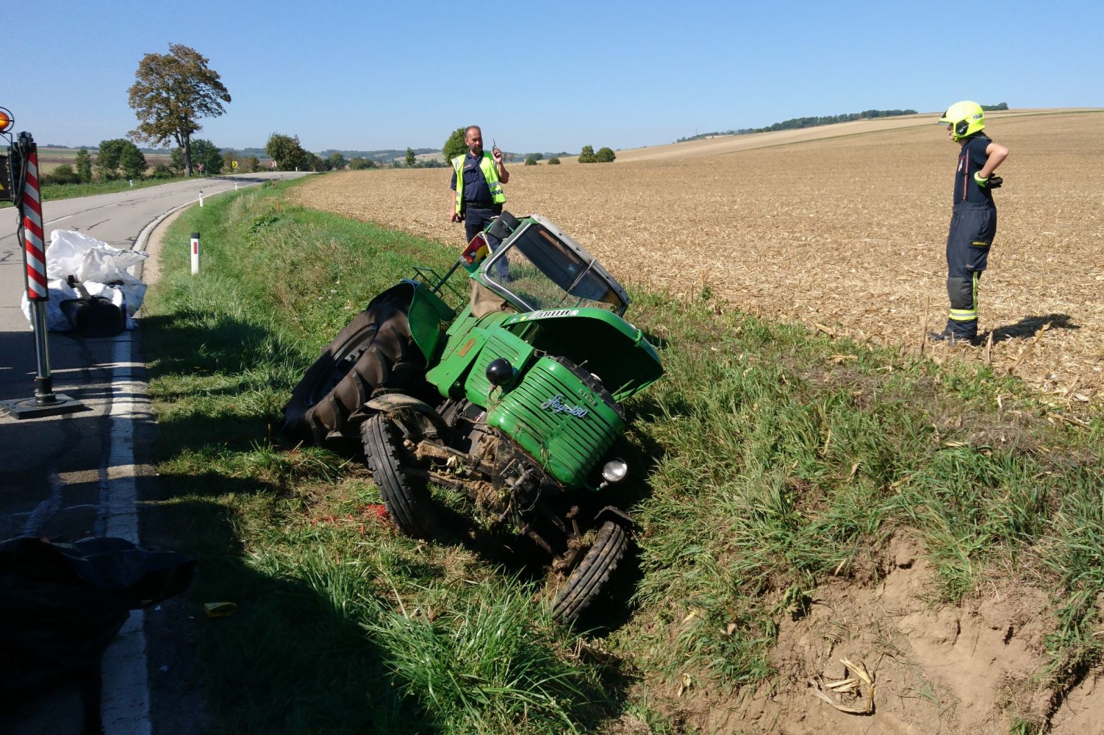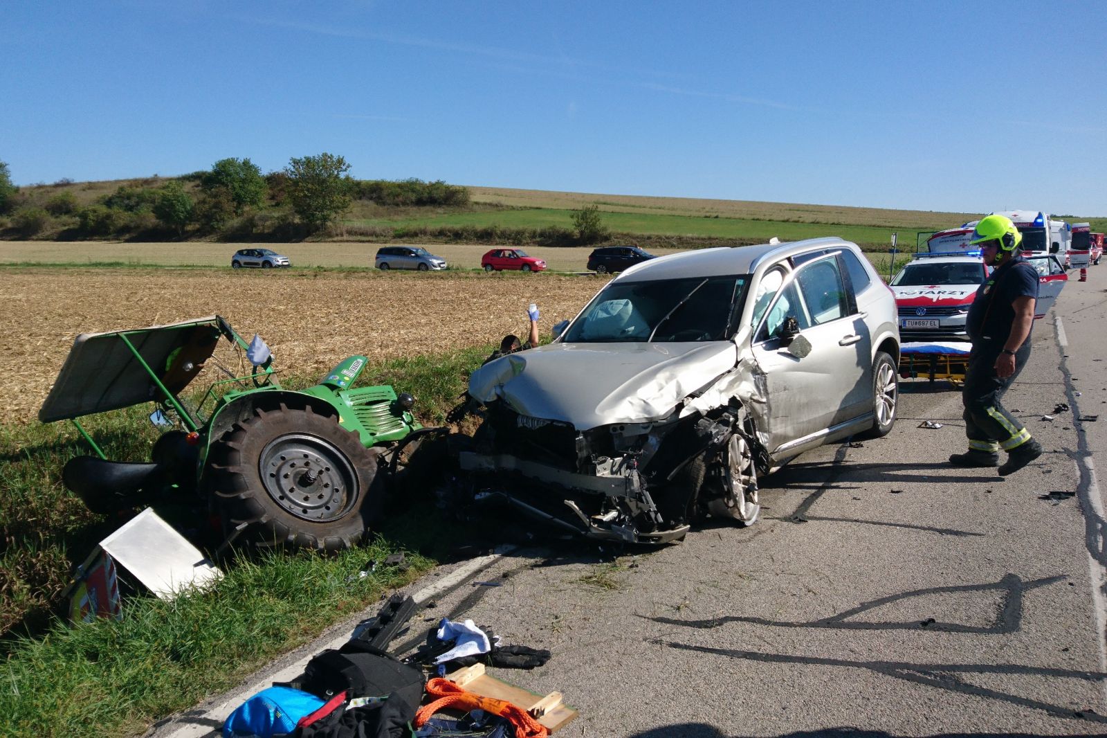 Im einem Kreuzungsbereich der Landesstraße mit einem Güterweg stießen ein Oldtimertraktor, ein Klein-LKW und ein PKW zusammen.