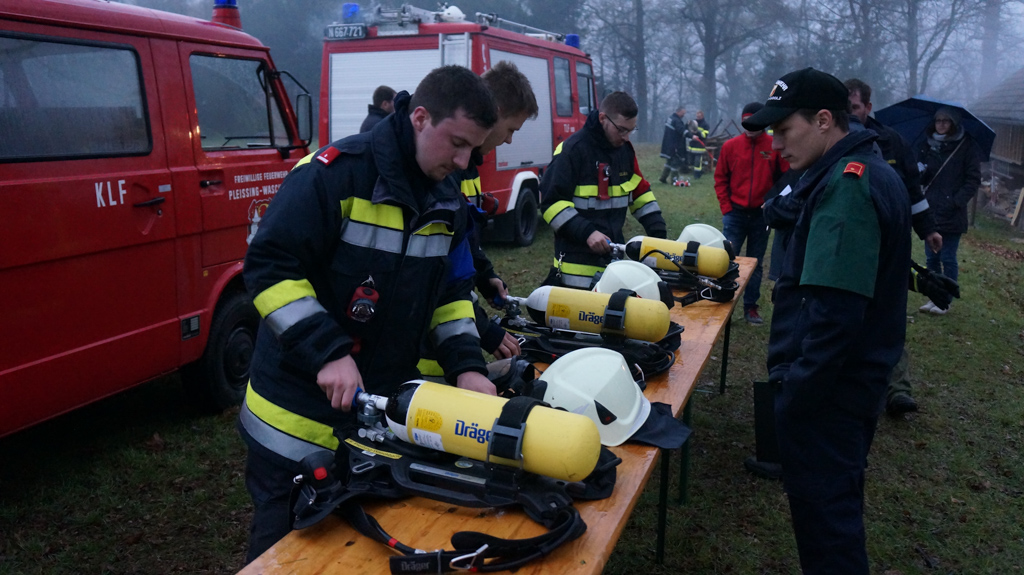 Innerhalb von 170 Sekunden müssen sich die Teilnehmer mit Atemschutzgerät und diversen Geräten, wie Feuerwehraxt, Rettungsleine und Notrettungsset ausrüsten.