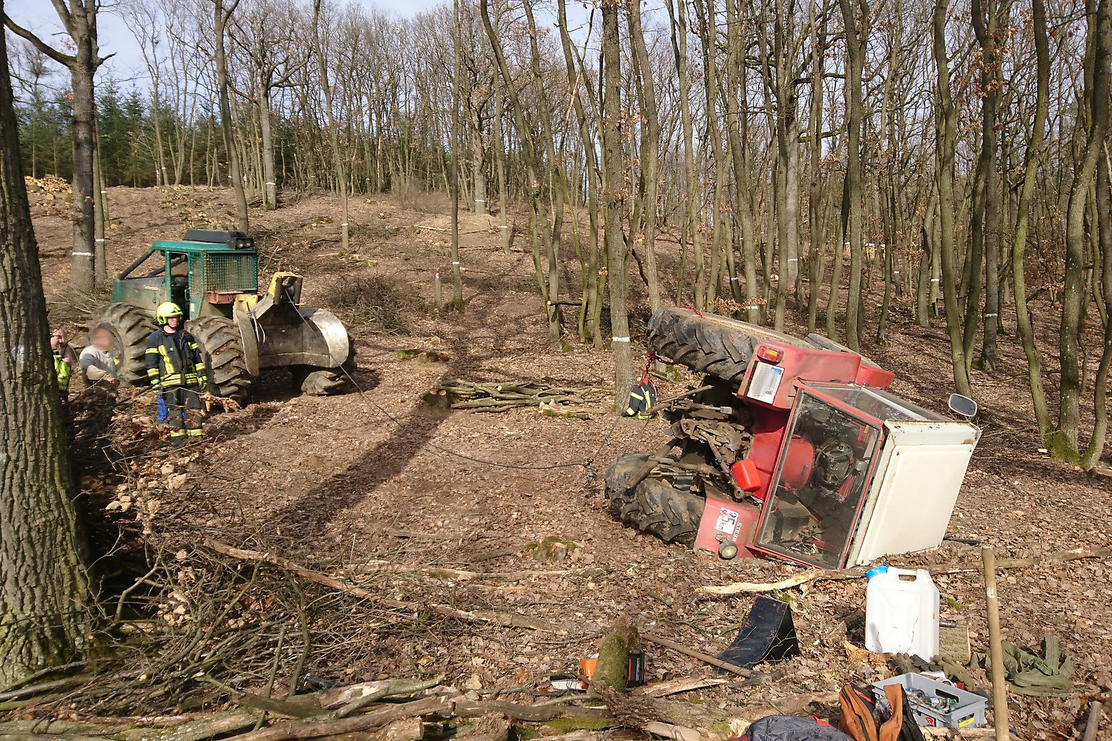 Gemeinsam mit der verständigten Forstverwaltung konnte dann der gekippte Traktor mit einer Forstseilwinde wieder auf die Räder gestellt werden.