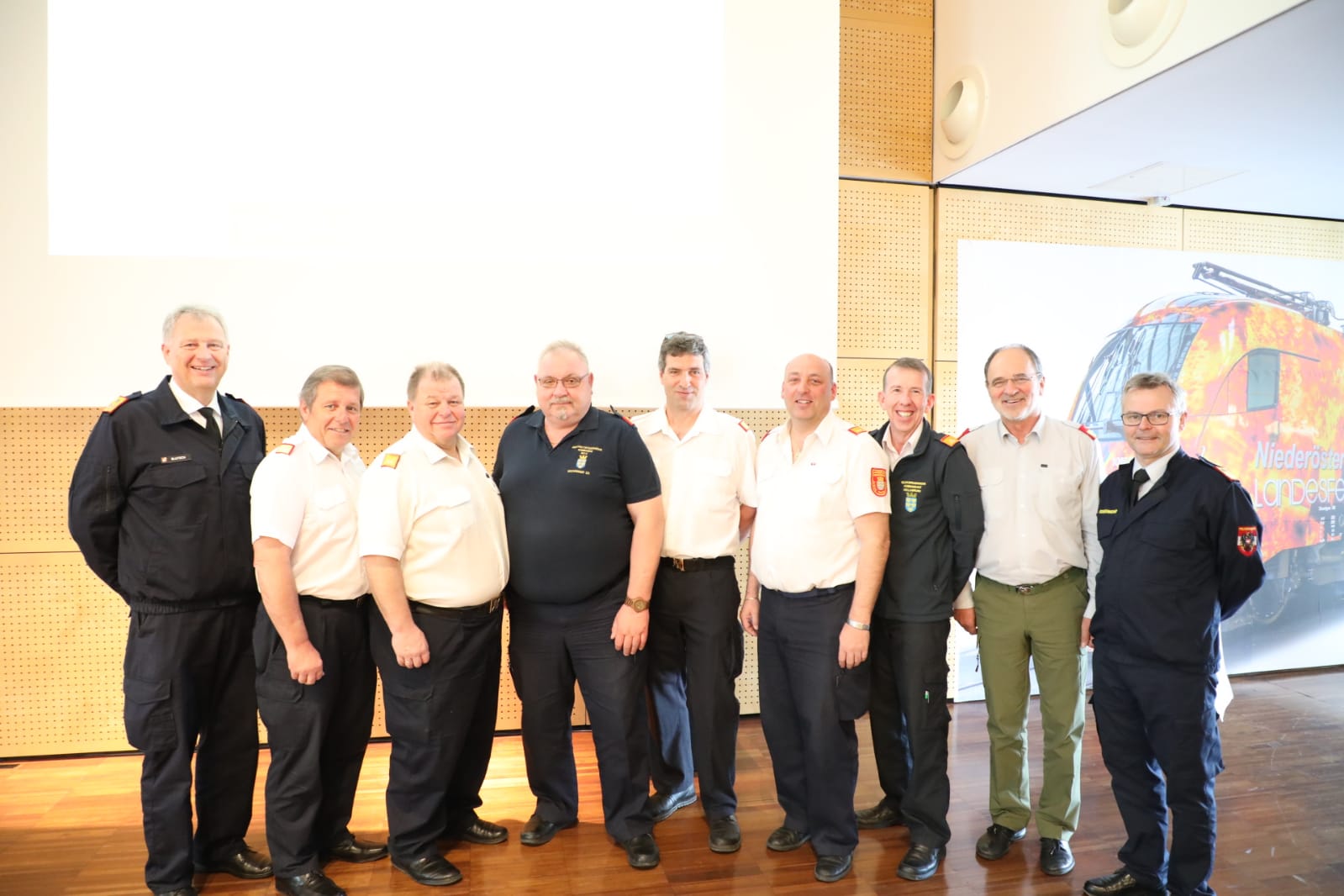 Am Foto der Feuerwehrpräsident des ÖBFV Franz Humer und Feuerwehrvizepräsident Armin Blutsch und der Leiter der Feuerwehrschule Burgenland Josef Bader sowie die Führungskräfte des Bezirksfeuerwehrkommandos Hollabrunn und den vier Abschnittsfeuerwehrkommanden.