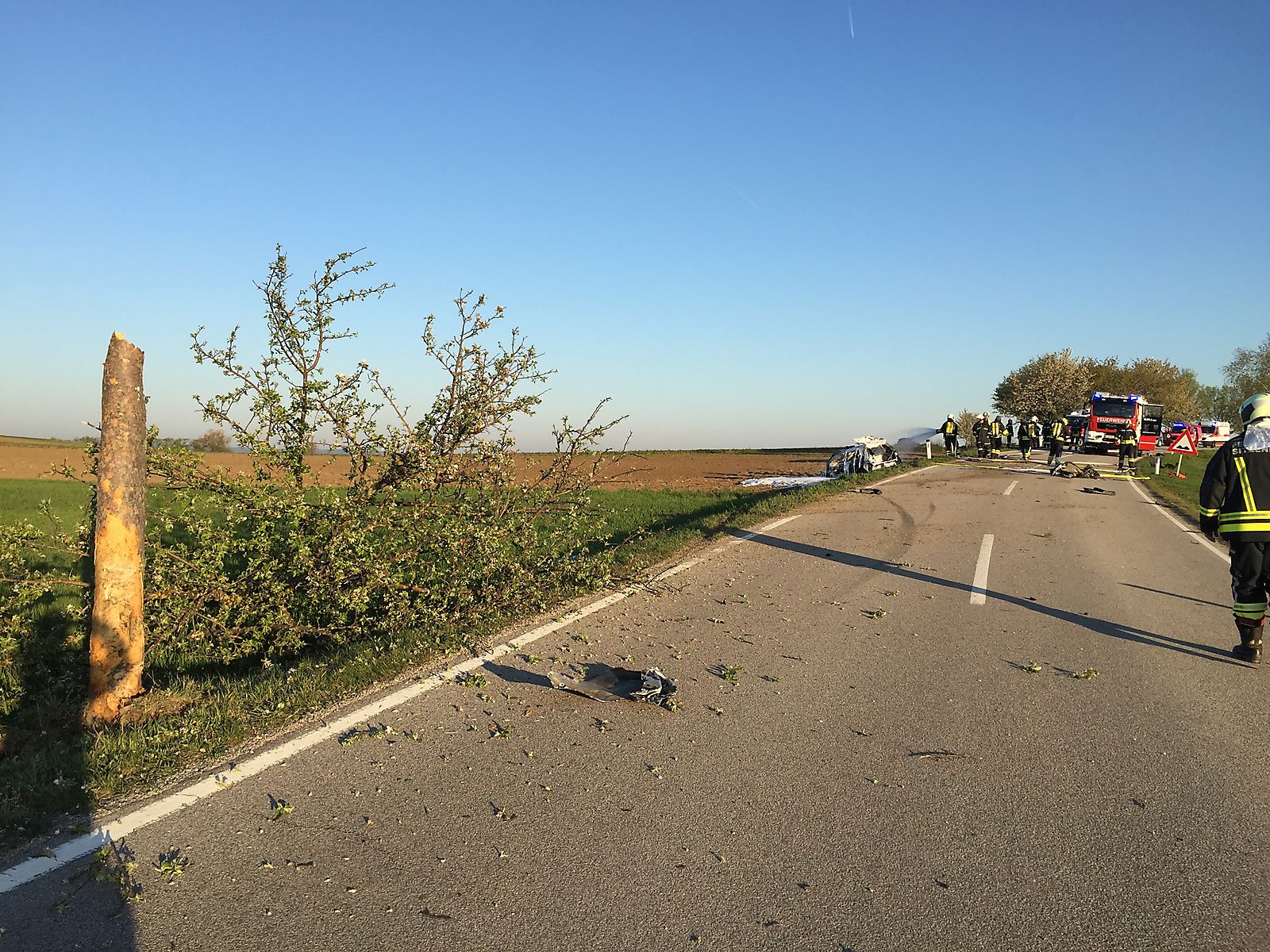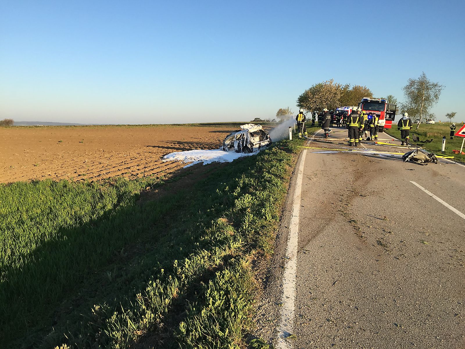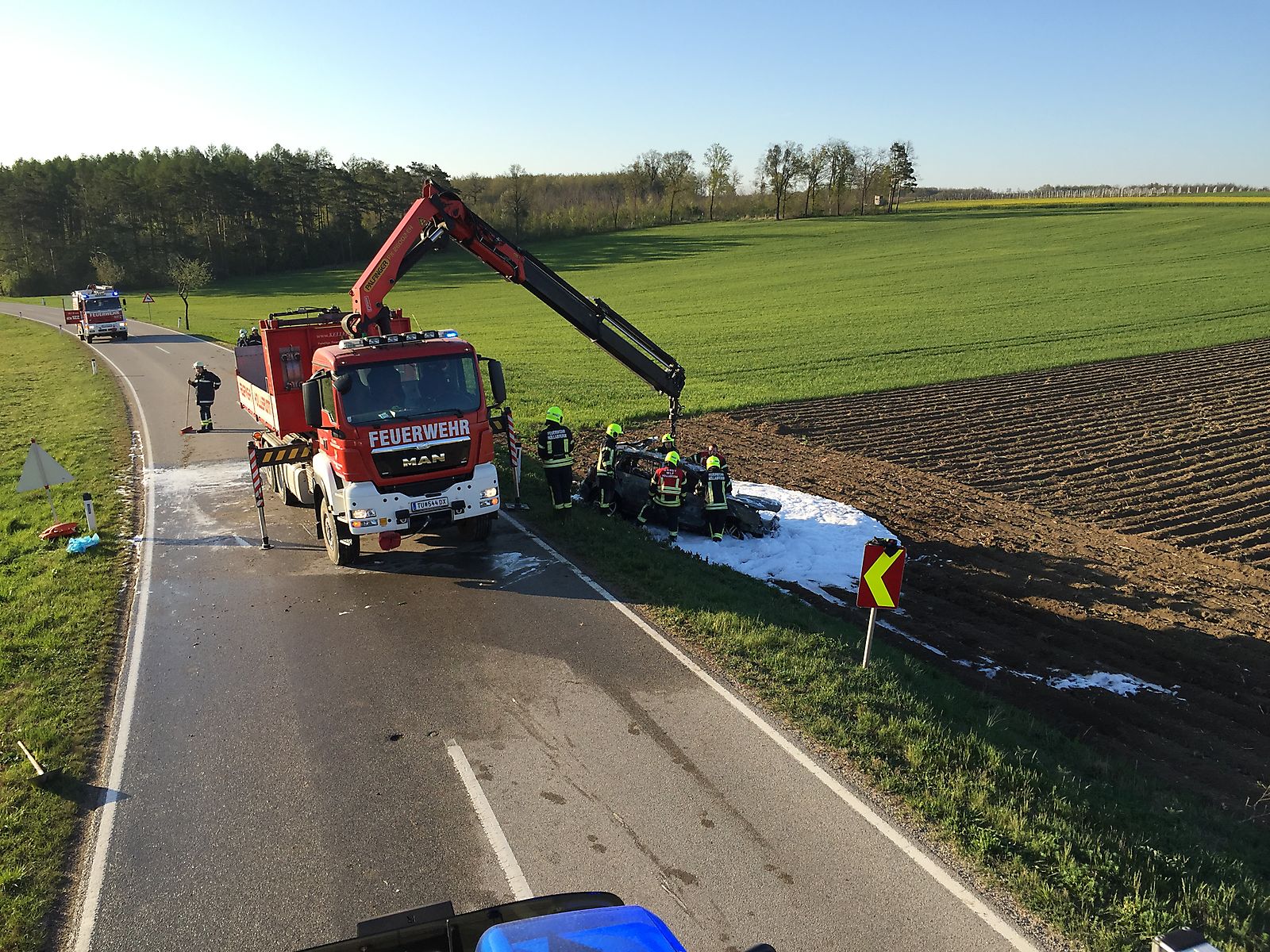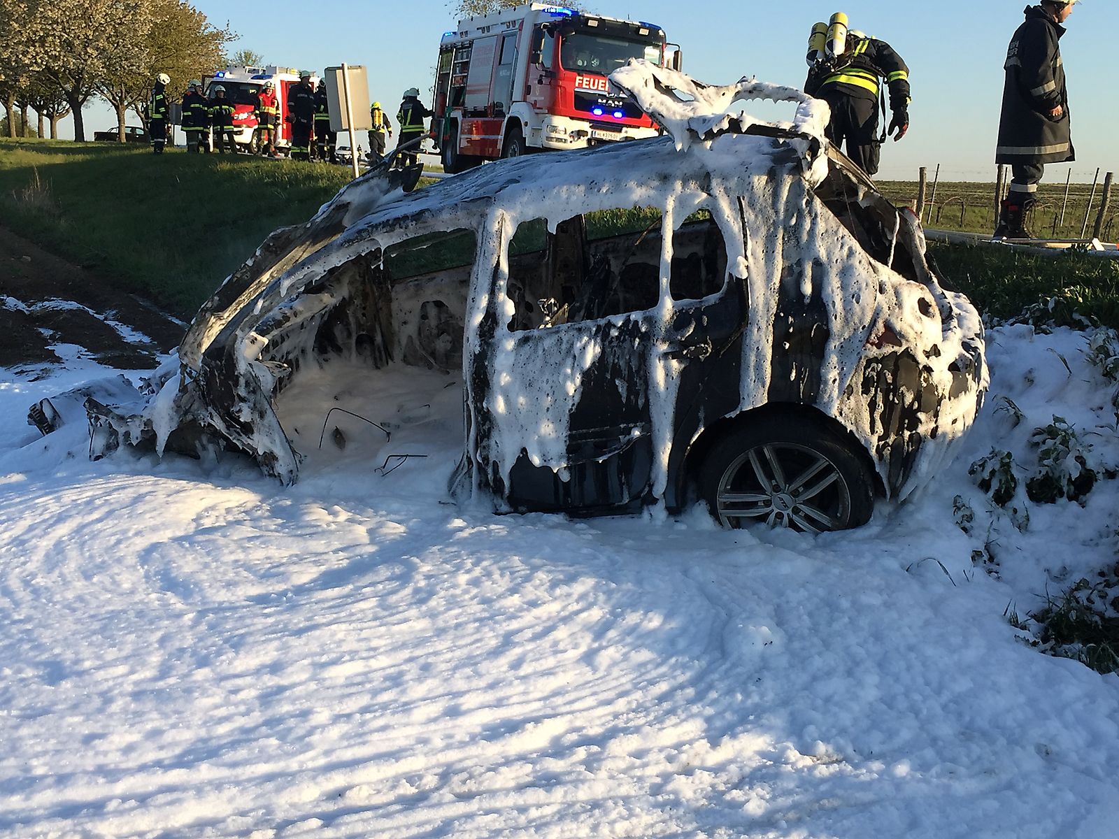Um 06:25 Uhr wurden die Feuerwehren Frauendorf und Sitzendorf zu einem Fahrzeugbrand von Sitzendorf an der Schmida in Richtung Groß gerufen. Ein junger Fahrzeuglenker kam aus unbekannten Gründen von Groß in Fahrtrichtung Sitzendorf links von der Fahrbahn ab, kollidierte mit einem Baum und wurde in den angrenzenden Acker geschleudert.