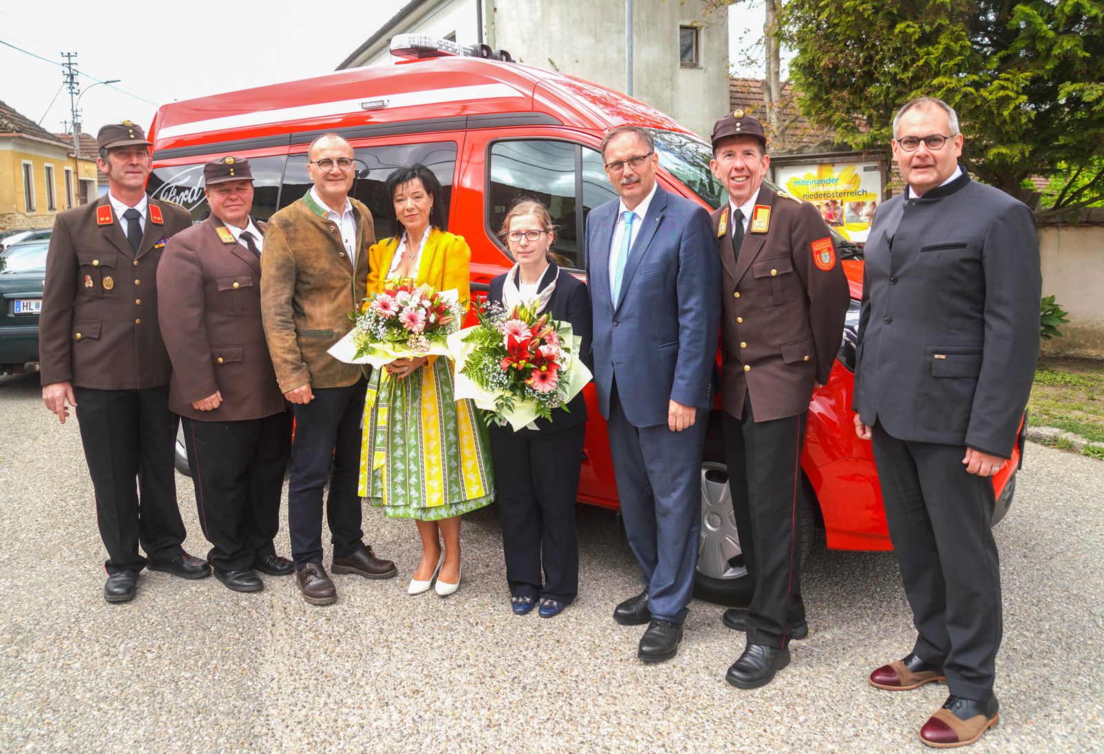 Am Foto vlnr: Kdt OBI Franz Dinstl, BR Reinhard Scheichenberger, Bgm. Ing. Peter Steinbach, die Patinnen Christine Steinbach und Stefanie Ebermann, Labg. Richard Hogl, LFR Alois Zaussinger, Vizebgm. Günther Brandstätter