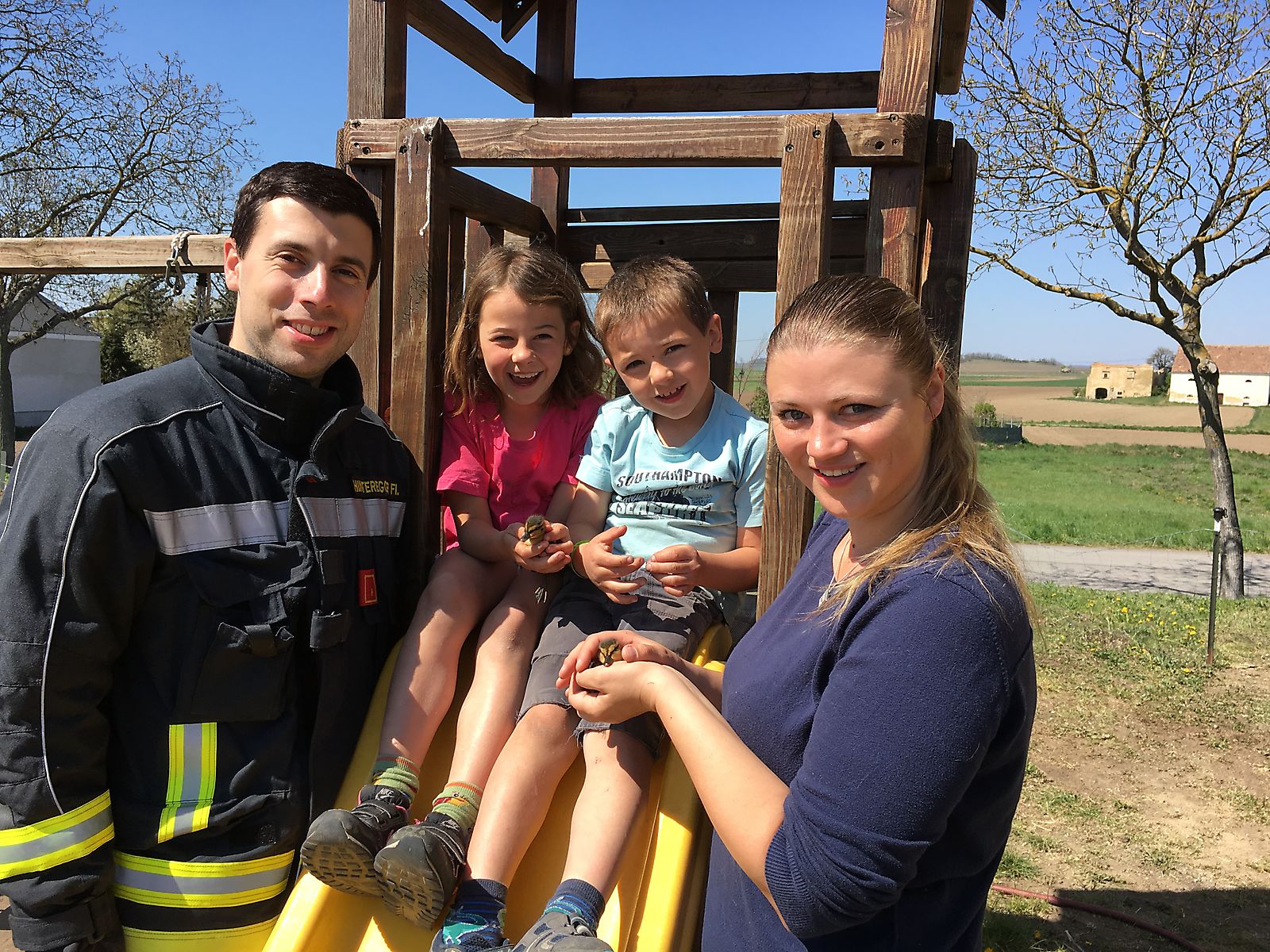 Stellvertretender Kommandant der FF Sitzendorf Florian Hinteregger, die glücklichen Kinder Bianca und Kilian sowie die beherzte Passantin Yvonne Bräuer welche die Entenküken fand.