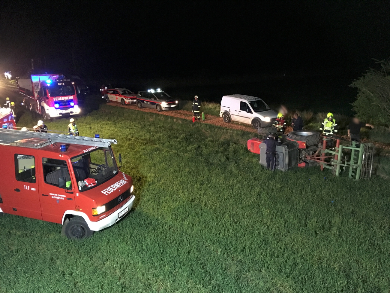 Am Unfallort angekommen, wurden wir vom Einsatzleiter über die Lage informiert. Ein Traktorfahrer kam aus noch unbekannter Ursache vom Weg ab und kippte über die Böschung. Dabei dürfte der Fahrer aus dem Traktor geschleudert, unter dem schweren Gerät eingeklemmt und seinen Verletzungen erlegen sein. Der zu Hilfe gerufene Notarzt konnte nur noch den Tod des Lenkers feststellen.