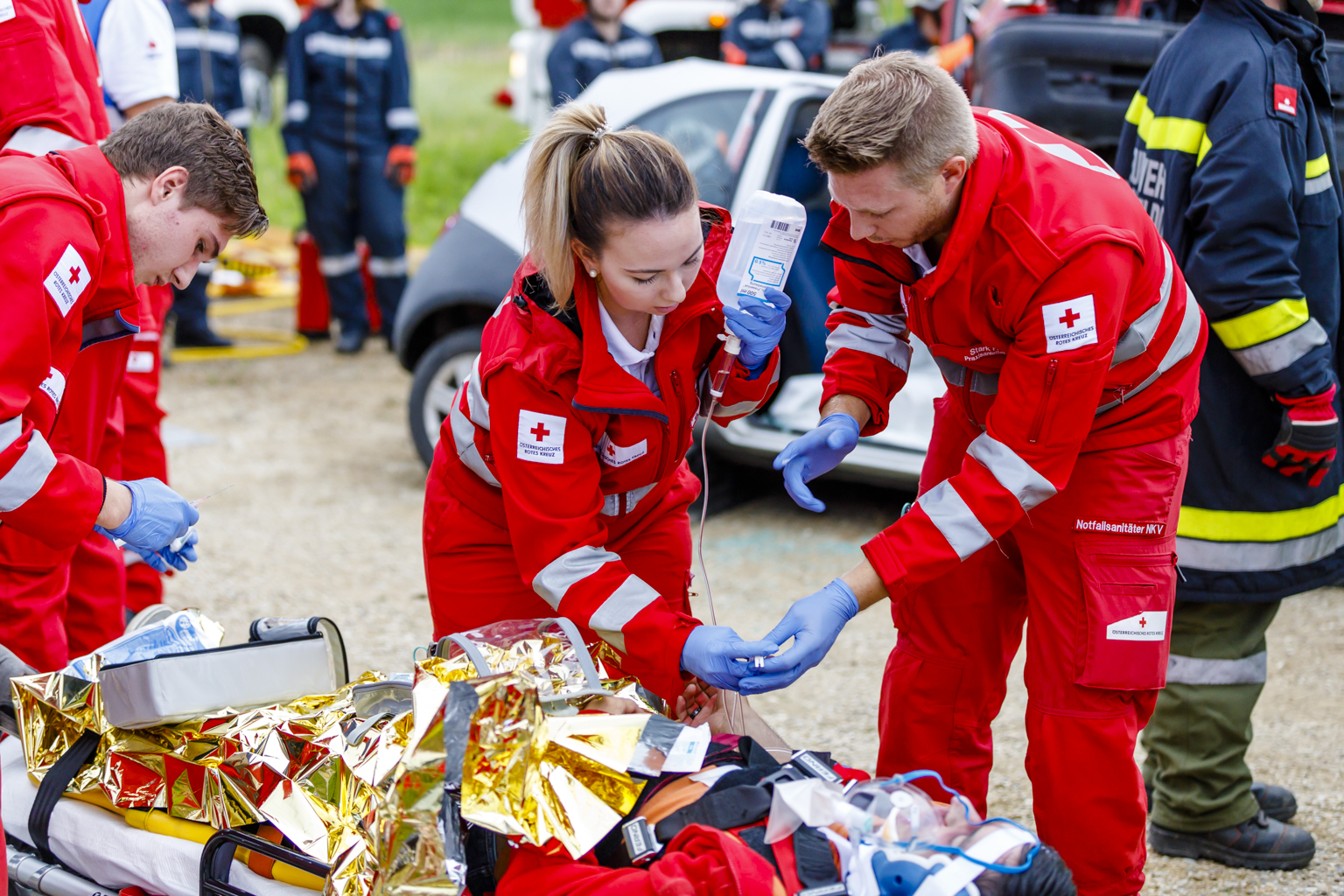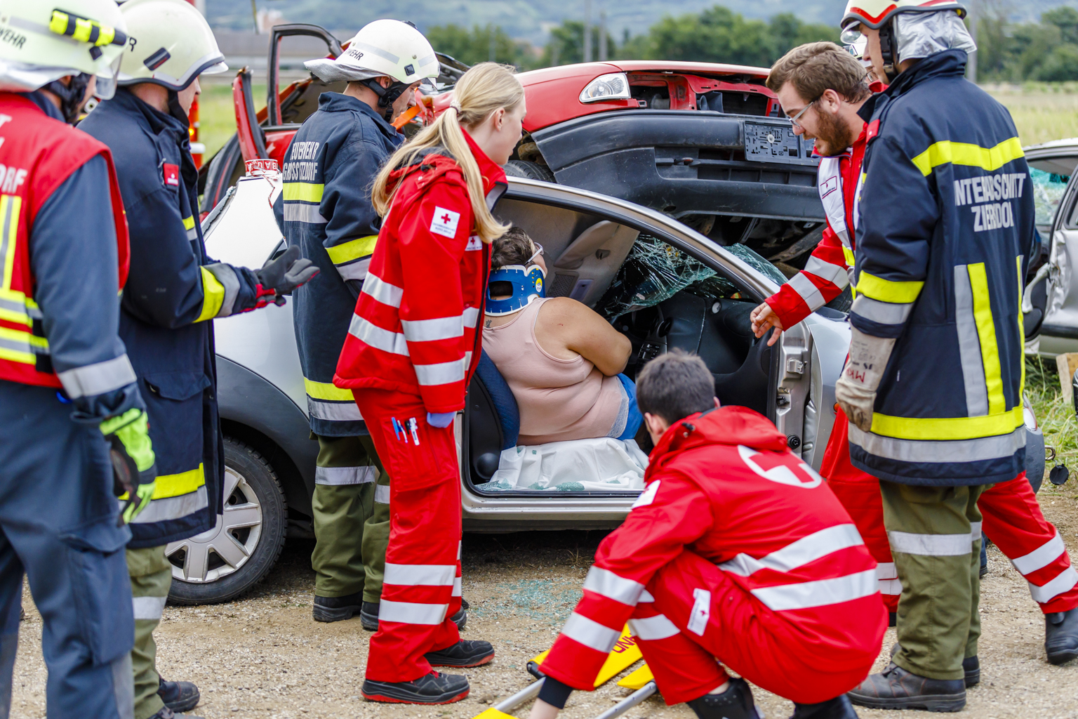 Annahme war ein Verkehrsunfall mit mehreren eingeklemmten Personen. Nicht nur das technische Können, sondern speziell auch die Zusammenarbeit zwischen den unterschiedlichen Blaulichtorganisationen standen im Fokus.
