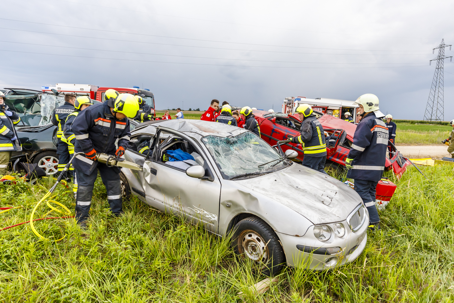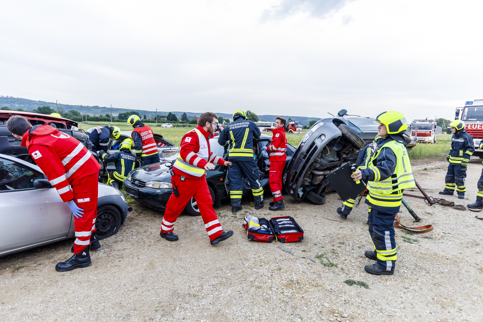 Unmittelbar nach Übungsbeginn traf das erste Fahrzeug der FF Ziersdorf am Unfallort ein. Im Zuge der Erkundung durch den Übungsleiter gab es gleich die erste Herausforderung, ein Kind, das unter Schock stand, sprang aus einem PKW und lief von der Unfallstelle weg. Geschickt wurde der Junge durch den Übungsleiter eingefangen und an die Sanitäter übergeben. Nach kurzem Informationsaustausch mit dem Übungsleiter des Roten Kreuzes wurde die Erkundung fortgesetzt und die Aufgaben verteilt. Die eintreffenden weiteren Feuerwehren meldeten sich beim Übungsleiter und bekamen von diesem ihre Befehle, gleichzeitig wurde für die bessere Organisation und Dokumentation die Einsatzleitung aufgebaut.