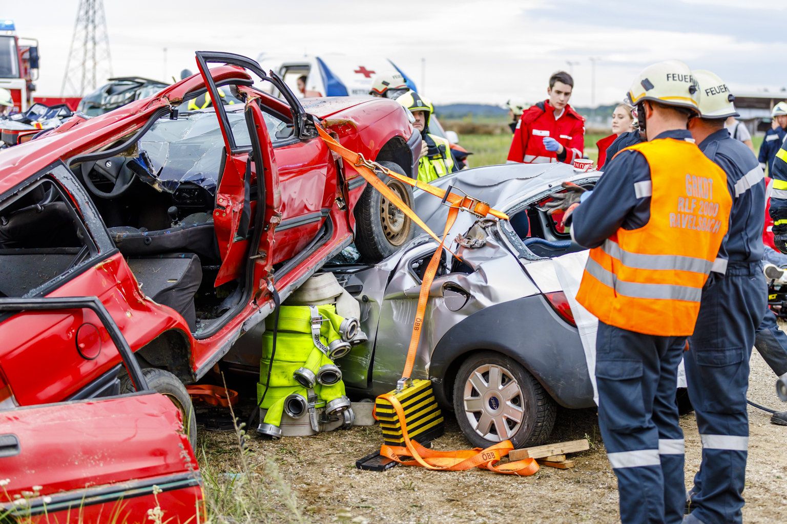 Das richtige Stabilisieren der PKWs, die Zuordnung der Verletzungen mit anschließender Einteilung nach ihrem Verletzungsgrad und natürlich das schonende Retten unter Verwendung des hydraulischen Rettungssatzes standen im Vordergrund. Durch einen inneren Retter, welcher sich zu der verletzten Person vorarbeitete, konnte diese während des Rettungsvorgangs stabilisiert und betreut werden.