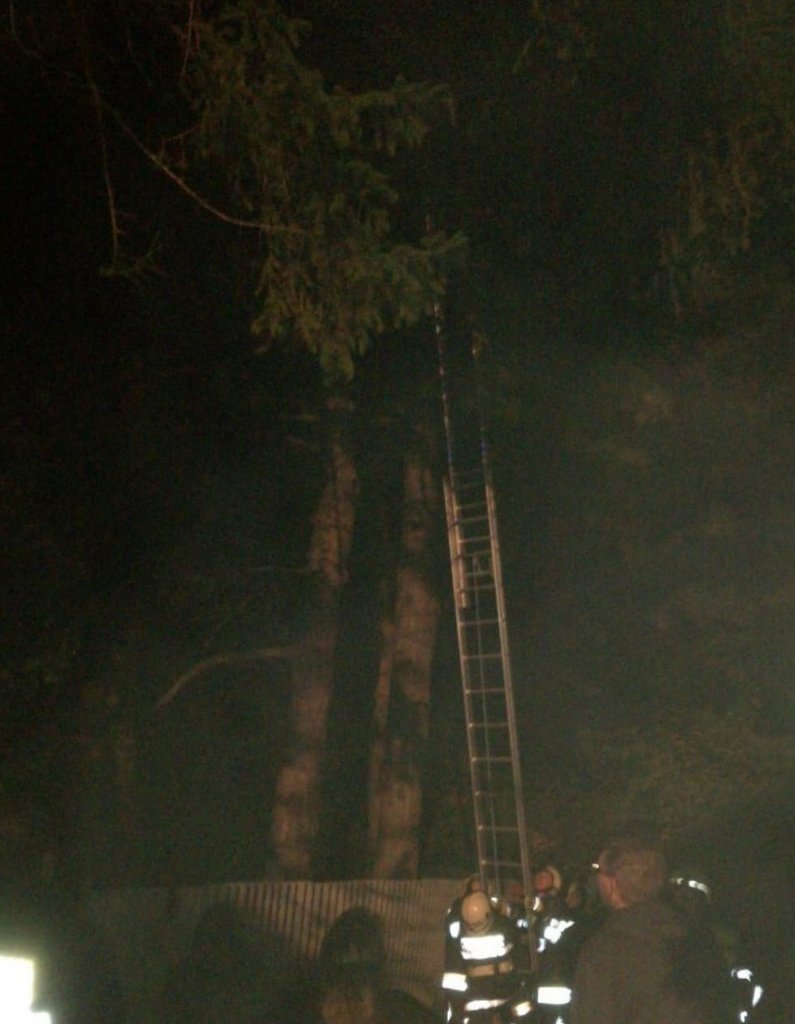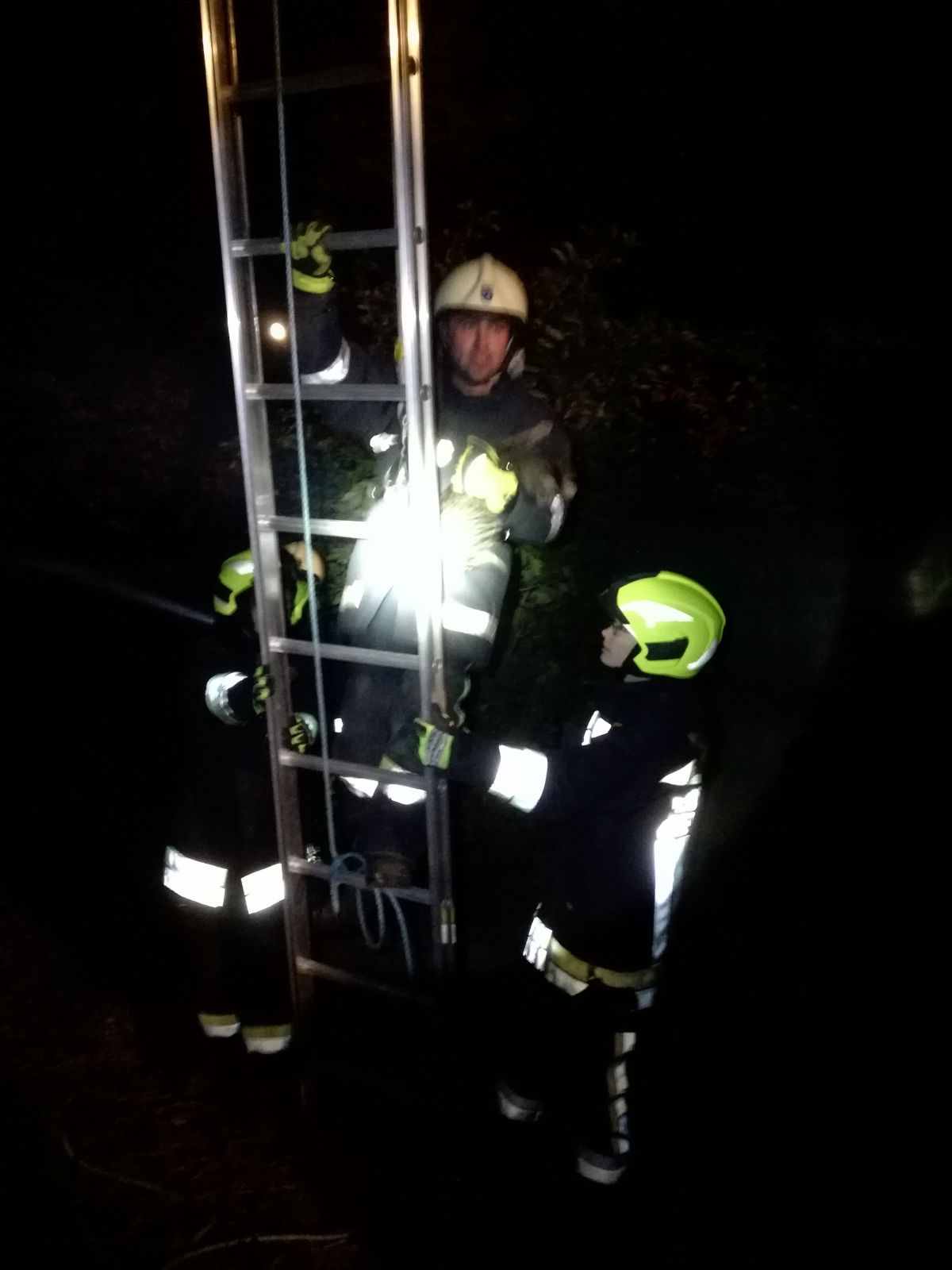 Mittels Schiebeleiter und „Leckerlis“ konnten die Feuerwehrmitglieder die Katze auf der rund 15 Meter hohen Föhre eingefangen.
