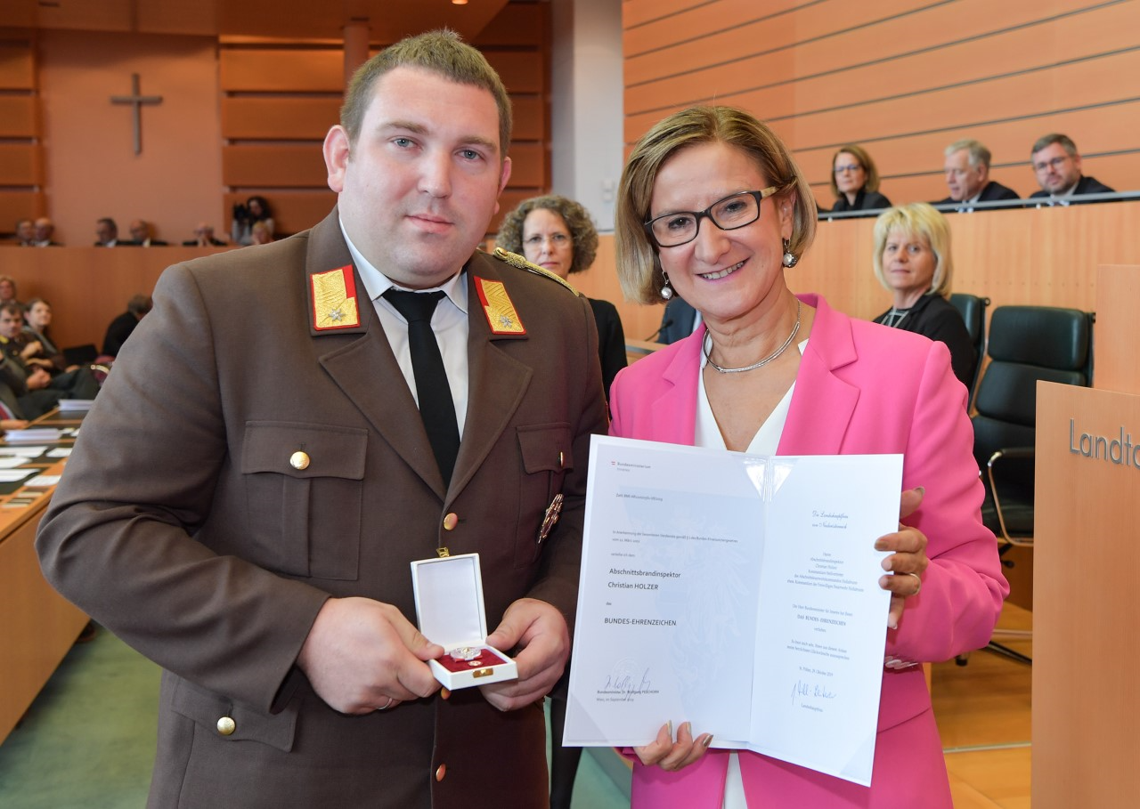 Abschnittsbrandinspektor Christian Holzer erhielt am 29. Oktober 2019 aus den Händen von Frau Landeshauptfrau Johanna Mikl-Leitner das Bundes-Ehrenzeichen für seine besonderen Verdienste im Feuerwehrwesen.