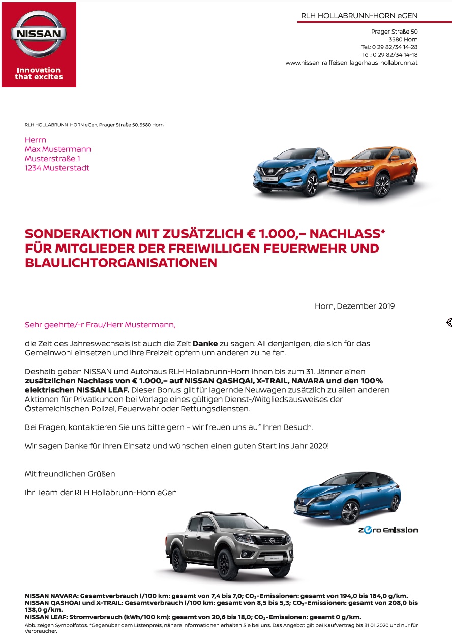Bei der Anschaffung eines Neuwagens, gibt es für Feuerwehrmitglieder einen großzügigen extra Rabatt von Euro 1000 – siehe anbei.