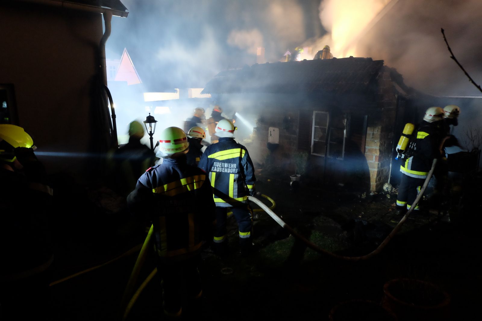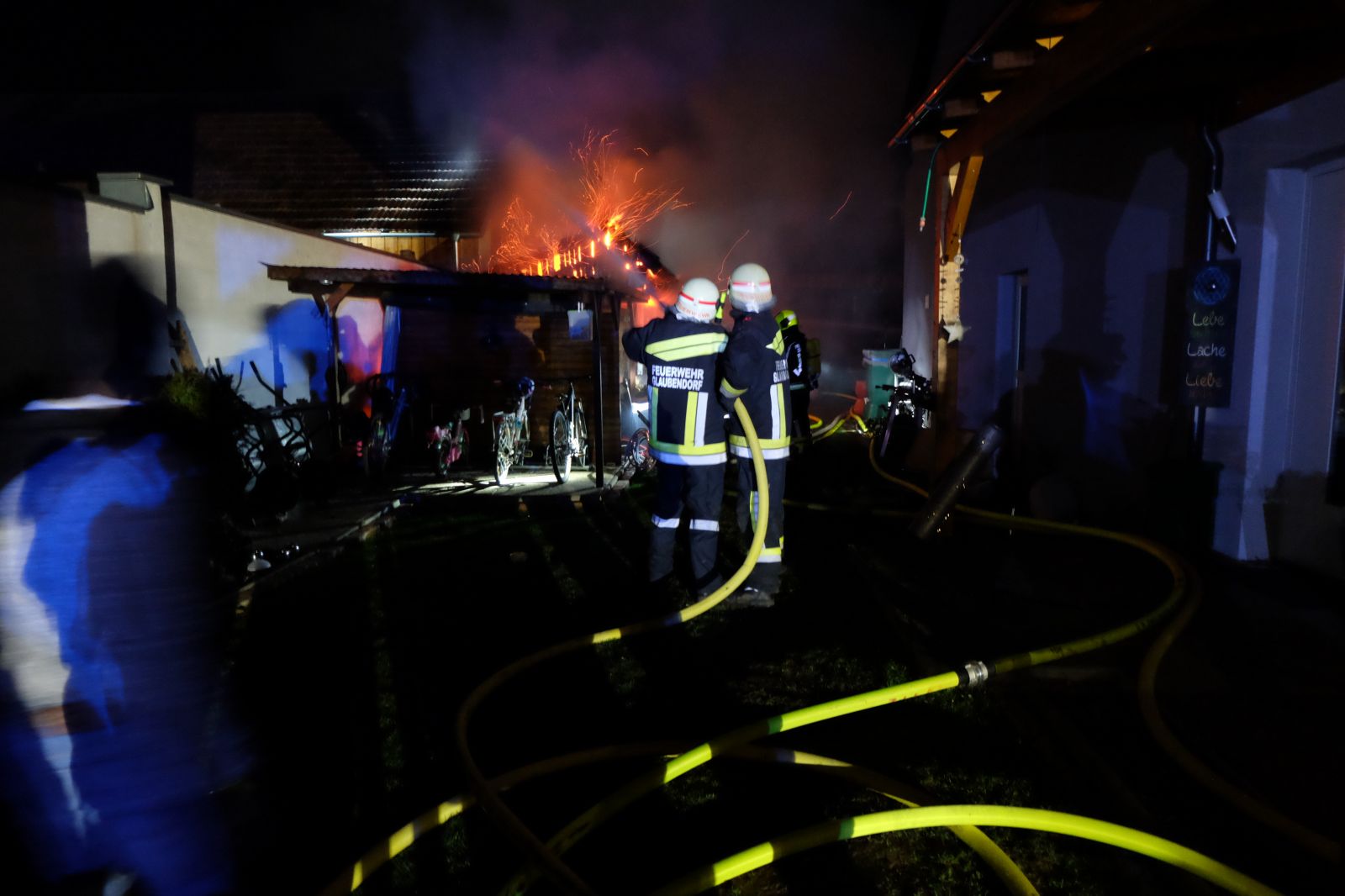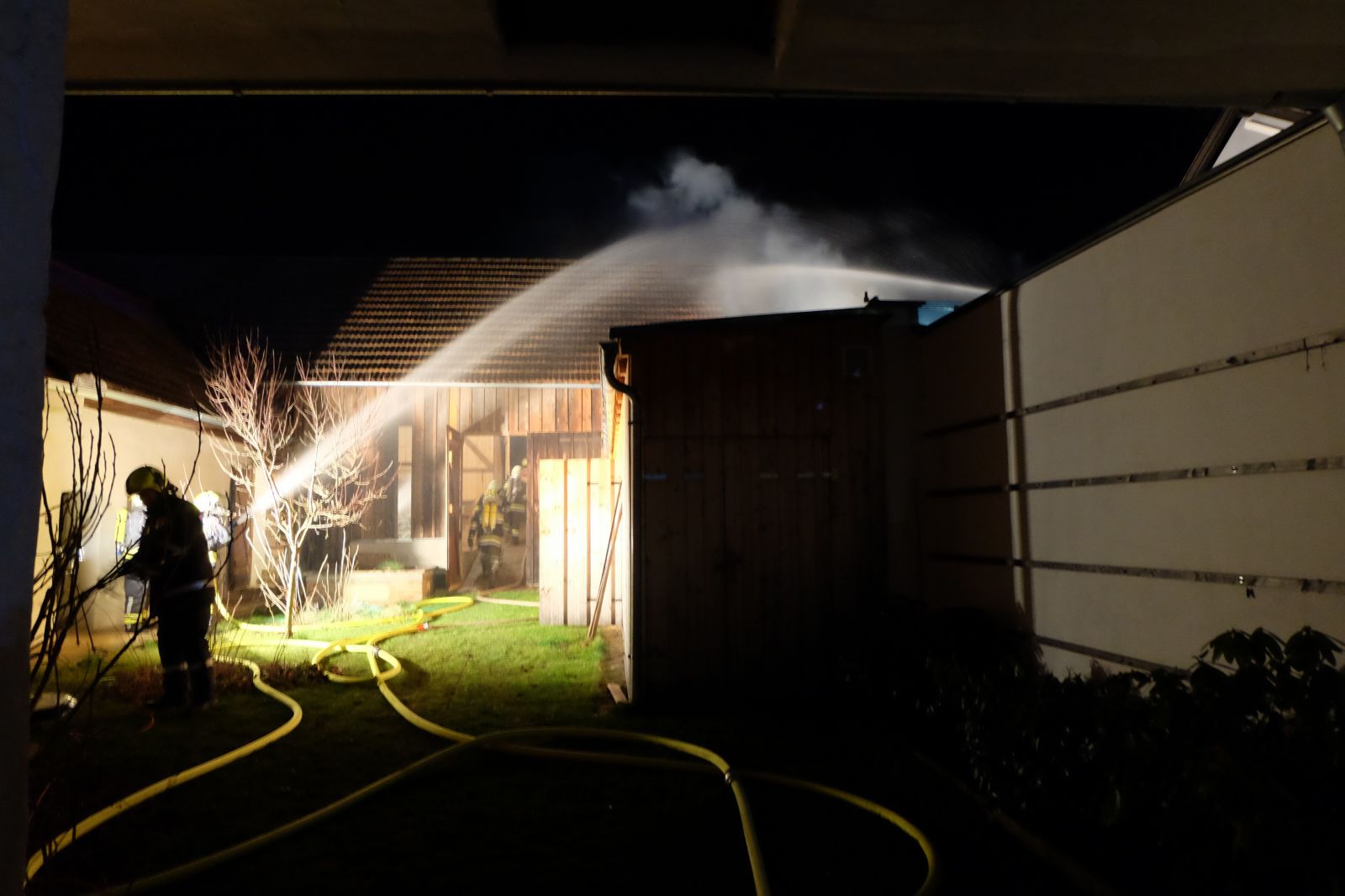 Bereits bei der Anfahrt war der Feuerschein über den Häusern deutlich erkennbar. Ein Schuppen, ein weiteres kleines Nebengebäude und ein Holzlager standen in Vollbrand. Unverzüglich wurden zwei Löschleitungen zur Brandbekämpfung eingesetzt und zeitgleich eine Löschleitung über die Einfahrt des Nachbars vorgetragen, um die direkt angrenzenden Nebengebäude zu schützen. Beim Innenangriff konnte der erste Atemschutztrupp aufgrund eines bereits erfolgten Teileinsturzes vorerst nicht ins Gebäudeinnere vordringen. Daraufhin wurde unter Atemschutz eine weitere Zugangsöffnung geschaffen und mit Hilfe von mehreren Atemschutztrupps konnte die Brandintensität letztendlich gebrochen werden.