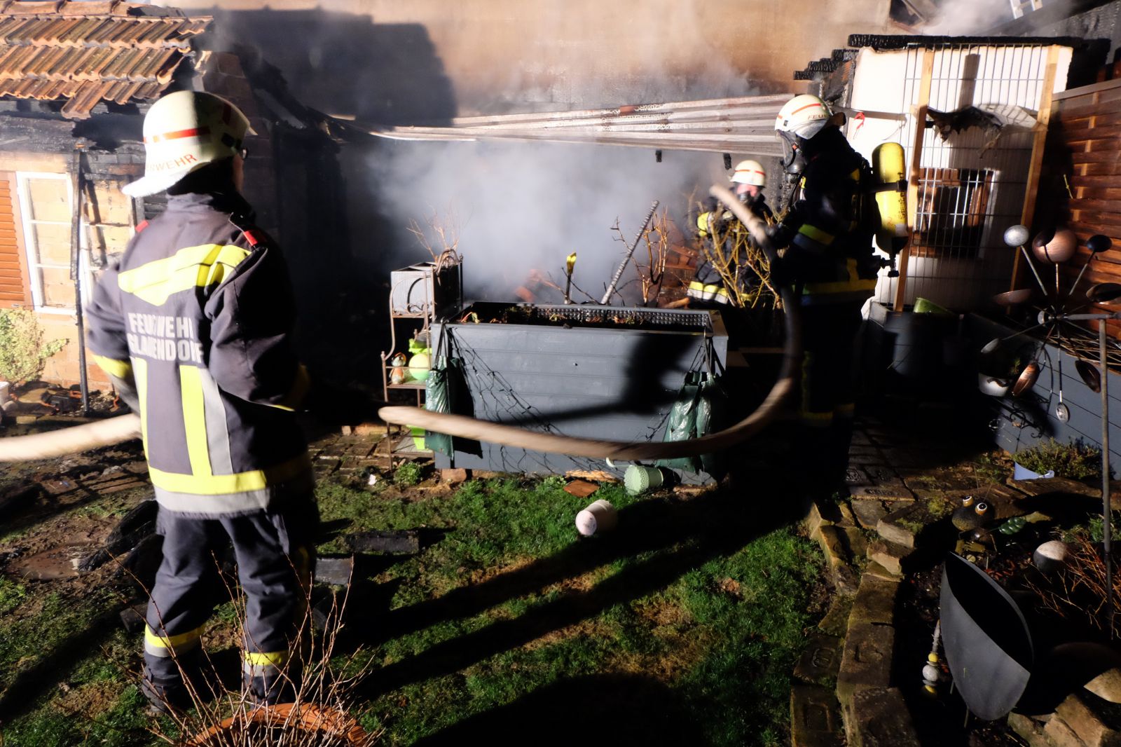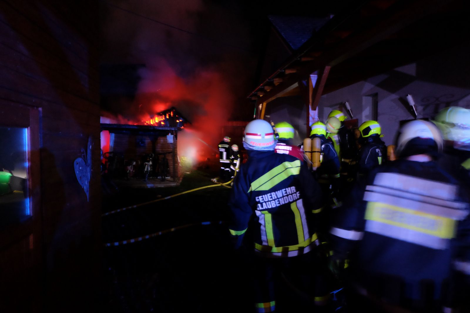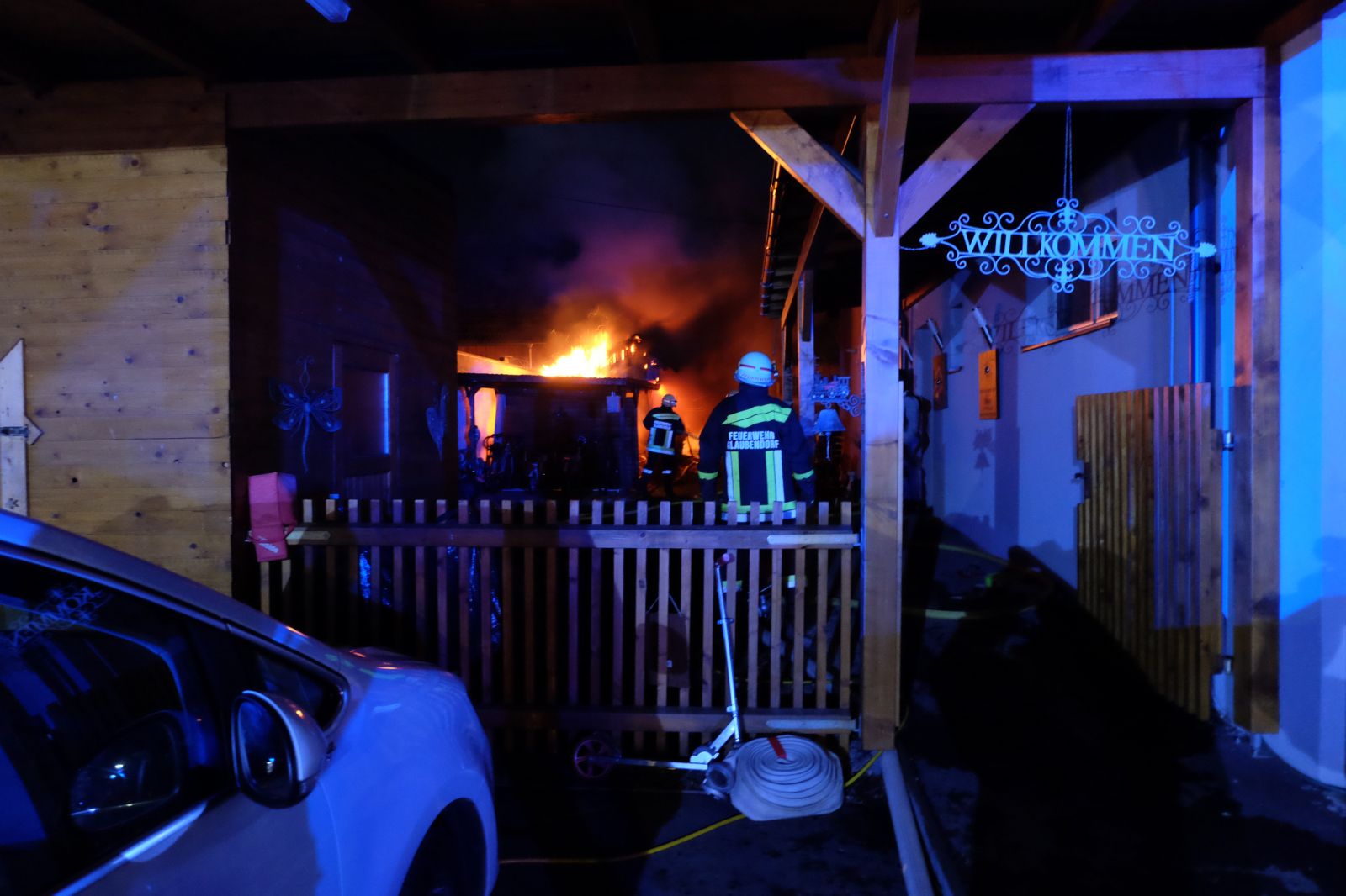 Bereits bei der Anfahrt war der Feuerschein über den Häusern deutlich erkennbar. Ein Schuppen, ein weiteres kleines Nebengebäude und ein Holzlager standen in Vollbrand. Unverzüglich wurden zwei Löschleitungen zur Brandbekämpfung eingesetzt und zeitgleich eine Löschleitung über die Einfahrt des Nachbars vorgetragen, um die direkt angrenzenden Nebengebäude zu schützen. Beim Innenangriff konnte der erste Atemschutztrupp aufgrund eines bereits erfolgten Teileinsturzes vorerst nicht ins Gebäudeinnere vordringen. Daraufhin wurde unter Atemschutz eine weitere Zugangsöffnung geschaffen und mit Hilfe von mehreren Atemschutztrupps konnte die Brandintensität letztendlich gebrochen werden.