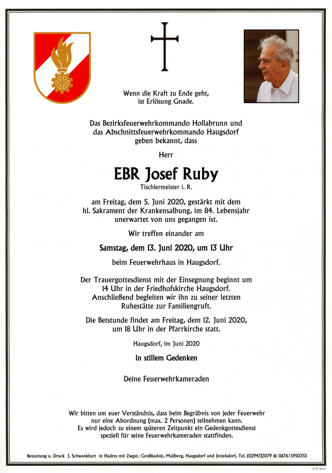 Tief bestürzt erfüllen wir die traurige Pflicht, über das Ableben unseres Kameraden Ehrenbrandrat Josef Ruby zu informieren.
