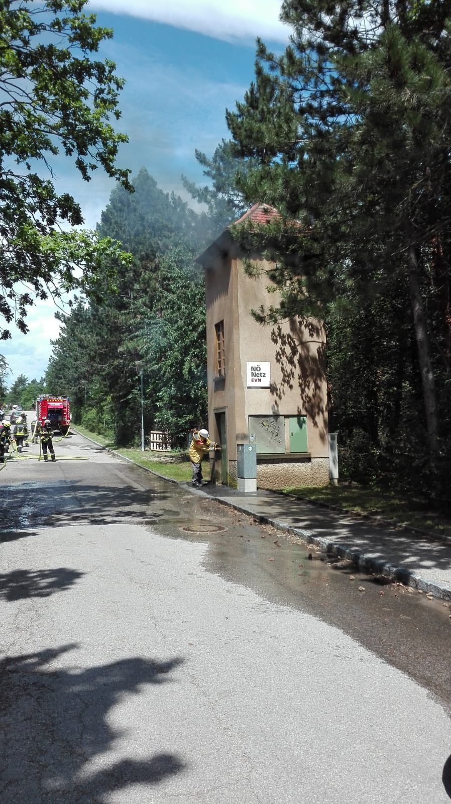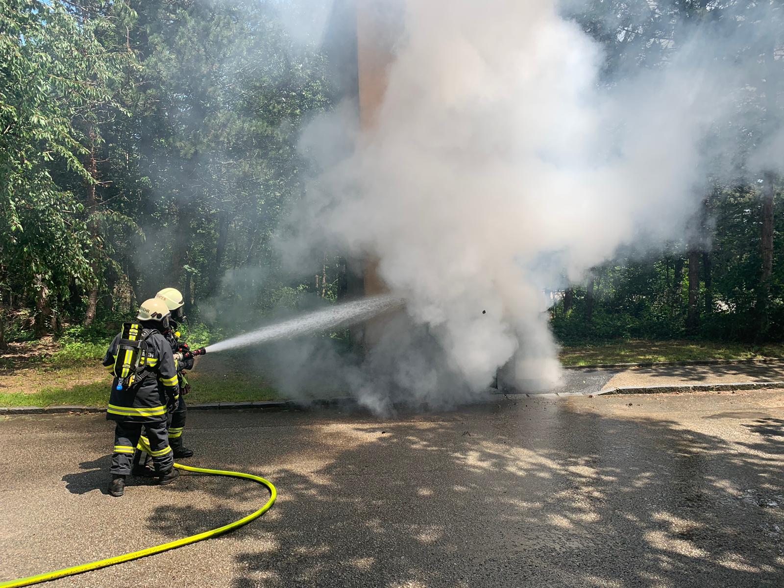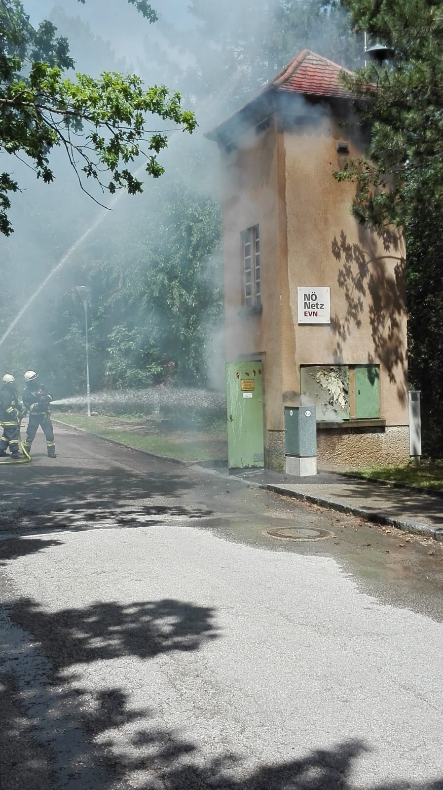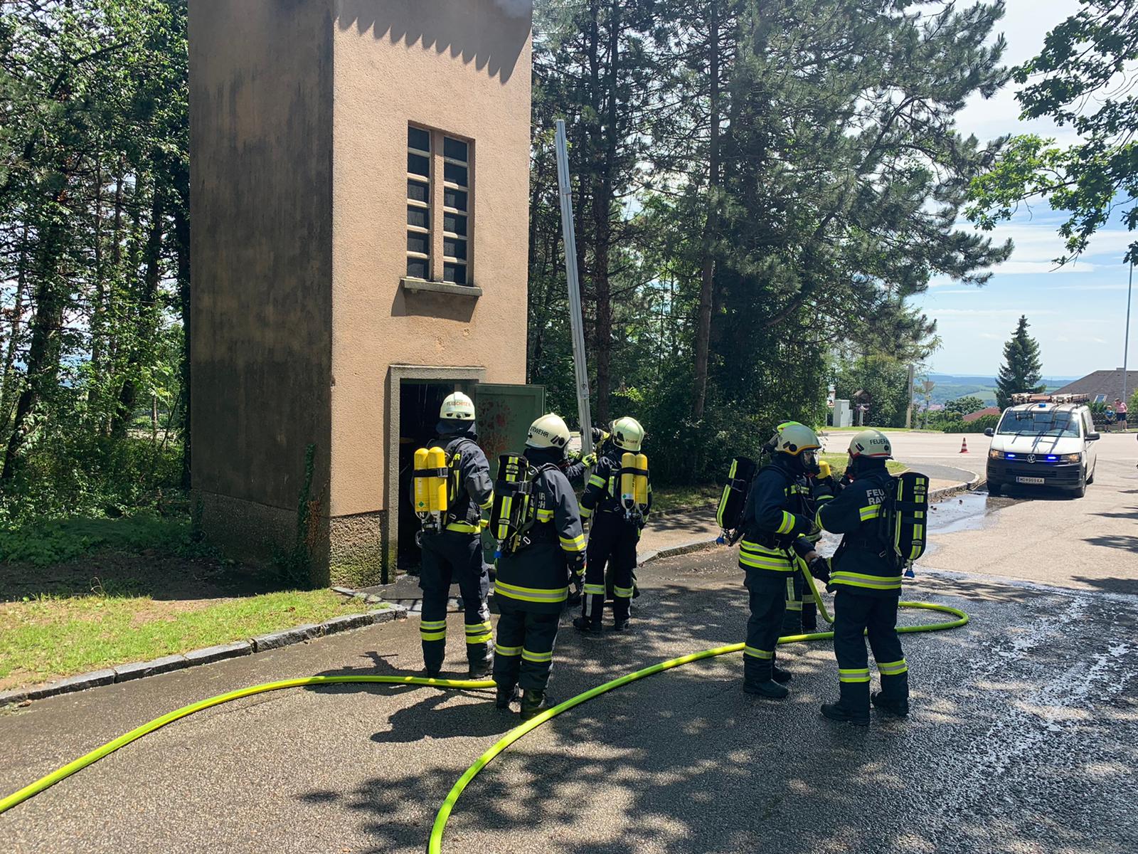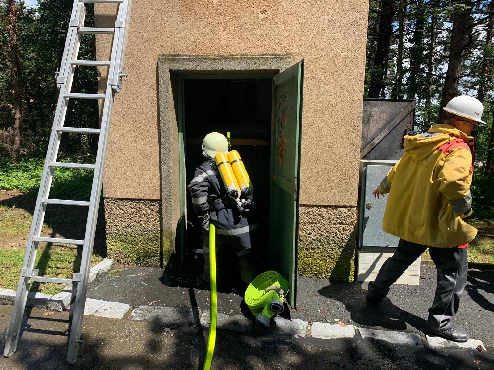 Bei der Ankunft hat es im Inneren des Transformatorgebäudes bereits gebrannt. Wir haben das Gebäude von außen mit zwei Rohren geschützt, um eine Ausbreitung des Feuers zu verhindern. Nach Absprache mit der EVN wurde der Strom abgeschaltet, die Tür aufgemacht und der Brand im Inneren gelöscht.