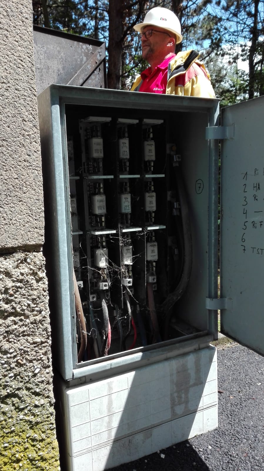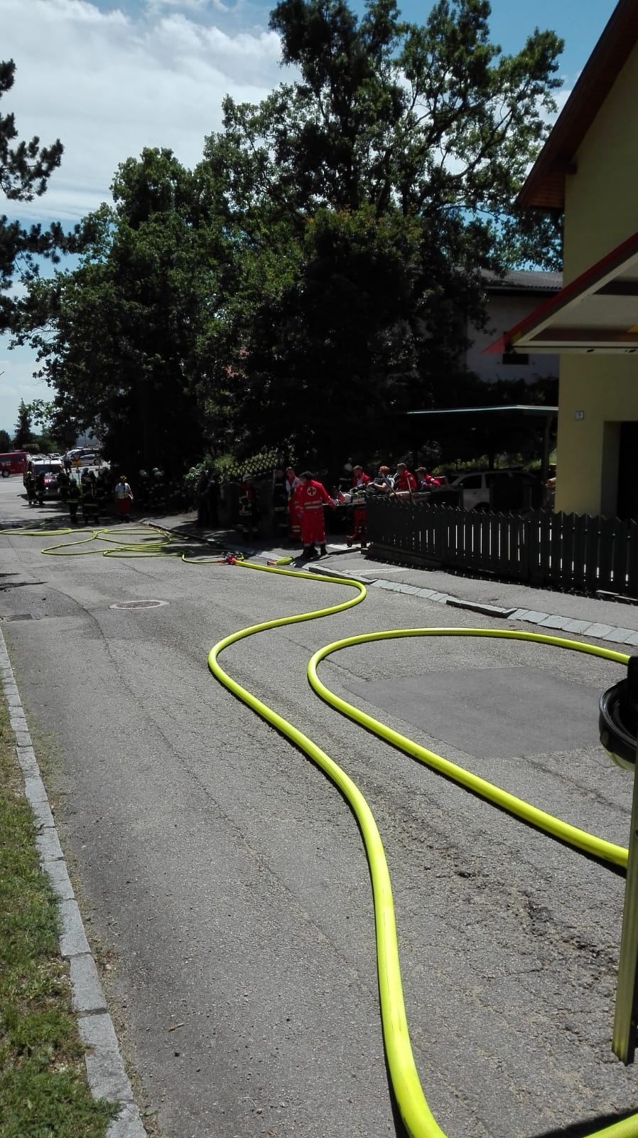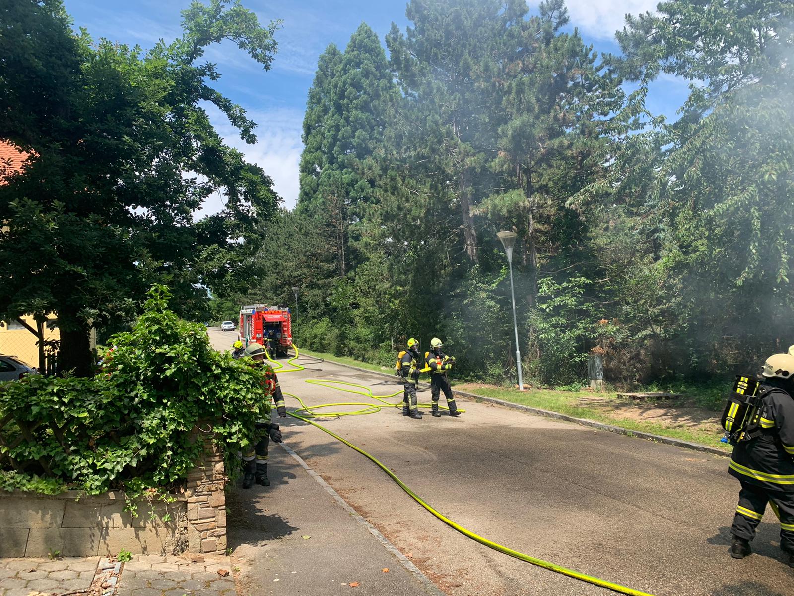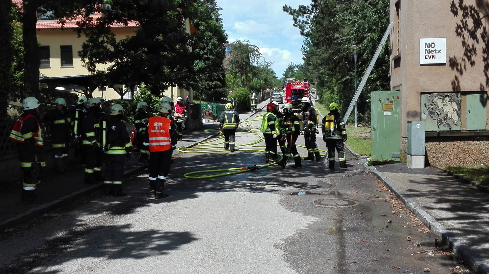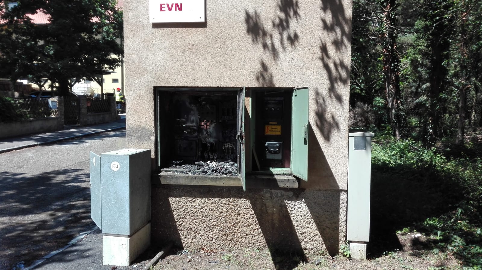Bei der Ankunft hat es im Inneren des Transformatorgebäudes bereits gebrannt. Wir haben das Gebäude von außen mit zwei Rohren geschützt, um eine Ausbreitung des Feuers zu verhindern. Nach Absprache mit der EVN wurde der Strom abgeschaltet, die Tür aufgemacht und der Brand im Inneren gelöscht.