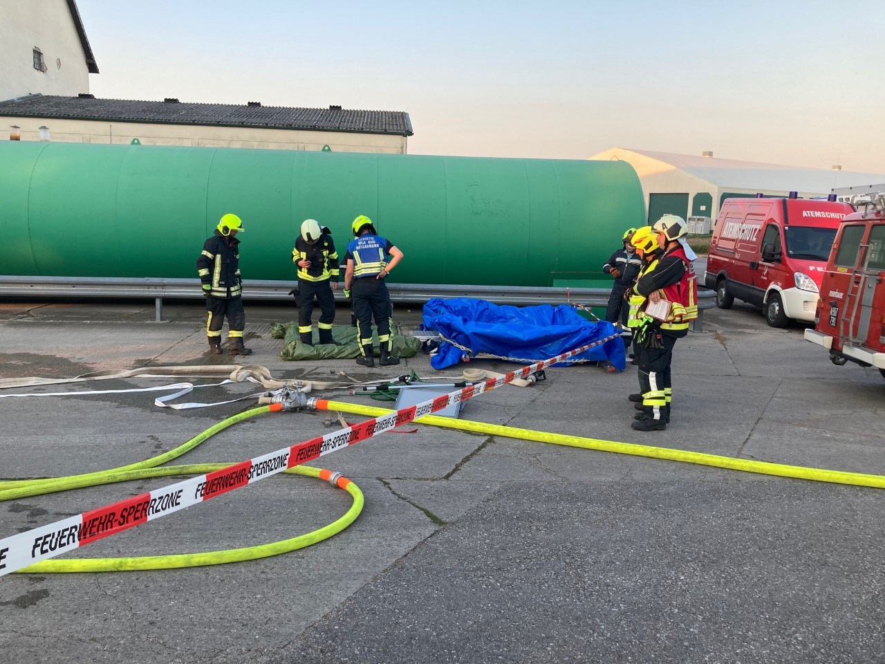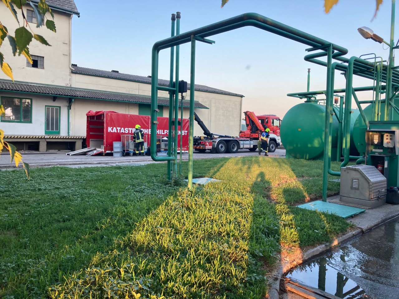 Die Schutzanzugträger dichteten das Leck in der Leitung ab und stellten Auffangbehälter bereit.