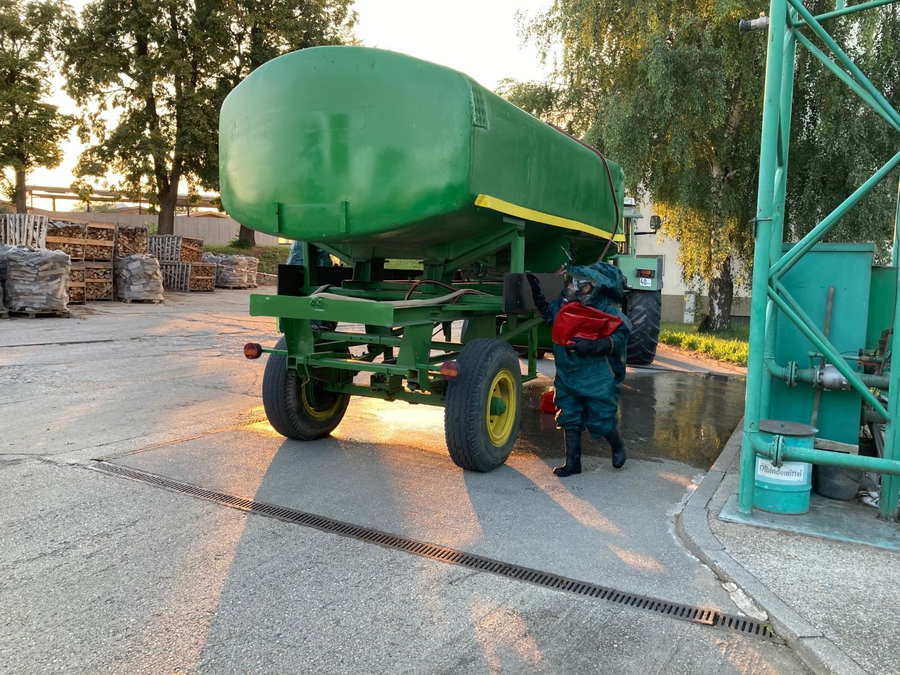 Am Freitag, den 07. August trafen sich die Mitglieder der Schadstoffgruppe bei hochsommerlichen Temperaturen zu einer praktischen Übung. Übungsannahme war ein Austritt von Chlorwasserstoffsäure aus einem Tankanhänger. Nach der Erkundung durch den Einsatzleiter und der Feststellung des Schadstoffes sowie der Information aller notwendigen Behörden wurden weitläufige Absperrungen in doppelter Ausführung getätigt und ein Brandschutz aufgebaut. Gleichzeitig rüstete sich ein Schutzanzugtrupp aus und der Dekontaminationsplatz zur Reinigung der Anzugträger wurde aufgebaut.