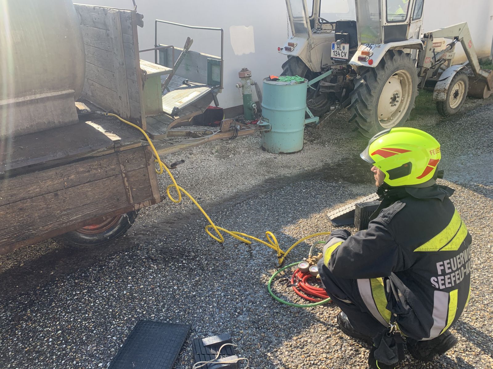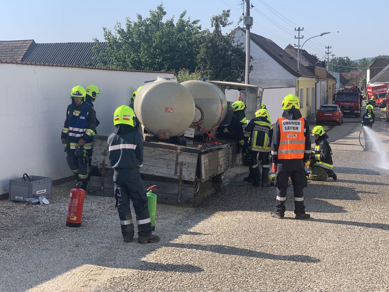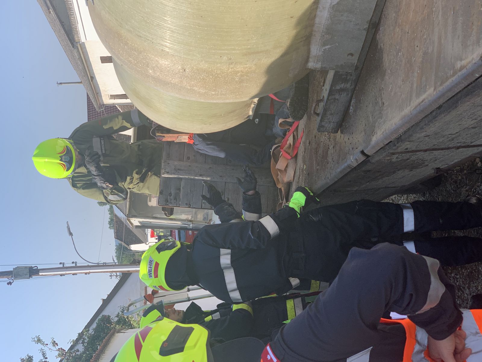 Begonnen hat der Übungstag um 08:30 mit einem kleinen Frühstück und der Einweisung in den Tagesablauf. Um 09:00 wurde zur ersten Übung des heutigen Tages alarmiert: „T2 Person in Notlage, Austritt einer unbekannten Flüssigkeit“. Übungsannahme war, dass bei einem Transport von einer brennbaren Flüssigkeit ein Tank Leck geschlagen hat. Bei der Nachschau wurde eine Person eingeklemmt und konnte sich nicht mehr selbst befreien. Nach der Lageerkundung durch den Übungs-Einsatzleiter bekam die Mannschaft die Befehle – ein Brandschutz wurde aufgebaut, der Austritt der Flüssigkeit wurde unterbunden und die Person konnte mittels Hebekissen aus der Notlage befreit werden. Da viele Tätigkeiten auf engem Raum durchgeführt werden mussten, war eine gute Koordination und Kommunikation nötig. Bei der direkt anschließenden Übungsnachbesprechung wurden Verbesserungsvorschläge, wie z.B. die Wahl des Aufstellungsortes der Einsatzfahrzeuge, sowie die Optimierung des Eigenschutzes unserer Einsatzkräfte von allen Übungsteilnehmern besprochen.