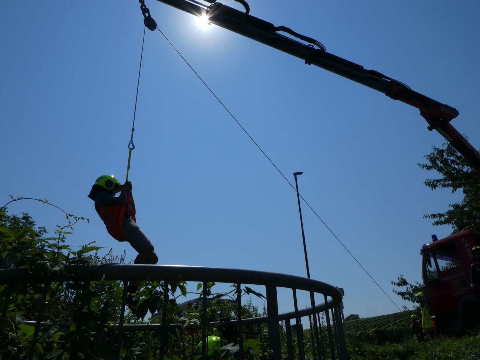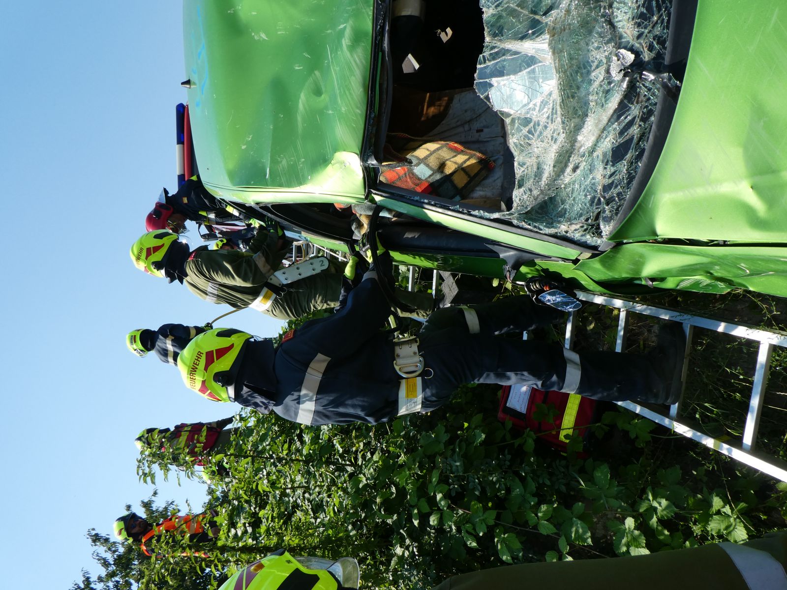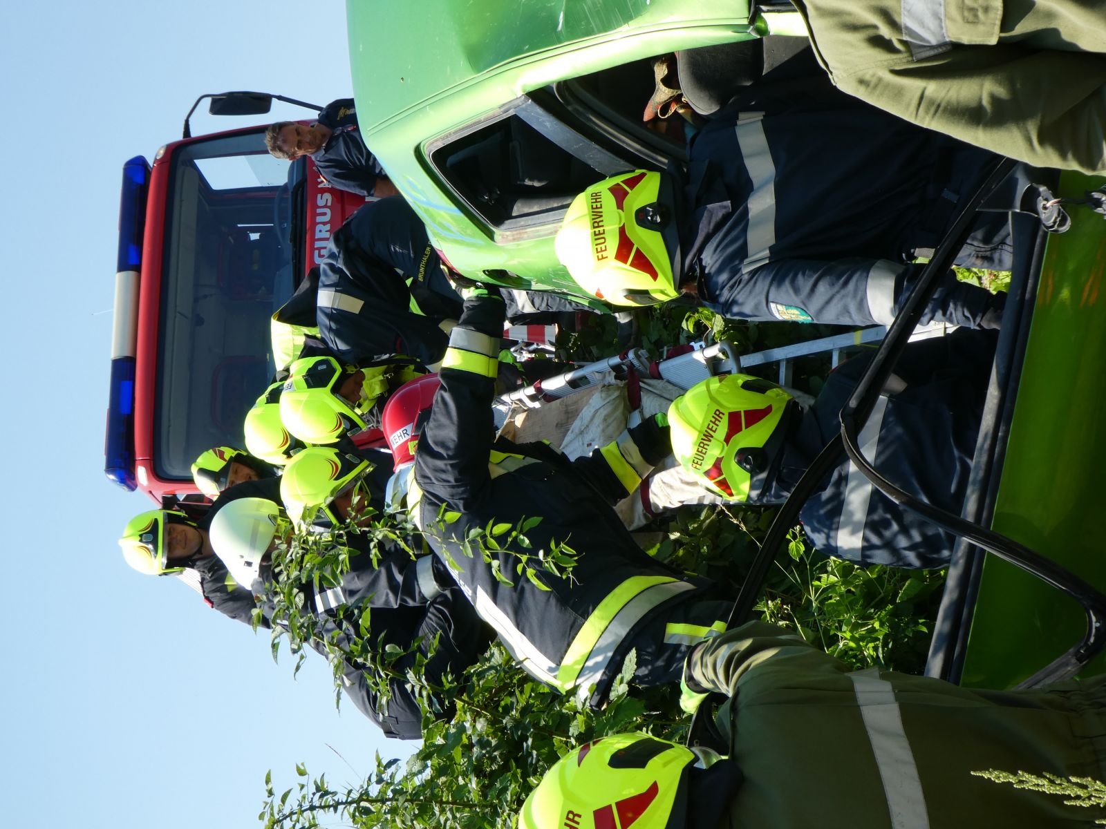 Begonnen hat der Übungstag um 08:30 mit einem kleinen Frühstück und der Einweisung in den Tagesablauf. Um 09:00 wurde zur ersten Übung des heutigen Tages alarmiert: „T2 Person in Notlage, Austritt einer unbekannten Flüssigkeit“. Übungsannahme war, dass bei einem Transport von einer brennbaren Flüssigkeit ein Tank Leck geschlagen hat. Bei der Nachschau wurde eine Person eingeklemmt und konnte sich nicht mehr selbst befreien. Nach der Lageerkundung durch den Übungs-Einsatzleiter bekam die Mannschaft die Befehle – ein Brandschutz wurde aufgebaut, der Austritt der Flüssigkeit wurde unterbunden und die Person konnte mittels Hebekissen aus der Notlage befreit werden. Da viele Tätigkeiten auf engem Raum durchgeführt werden mussten, war eine gute Koordination und Kommunikation nötig. Bei der direkt anschließenden Übungsnachbesprechung wurden Verbesserungsvorschläge, wie z.B. die Wahl des Aufstellungsortes der Einsatzfahrzeuge, sowie die Optimierung des Eigenschutzes unserer Einsatzkräfte von allen Übungsteilnehmern besprochen.