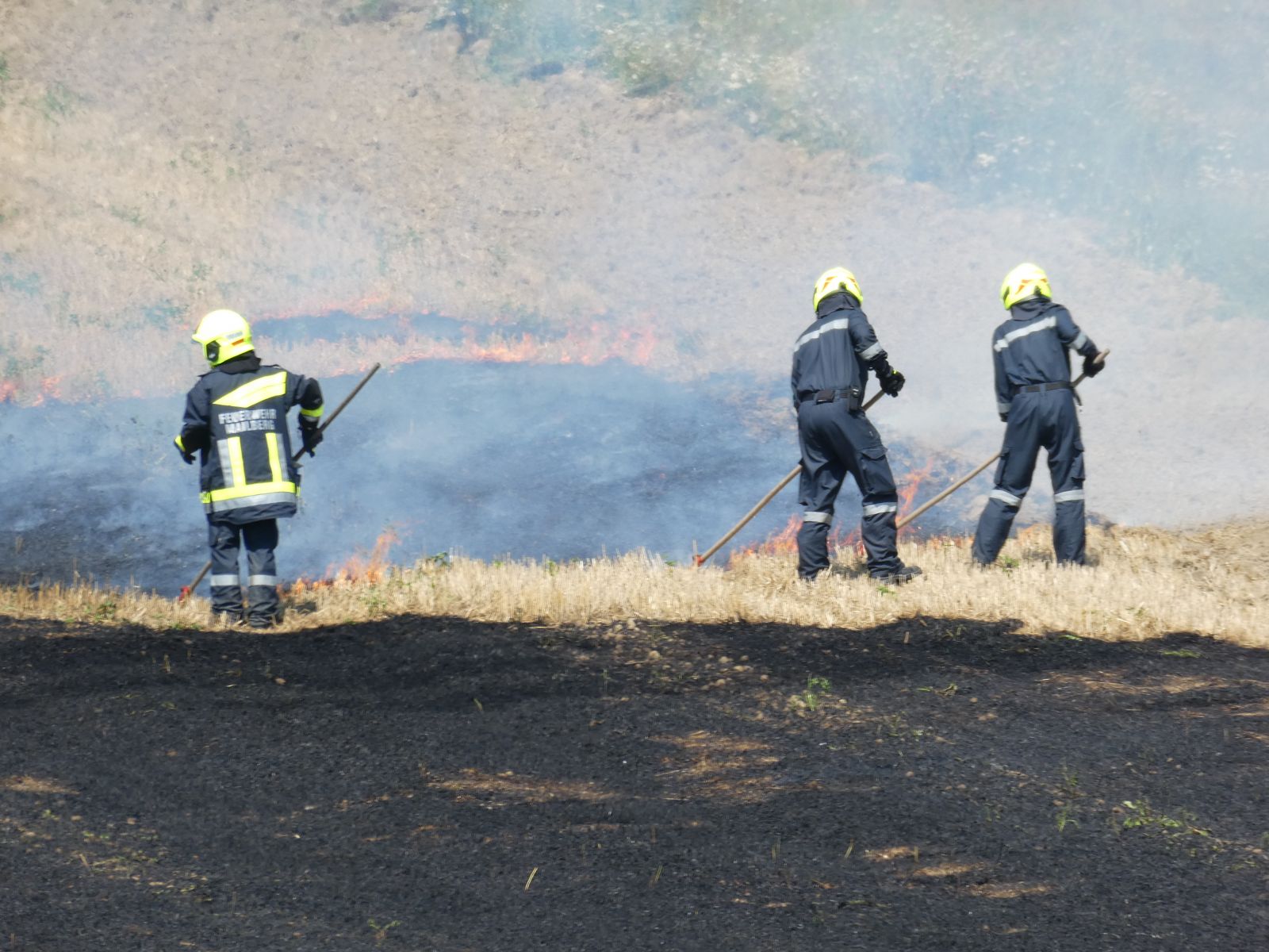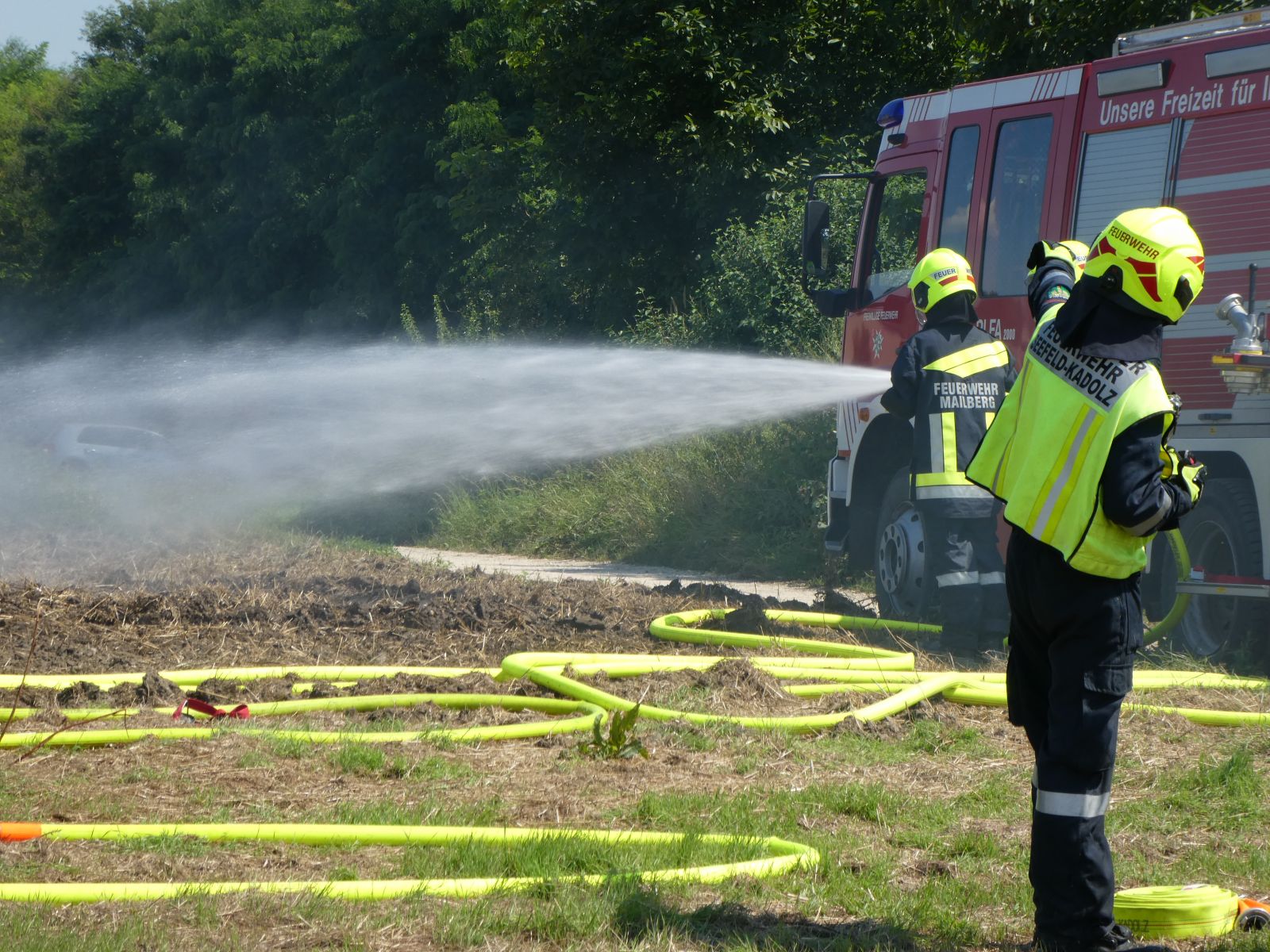 Im Anschluss an die verdiente Mittagspause erfolgte eine kurzer Theorieteil, in dem die unterschiedliche Beladung und Besonderheiten der Fahrzeuge der beiden Feuerwehren besprochen wurden. Bei bereits über 30 Grad wurde um ca. 13:30 zur dritten und letzten Übung alarmiert – ein Flurbrand in Seefeld. Auf einem für die Übung vorbereiteten und abgemähtem Feld konnte die taktische Vorgehensweise, sowie der praktische Einsatz verschiedener Löschmittel und -Geräte realitätsnah beübt werden.
