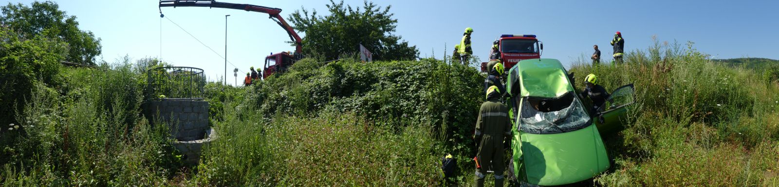 Nach einer kurzen Pause im FF Haus Seefeld-Kadolz erfolgte die Alarmierung zur zweiten Übung, welche in Mailberg abgehalten wurde. Übungsannahme war ein Verkehrsunfall mit einer eingeklemmten Person beim Auffangbecken in Mailberg und zwei vermissten Personen. Durch den Übungs-Einsatzleiter wurde bei der Lageerkundung festgestellt, dass sich die vermissten Personen in einem nahe gelegen Brunnen aufhalten und gerettet werden müssen. In weiterer Folge wurde das verunfallte Fahrzeug mittels Seilwinde vom TLF Seefeld-Kadolz gesichert und die Menschenrettung mit hydraulischem Rettungsgerät von den Mitgliedern beider Feuerwehren durchgeführt. Die Rettung der beiden vermissten Personen erfolgte mittels Seilzugs und Notrettungsset, als Anschlagpunkt diente der Kran des LAST Seefeld-Kadolz. Besonders beim Arbeiten auf Böschungen mit schwerem Gerät machten sich die bereits hochsommerlichen Temperaturen bemerkbar – jeder „kam ins Schwitzen“.