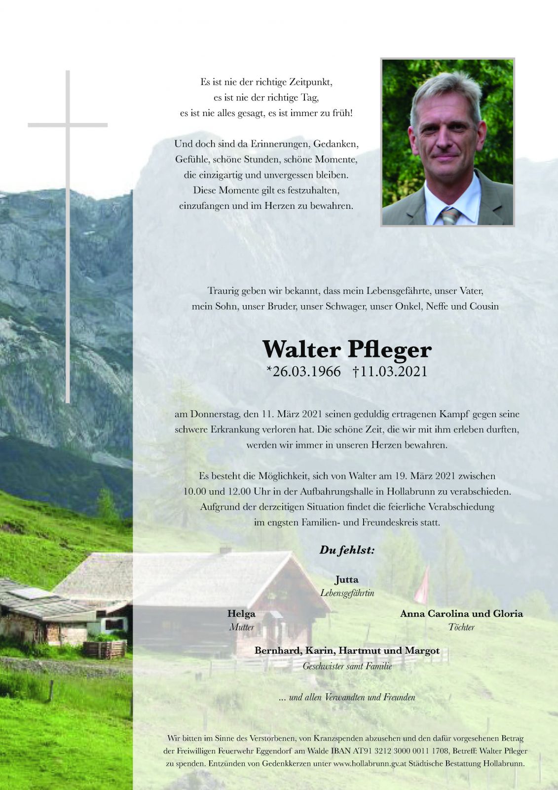 Die Feuerwehr Eggendorf am Walde und das Bezirksfeuerwehrkommando Hollabrunn erfüllen die traurige Pflicht, Nachricht vom Ableben unseres Feuerwehrkameraden BM Walter Pfleger zu geben.