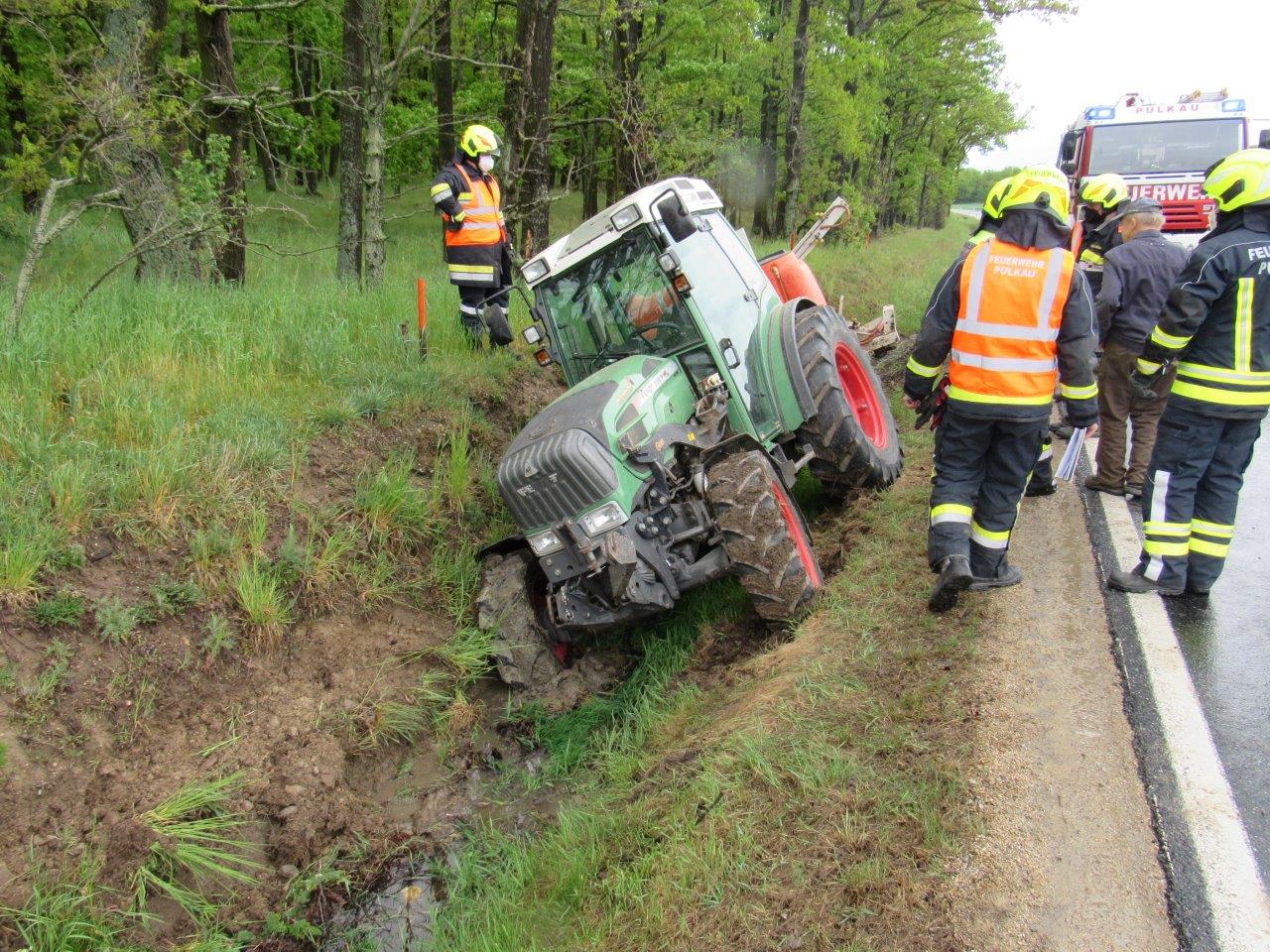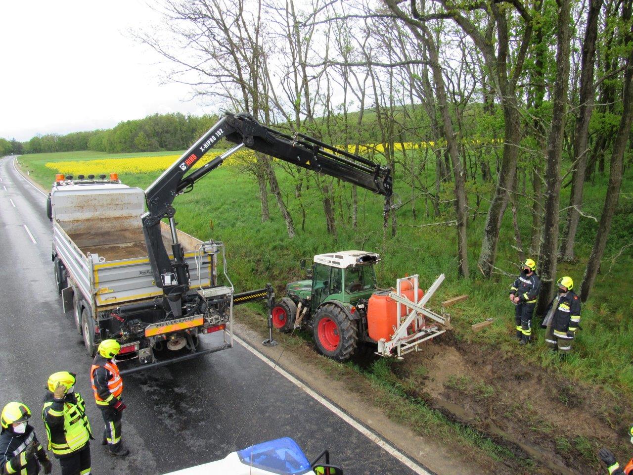 Ein Traktor war von der Straße abgekommen und im Straßengraben in Schräglag zum Stehen gekommen.
