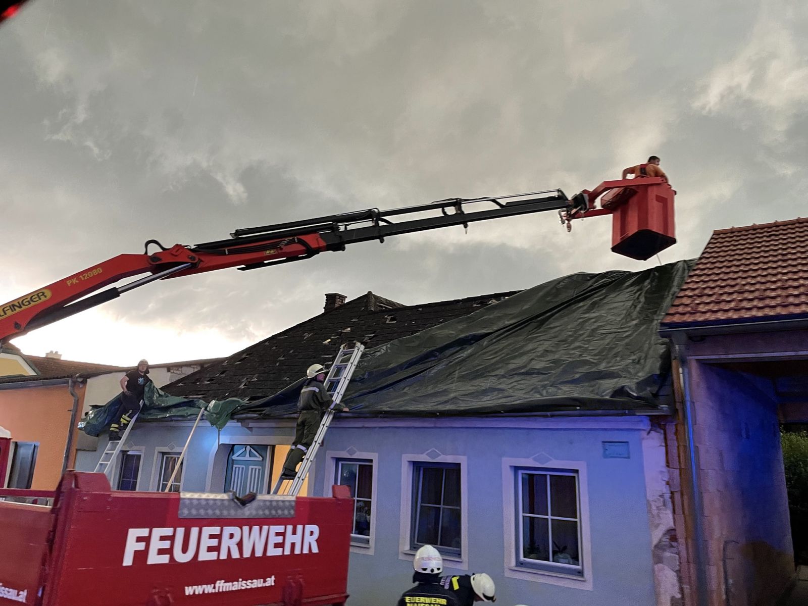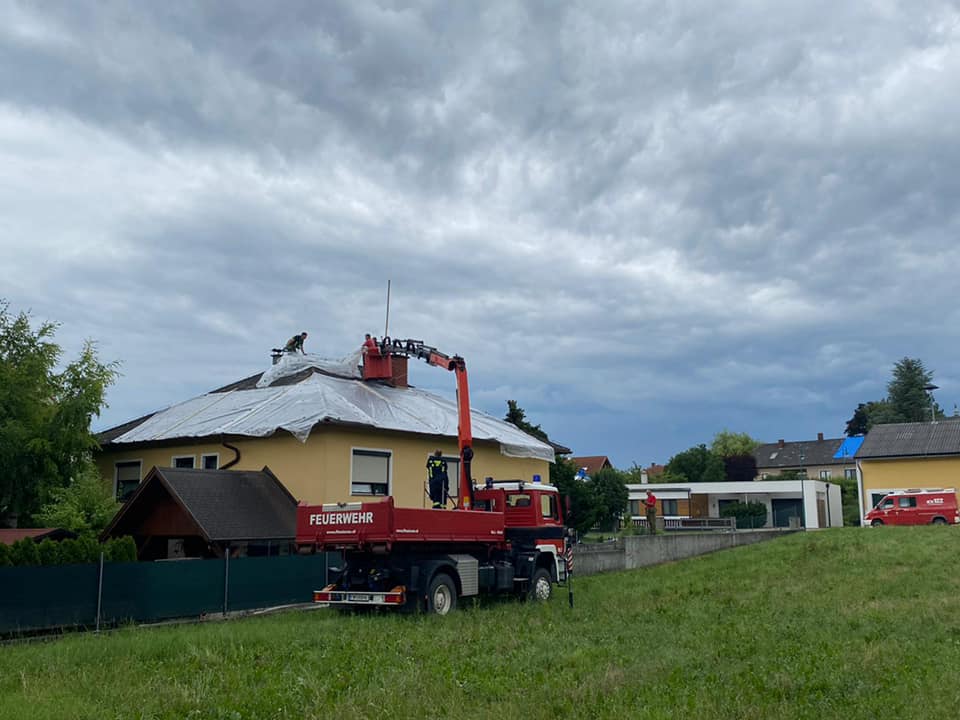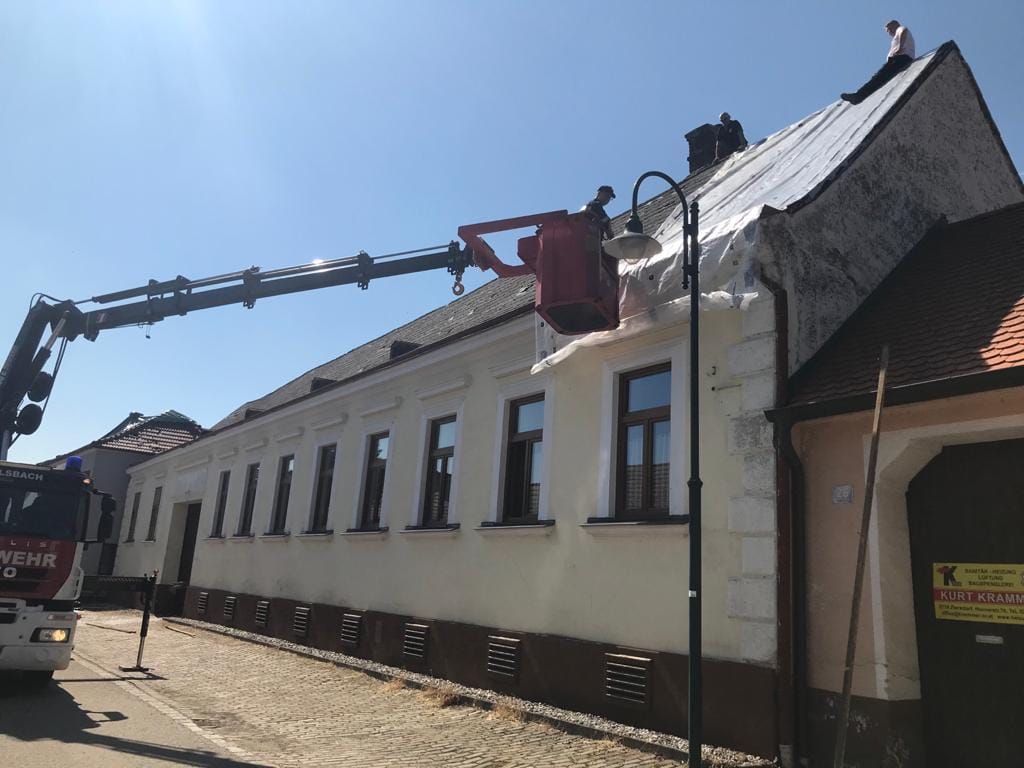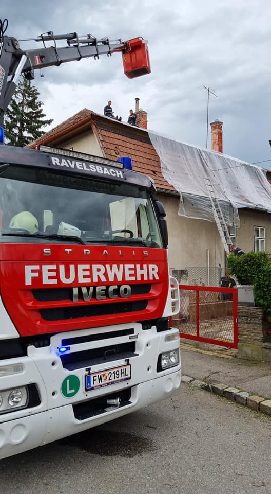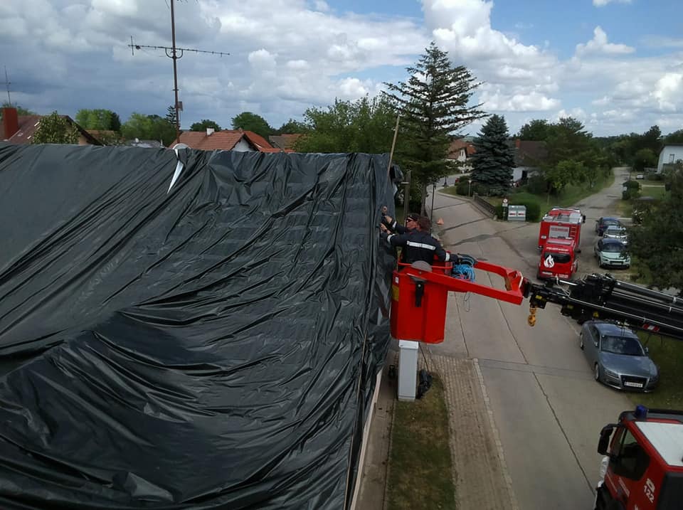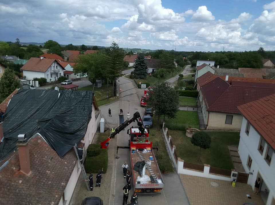 Feuerwehrkommandant Werner Trauner bereitete den eigenen Garten gerade noch rechtzeitig auf das Unwetter vor, als es kurz danach mit dem schweren Hagelschlag los ging. „Schon wenige Minuten nach dem Hagel ging auch die Sirene zweimal los und wir rückten zu den ersten Einsatzstellen aus. Im Minuten-Takt bekamen wir von der Bereichsalarmzentrale Hollabrunn weitere Einsätze übermittelt. Deshalb errichteten wir rasch eine Einsatzleitung im Feuerwehrhaus. Wir alarmierten in weiterer Folge drei Wechsellader und einen Hubsteiger, in Summe 9 Feuerwehren alleine am Donnerstagabend. Hauptsächlich handelte es sich um kaputte Dächer. Über verschiedene Kontakte holten wir noch in der ersten Nacht Planen aus drei verschiedenen Baumärkten der Umgebung. Um 02:00 morgens brach ich den Einsatz ab, da die Kombination von Dunkelheit, Höhe und Müdigkeit einfach zu gefährlich war. Der gesamte Schaden war uns am Donnerstagabend noch nicht bewusst. Am Freitag ging es nach einer ersten Erkundung weiter und es kam eine Schadensstelle nach der anderen hinzu. Oft war es so, dass die Hausbesitzer die Schäden eigentlich mit entsprechenden Firmen beheben wollten, aber natürlich konnten die Dachdecker der Umgebung dies nicht überall zeitnahe umsetzen und so wandten sich von Stunde zu Stunde immer mehr beunruhigte Hausbesitzer an die Feuerwehr. Mein Einsatzauftrag an die einzelnen Feuerwehren war die Dächer provisorisch abzusichern und zur Umsetzung den jeweils raschesten Ansatz zu wählen. Wir reparierten aber keine Nebengebäude, Scheunen oder Maschinenhallen, nur Dächer wo durch den angekündigten Regen und Sturm eine Gefahr bestand. Besonders beindruckt war ich vor allem von der Hilfsbereitschaft der ortsfremden Feuerwehrmitglieder. Ich möchte ihnen im Namen der Ortsbevölkerung von Hohenwarth meinen Dank ausdrücken.“
