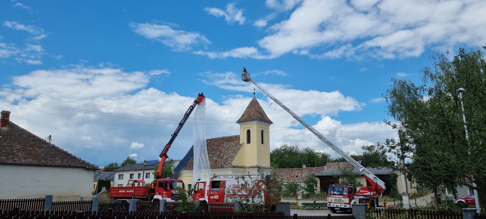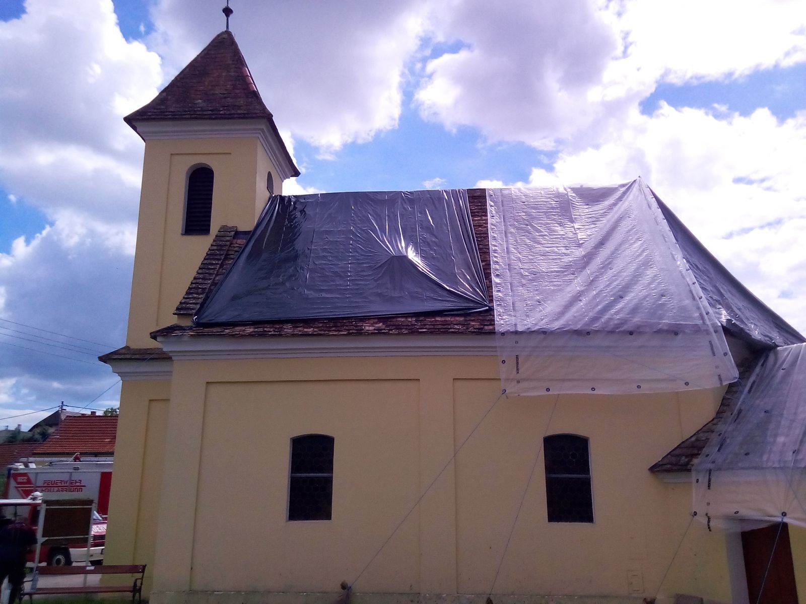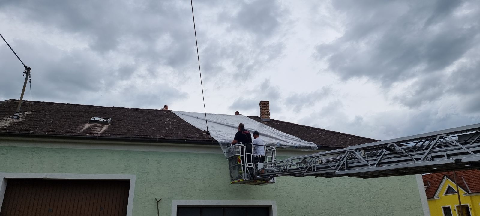 Feuerwehrkommandant Werner Trauner bereitete den eigenen Garten gerade noch rechtzeitig auf das Unwetter vor, als es kurz danach mit dem schweren Hagelschlag los ging. „Schon wenige Minuten nach dem Hagel ging auch die Sirene zweimal los und wir rückten zu den ersten Einsatzstellen aus. Im Minuten-Takt bekamen wir von der Bereichsalarmzentrale Hollabrunn weitere Einsätze übermittelt. Deshalb errichteten wir rasch eine Einsatzleitung im Feuerwehrhaus. Wir alarmierten in weiterer Folge drei Wechsellader und einen Hubsteiger, in Summe 9 Feuerwehren alleine am Donnerstagabend. Hauptsächlich handelte es sich um kaputte Dächer. Über verschiedene Kontakte holten wir noch in der ersten Nacht Planen aus drei verschiedenen Baumärkten der Umgebung. Um 02:00 morgens brach ich den Einsatz ab, da die Kombination von Dunkelheit, Höhe und Müdigkeit einfach zu gefährlich war. Der gesamte Schaden war uns am Donnerstagabend noch nicht bewusst. Am Freitag ging es nach einer ersten Erkundung weiter und es kam eine Schadensstelle nach der anderen hinzu. Oft war es so, dass die Hausbesitzer die Schäden eigentlich mit entsprechenden Firmen beheben wollten, aber natürlich konnten die Dachdecker der Umgebung dies nicht überall zeitnahe umsetzen und so wandten sich von Stunde zu Stunde immer mehr beunruhigte Hausbesitzer an die Feuerwehr. Mein Einsatzauftrag an die einzelnen Feuerwehren war die Dächer provisorisch abzusichern und zur Umsetzung den jeweils raschesten Ansatz zu wählen. Wir reparierten aber keine Nebengebäude, Scheunen oder Maschinenhallen, nur Dächer wo durch den angekündigten Regen und Sturm eine Gefahr bestand. Besonders beindruckt war ich vor allem von der Hilfsbereitschaft der ortsfremden Feuerwehrmitglieder. Ich möchte ihnen im Namen der Ortsbevölkerung von Hohenwarth meinen Dank ausdrücken.“
