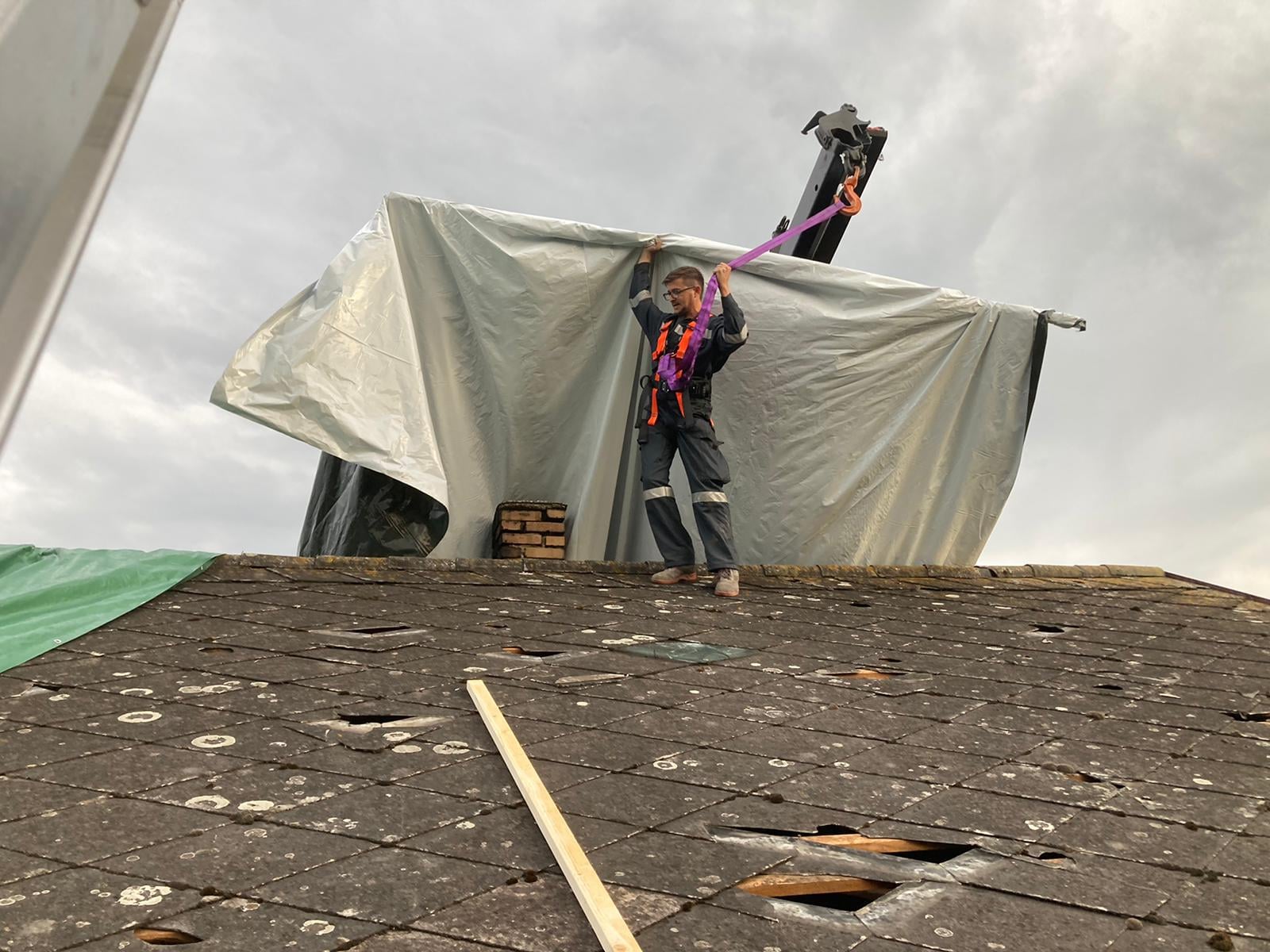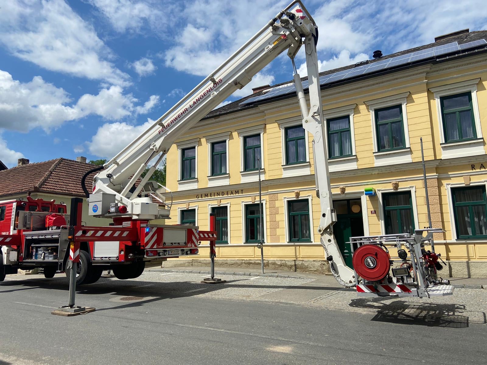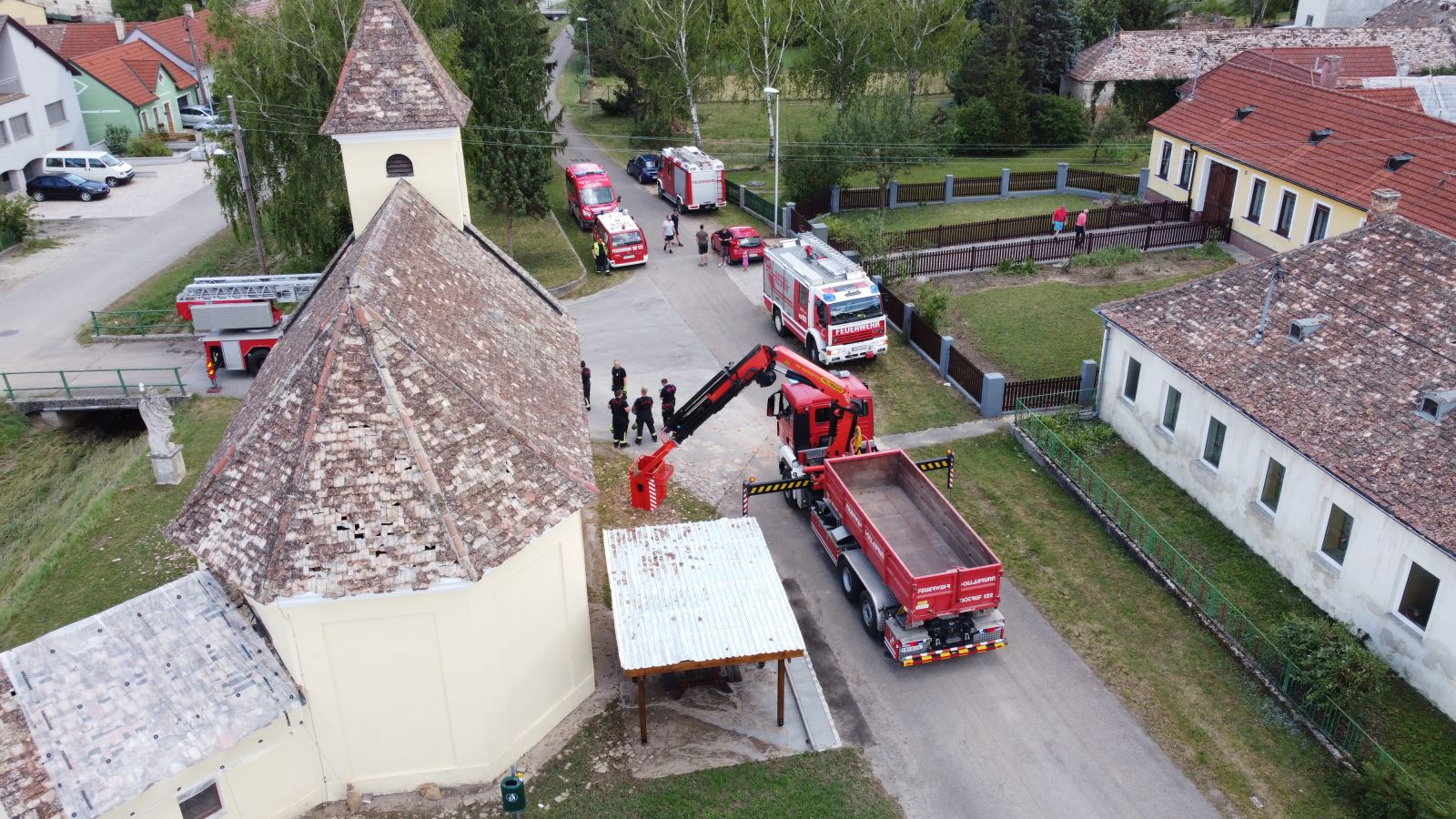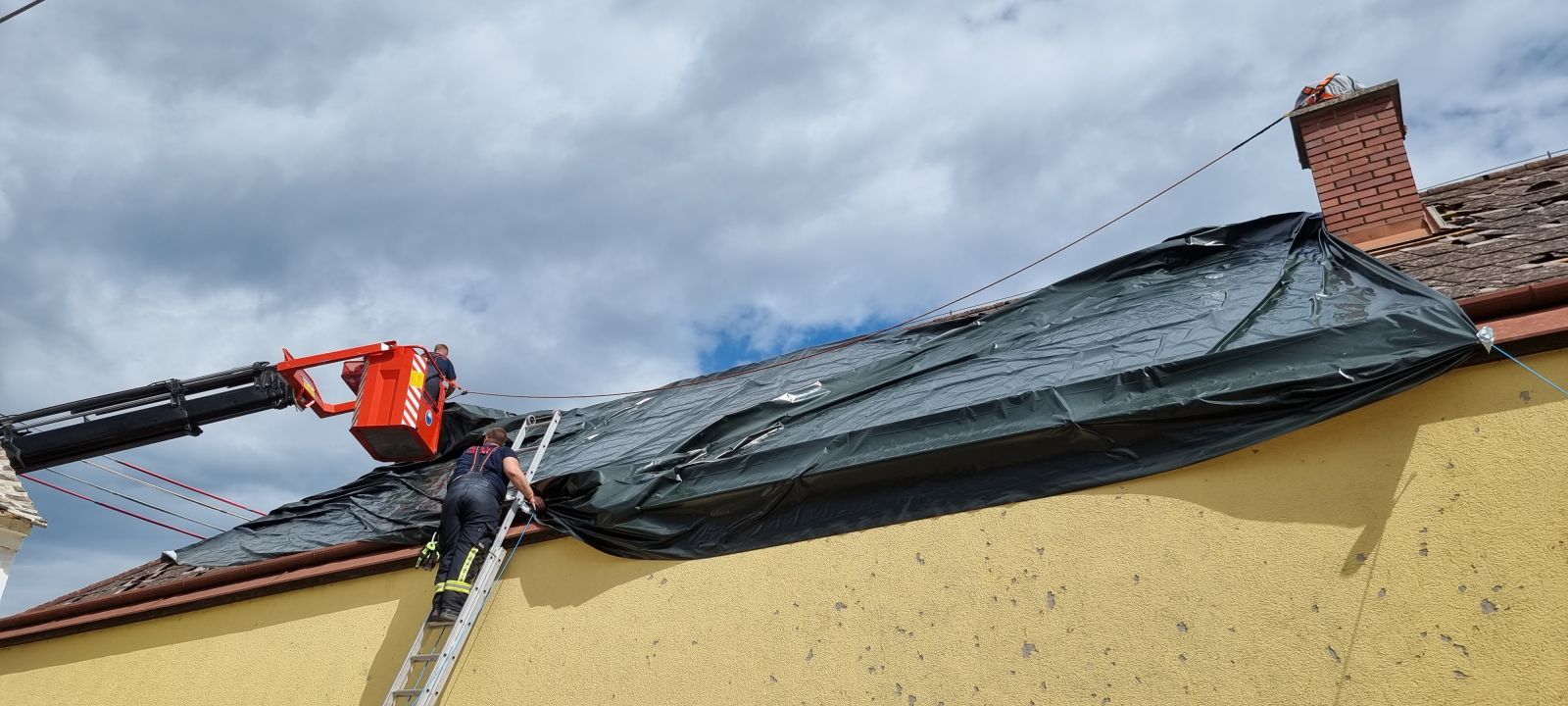 Feuerwehrkommandant Werner Trauner bereitete den eigenen Garten gerade noch rechtzeitig auf das Unwetter vor, als es kurz danach mit dem schweren Hagelschlag los ging. „Schon wenige Minuten nach dem Hagel ging auch die Sirene zweimal los und wir rückten zu den ersten Einsatzstellen aus. Im Minuten-Takt bekamen wir von der Bereichsalarmzentrale Hollabrunn weitere Einsätze übermittelt. Deshalb errichteten wir rasch eine Einsatzleitung im Feuerwehrhaus. Wir alarmierten in weiterer Folge drei Wechsellader und einen Hubsteiger, in Summe 9 Feuerwehren alleine am Donnerstagabend. Hauptsächlich handelte es sich um kaputte Dächer. Über verschiedene Kontakte holten wir noch in der ersten Nacht Planen aus drei verschiedenen Baumärkten der Umgebung. Um 02:00 morgens brach ich den Einsatz ab, da die Kombination von Dunkelheit, Höhe und Müdigkeit einfach zu gefährlich war. Der gesamte Schaden war uns am Donnerstagabend noch nicht bewusst. Am Freitag ging es nach einer ersten Erkundung weiter und es kam eine Schadensstelle nach der anderen hinzu. Oft war es so, dass die Hausbesitzer die Schäden eigentlich mit entsprechenden Firmen beheben wollten, aber natürlich konnten die Dachdecker der Umgebung dies nicht überall zeitnahe umsetzen und so wandten sich von Stunde zu Stunde immer mehr beunruhigte Hausbesitzer an die Feuerwehr. Mein Einsatzauftrag an die einzelnen Feuerwehren war die Dächer provisorisch abzusichern und zur Umsetzung den jeweils raschesten Ansatz zu wählen. Wir reparierten aber keine Nebengebäude, Scheunen oder Maschinenhallen, nur Dächer wo durch den angekündigten Regen und Sturm eine Gefahr bestand. Besonders beindruckt war ich vor allem von der Hilfsbereitschaft der ortsfremden Feuerwehrmitglieder. Ich möchte ihnen im Namen der Ortsbevölkerung von Hohenwarth meinen Dank ausdrücken.“