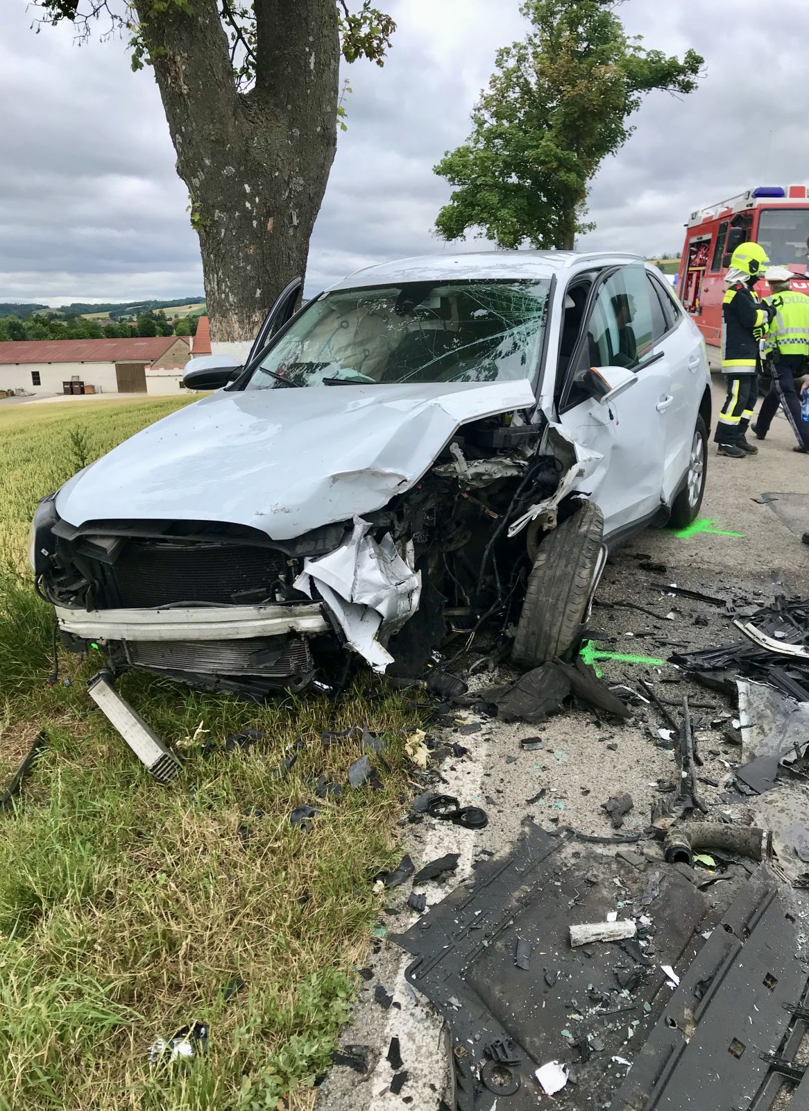 Die Feuerwehren Oberfellabrunn, Hollabrunn und Sitzendorf sicherten die Unfallstelle ab und befreiten mit mehreren hydraulischen Rettungssätzen den schwer verletzten Jugendlichen.
