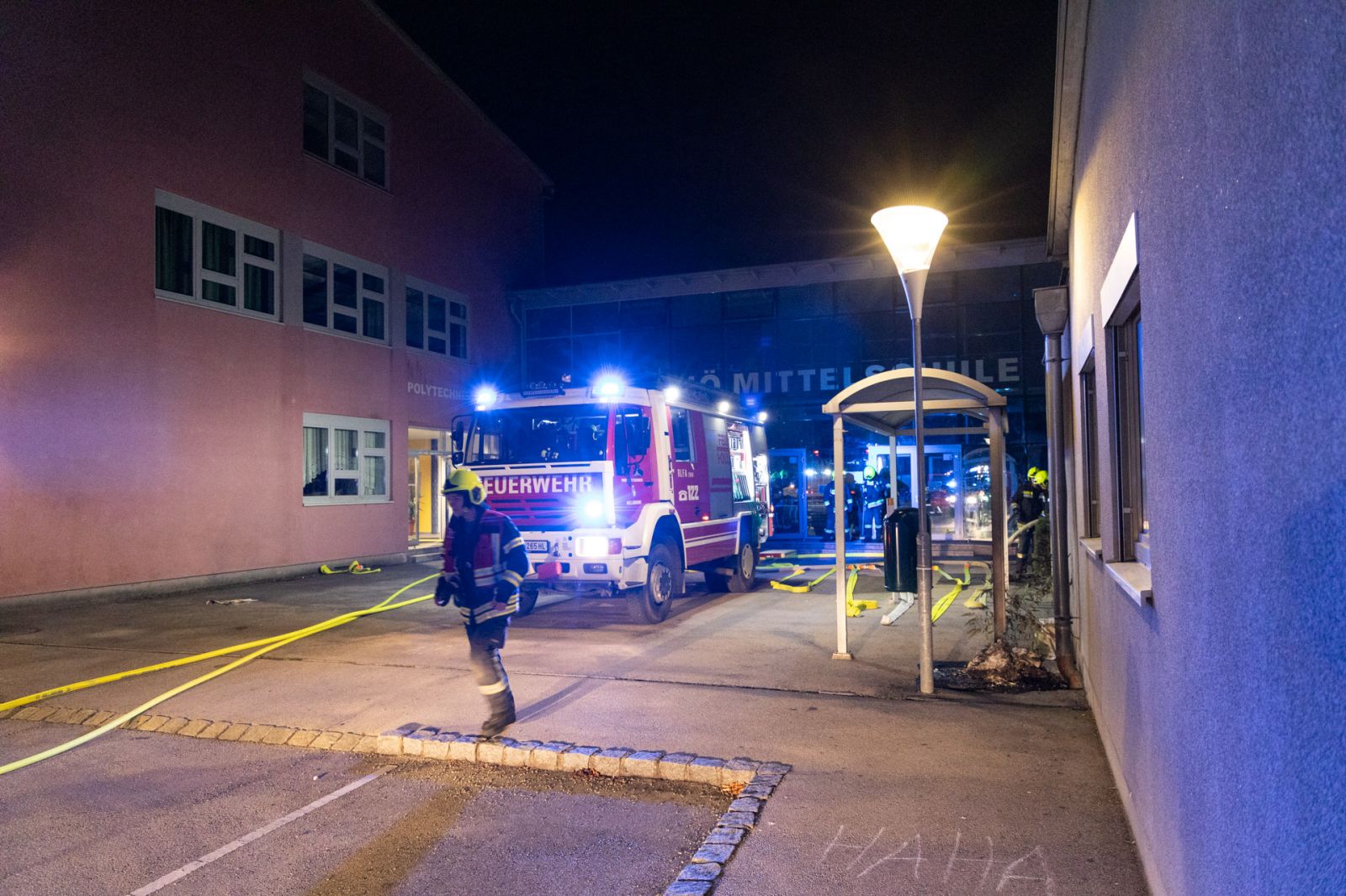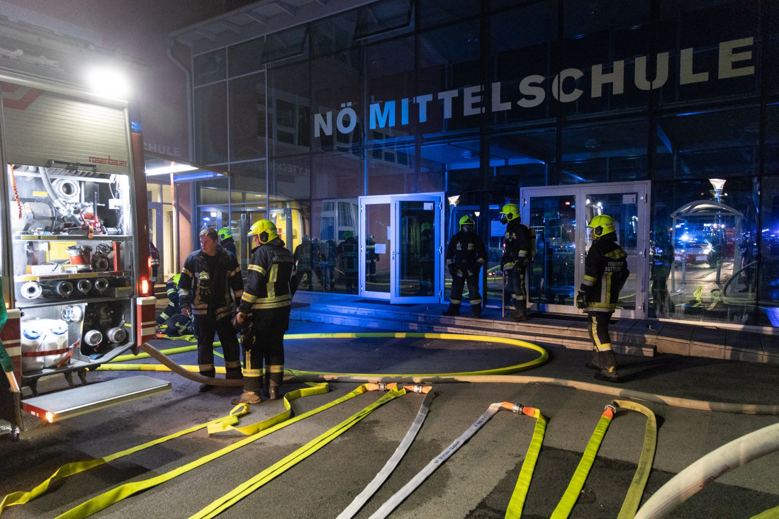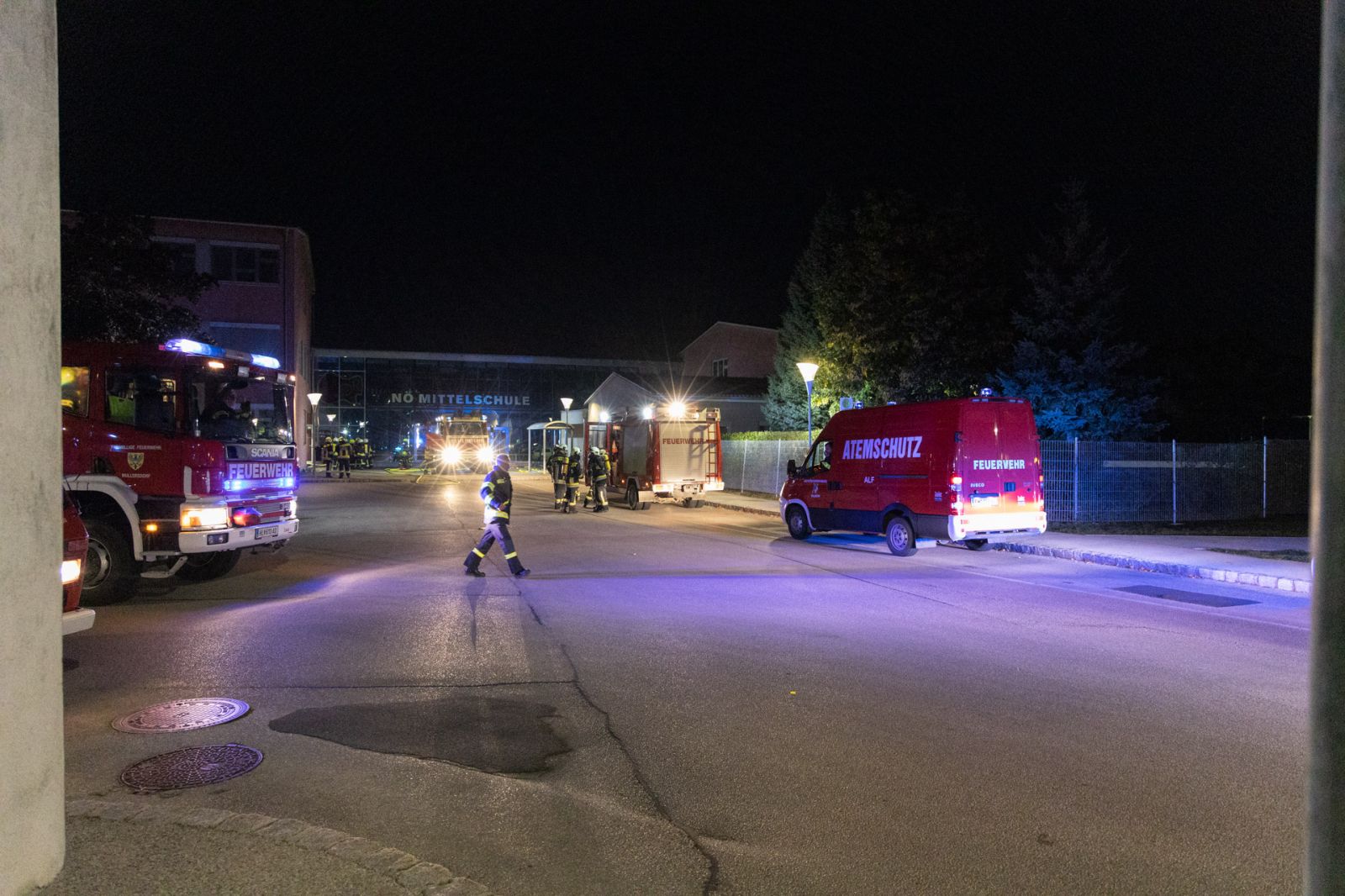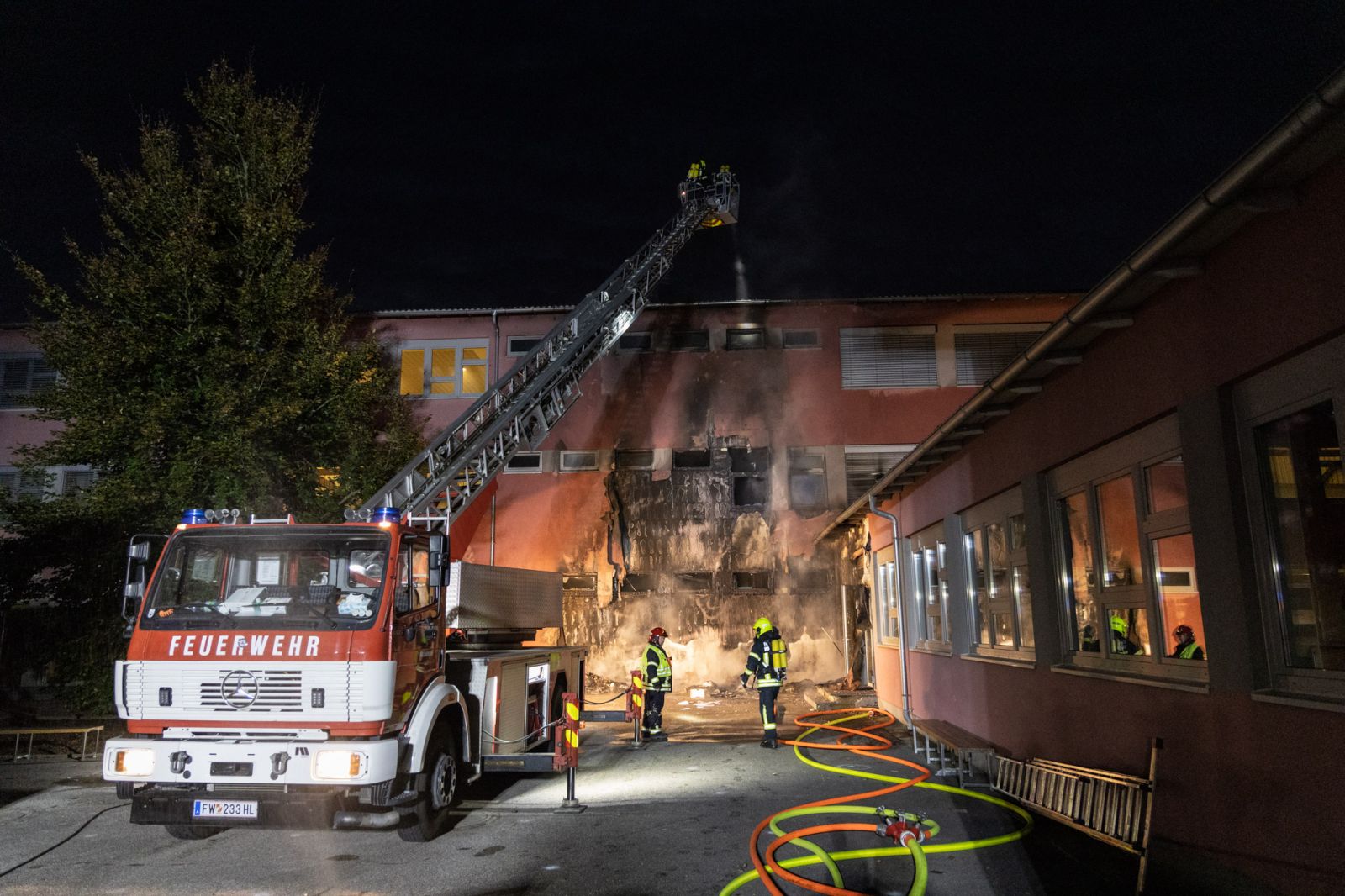 In der Mittelschule Hollabrunn ist es am 26.09.2021, kurz nach 05:30, zu einem Brand gekommen. Beim Eintreffen der Feuerwehr stand ein Teil der Fassade auf Seite der Bachpromade in Vollbrand.