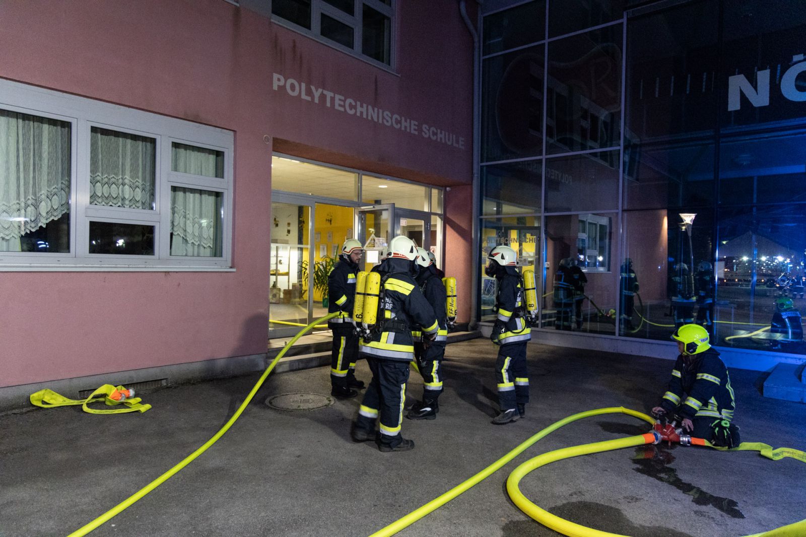 Die Feuerwehr Hollabrunn startet sofort einen Löschangriff und brachte die Drehleiter für weitere Löschmaßnahmen in Stellung. Gleichzeitig wurde von Seite der Schmiedgasse ein Löschangriff im Inneren des Gebäudes aufgebaut.