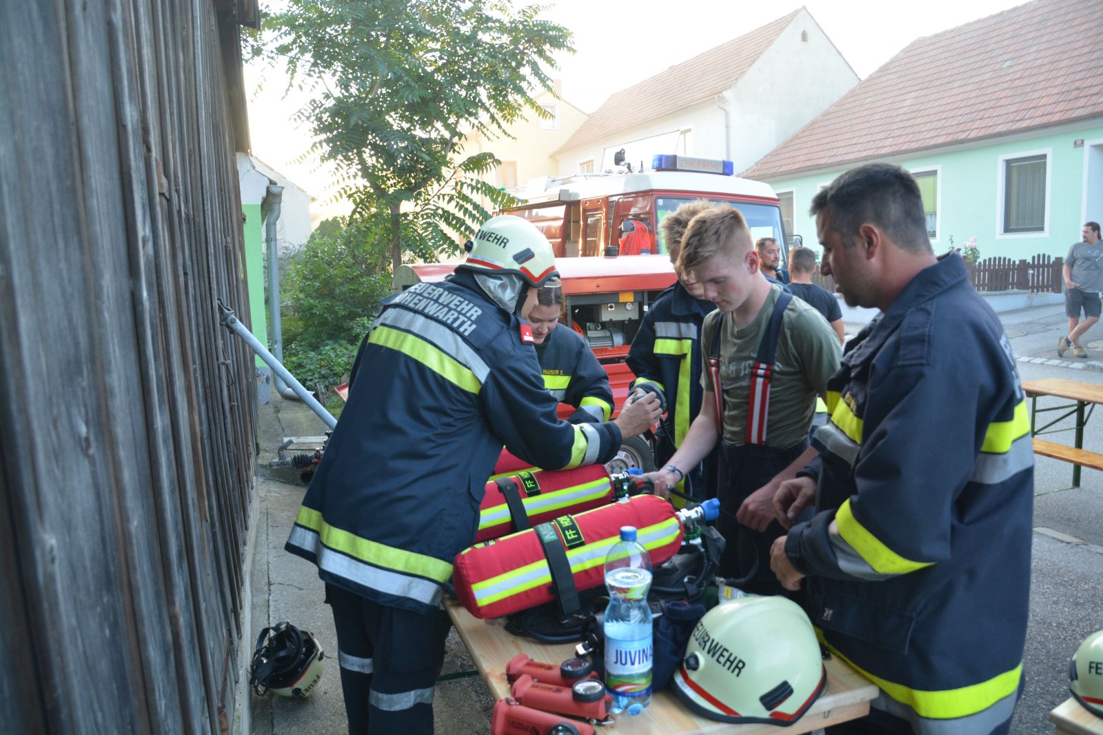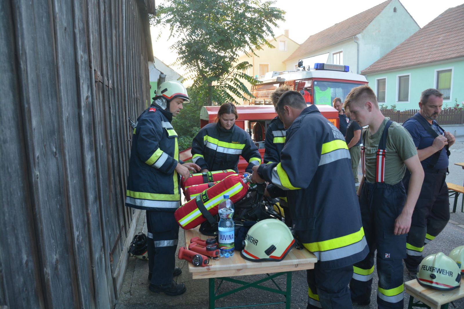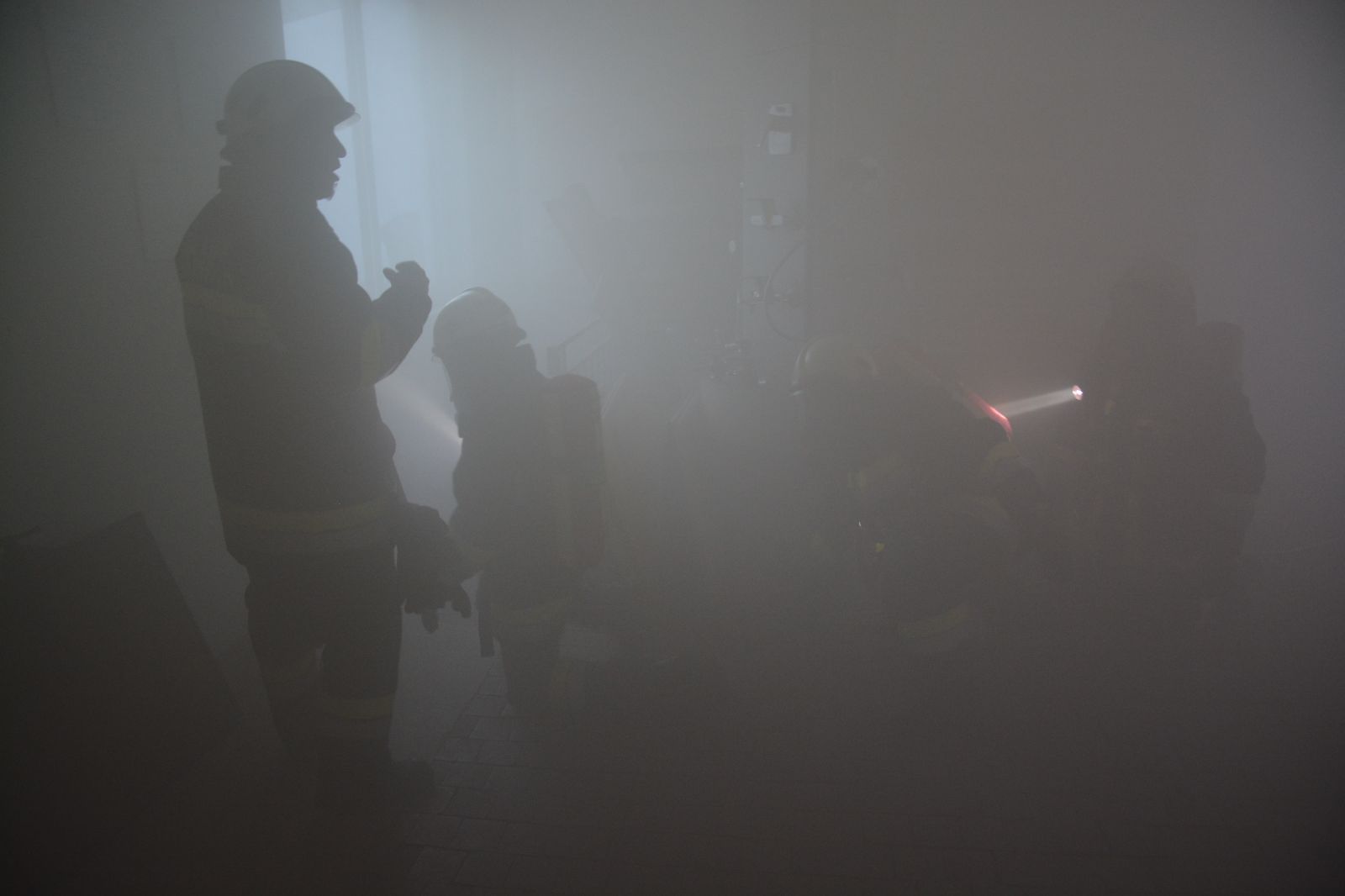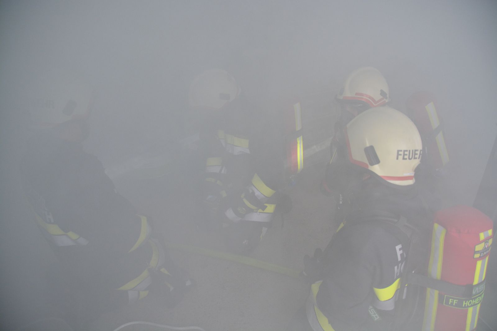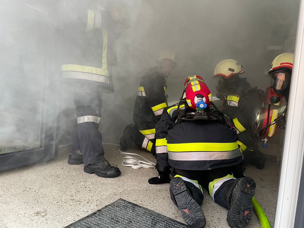 Feuerwehrkameraden rüsteten sich mit dem schweren Atemschutz aus und begaben sich auf die Suche. Es wurden mehrere Atemschutztrupp abwechselnd hineingeschickt. Jeder Trupp musste eine vermisste Person finden. Die letzten zwei Trupps sollten jeweils eine Gasflasche finden und sichern.