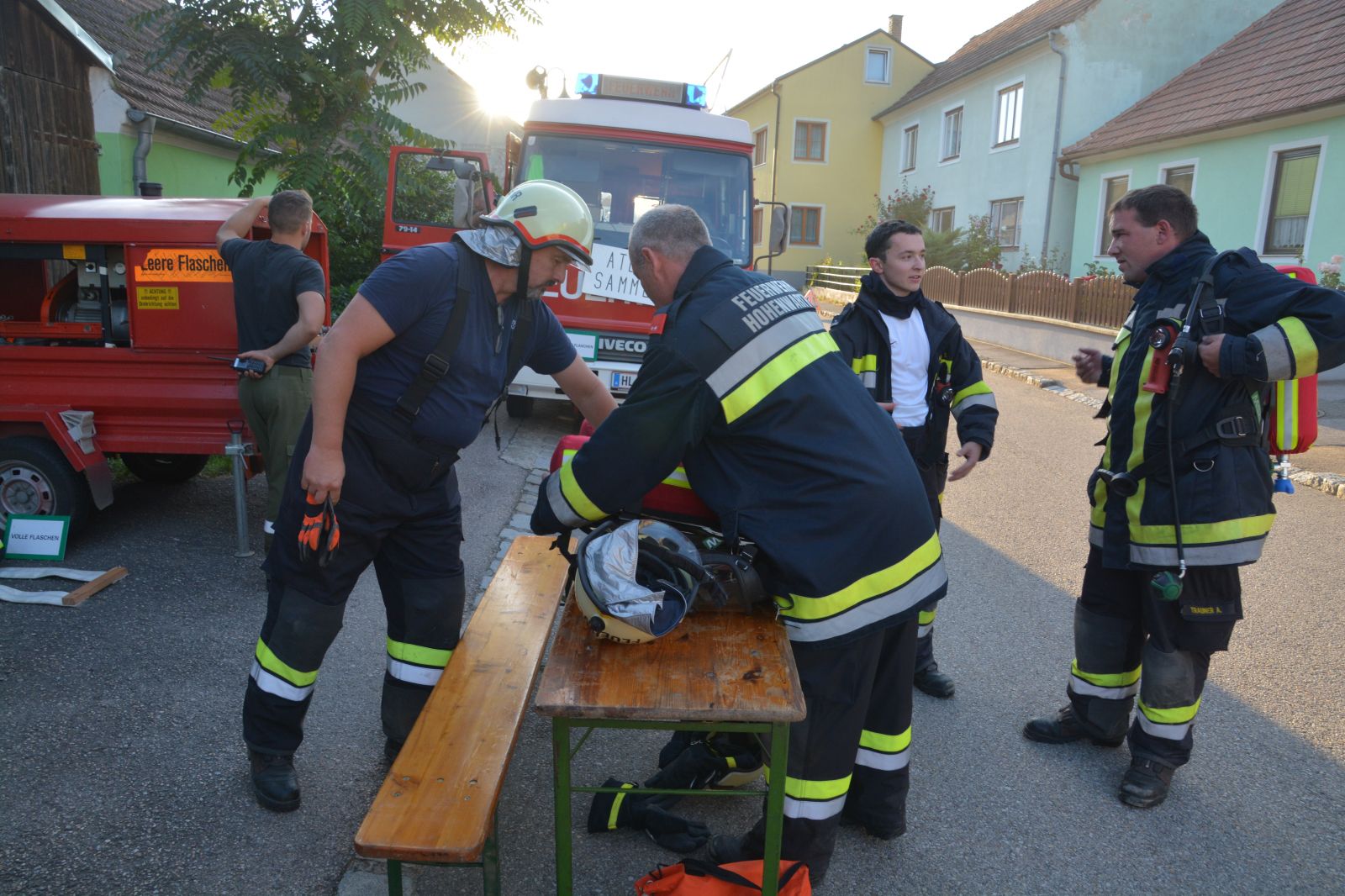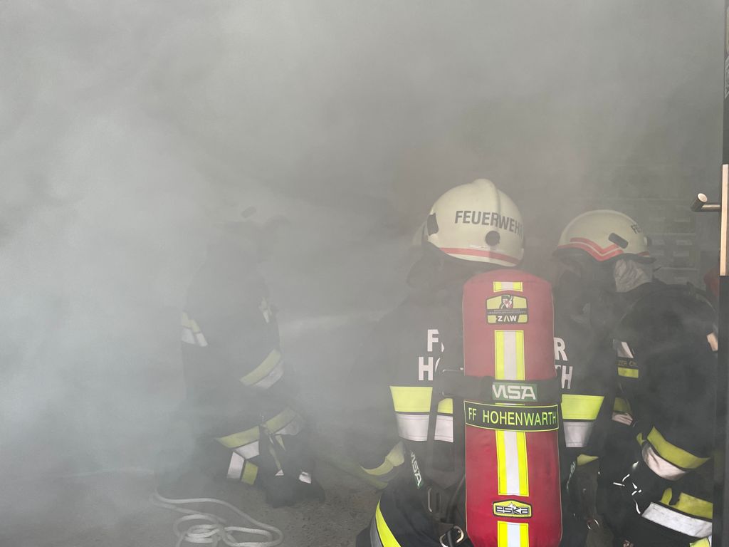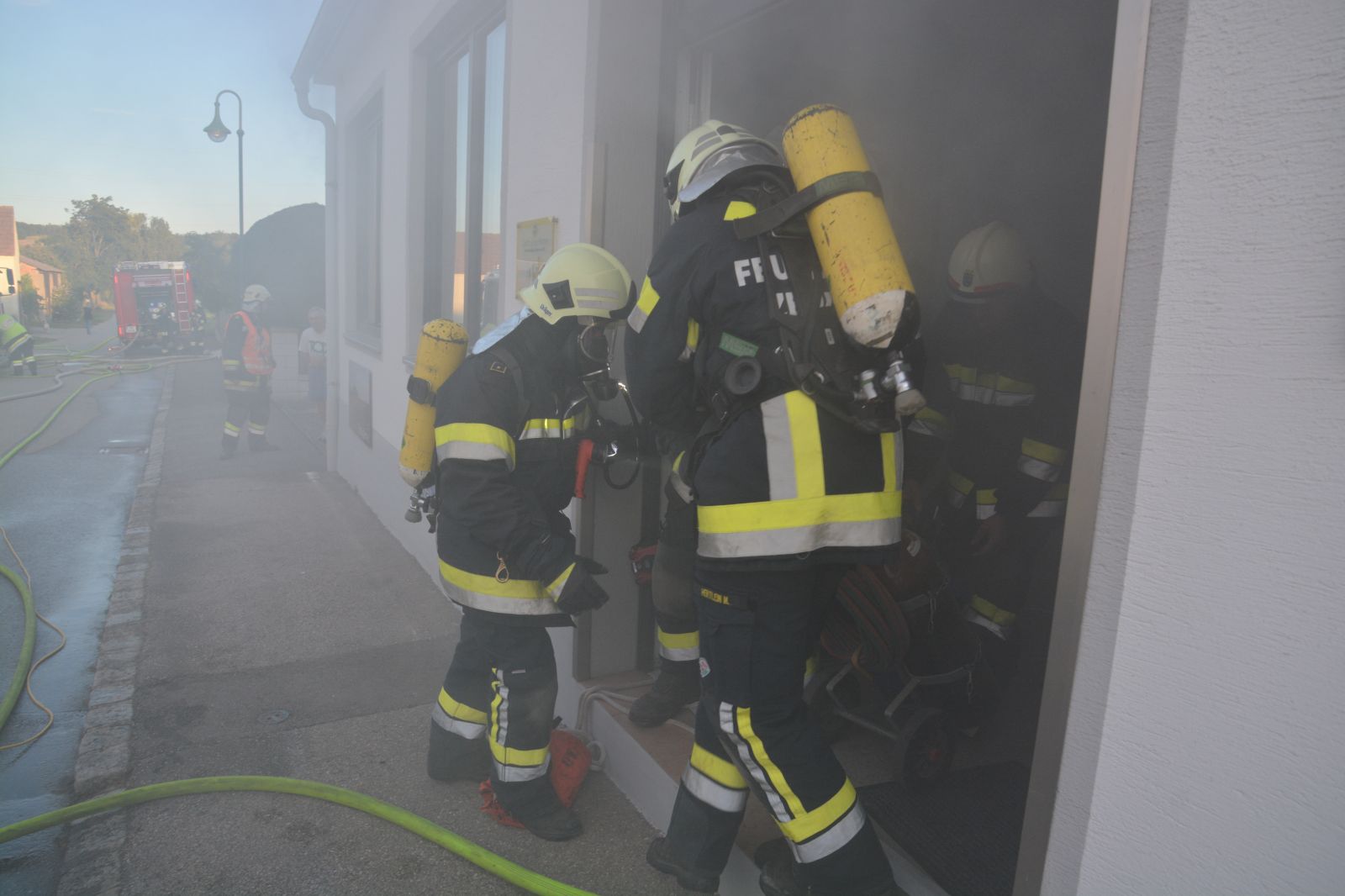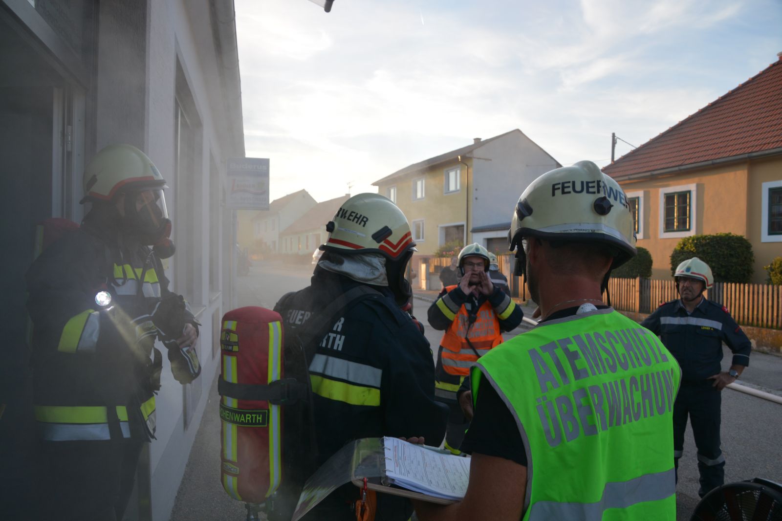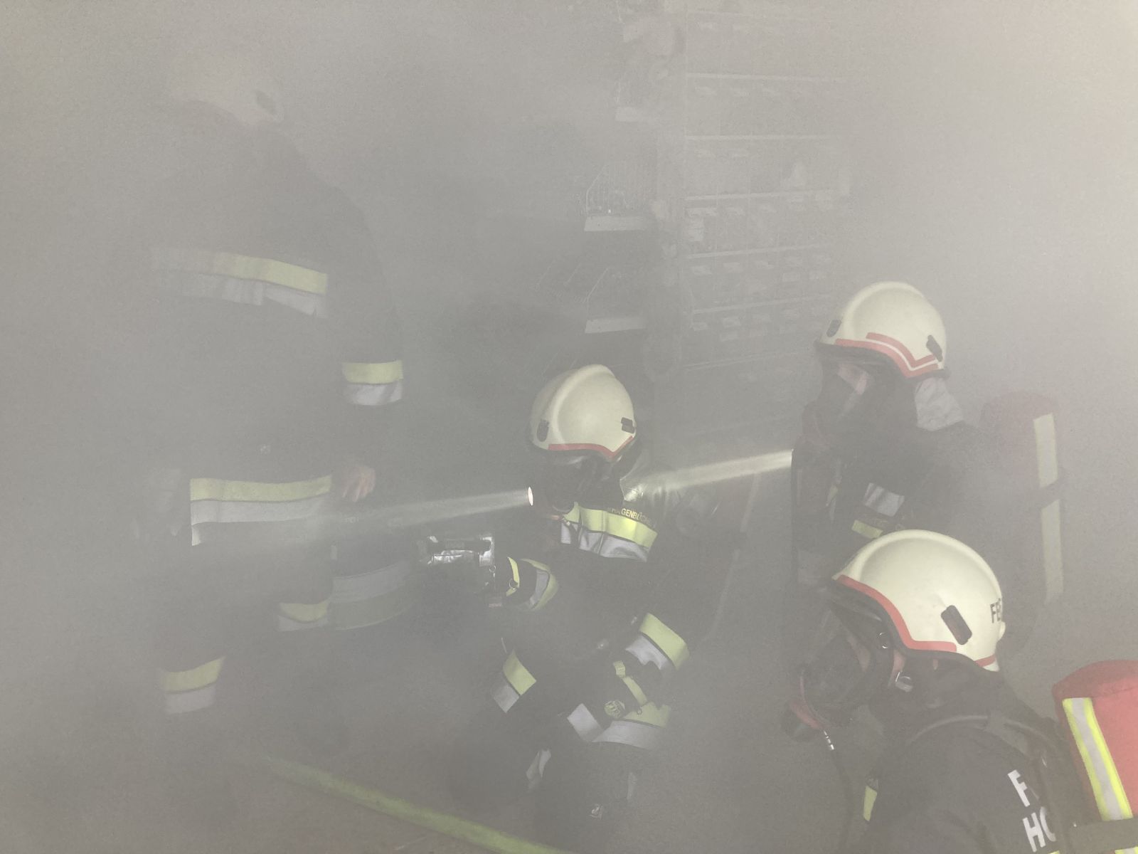 Feuerwehrkameraden rüsteten sich mit dem schweren Atemschutz aus und begaben sich auf die Suche. Es wurden mehrere Atemschutztrupp abwechselnd hineingeschickt. Jeder Trupp musste eine vermisste Person finden. Die letzten zwei Trupps sollten jeweils eine Gasflasche finden und sichern.