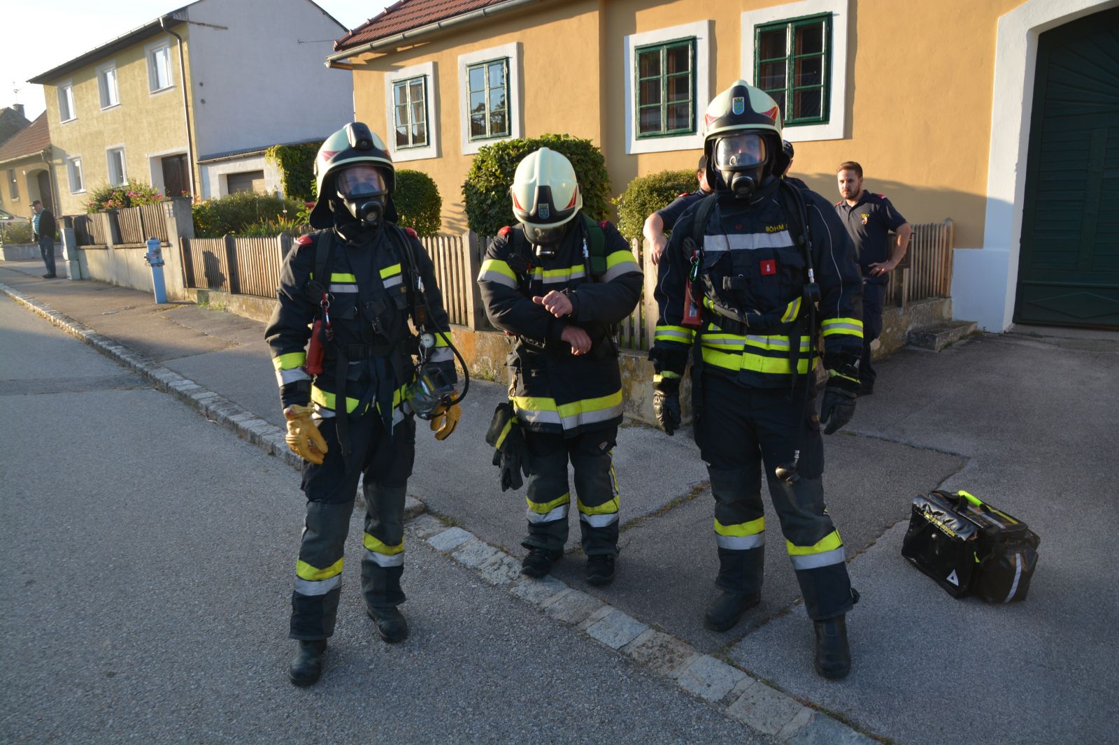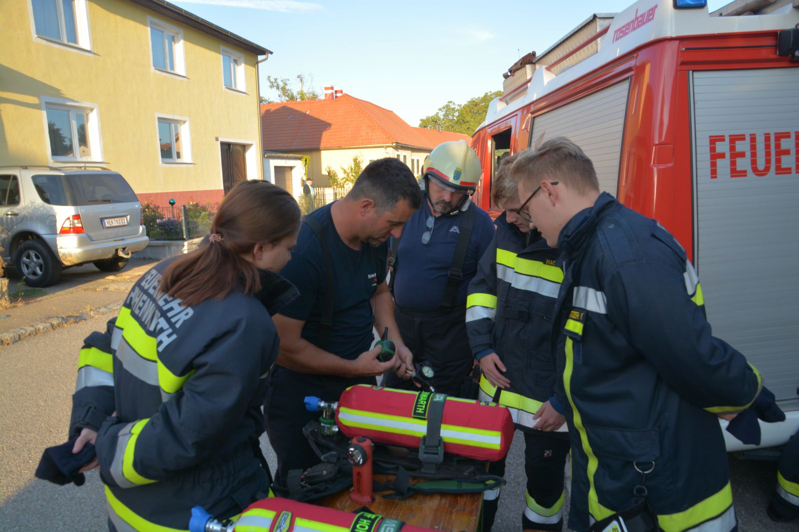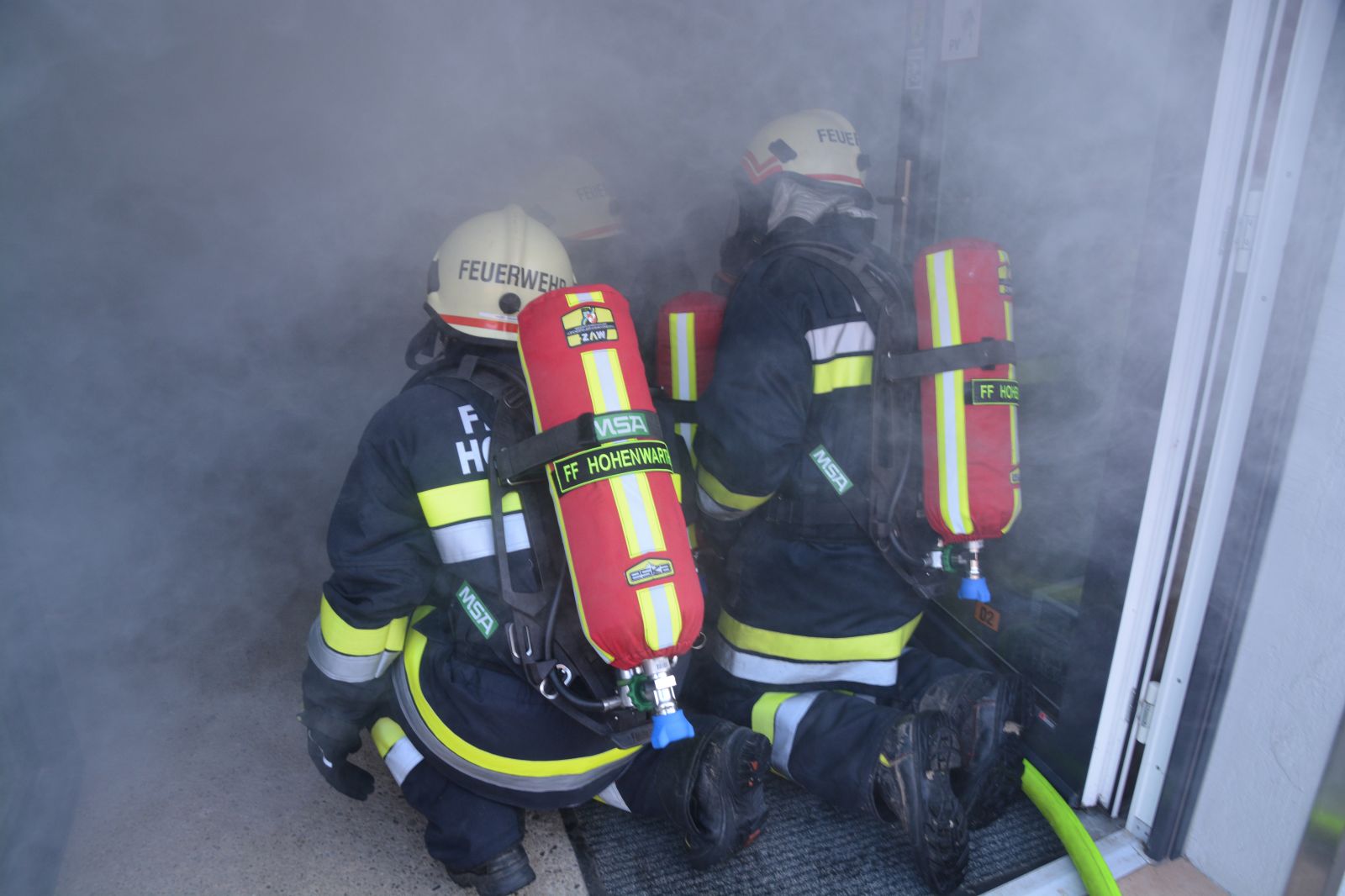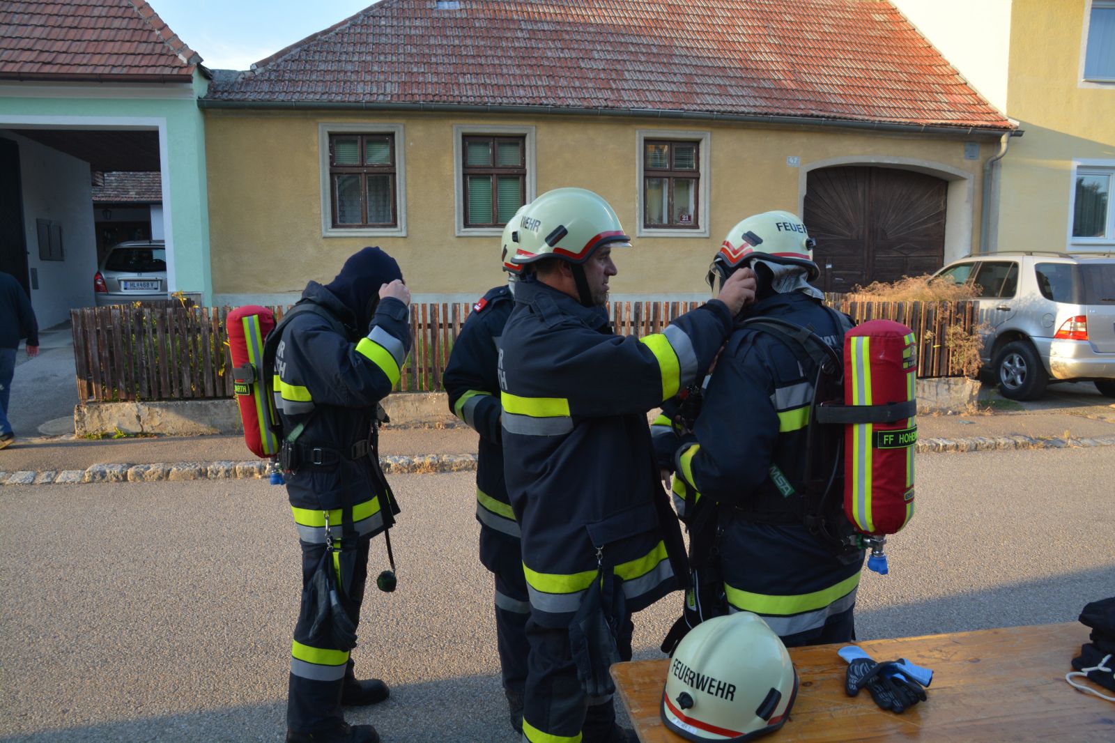 Feuerwehrkameraden rüsteten sich mit dem schweren Atemschutz aus und begaben sich auf die Suche. Es wurden mehrere Atemschutztrupp abwechselnd hineingeschickt. Jeder Trupp musste eine vermisste Person finden. Die letzten zwei Trupps sollten jeweils eine Gasflasche finden und sichern.