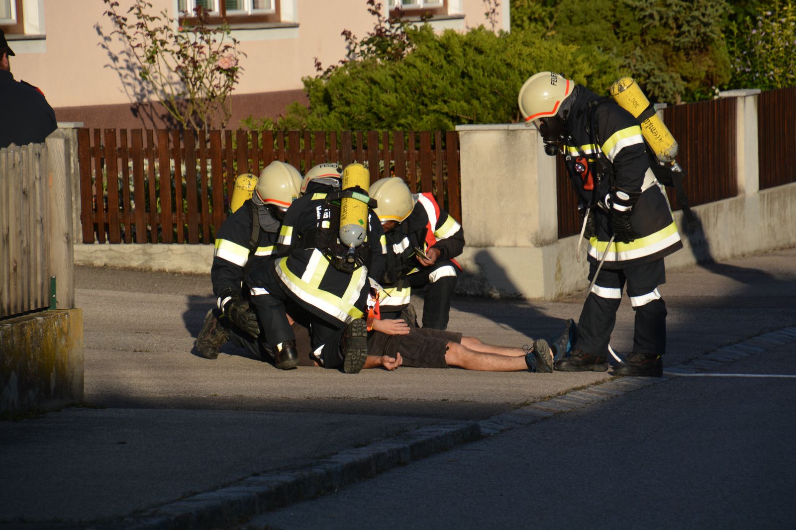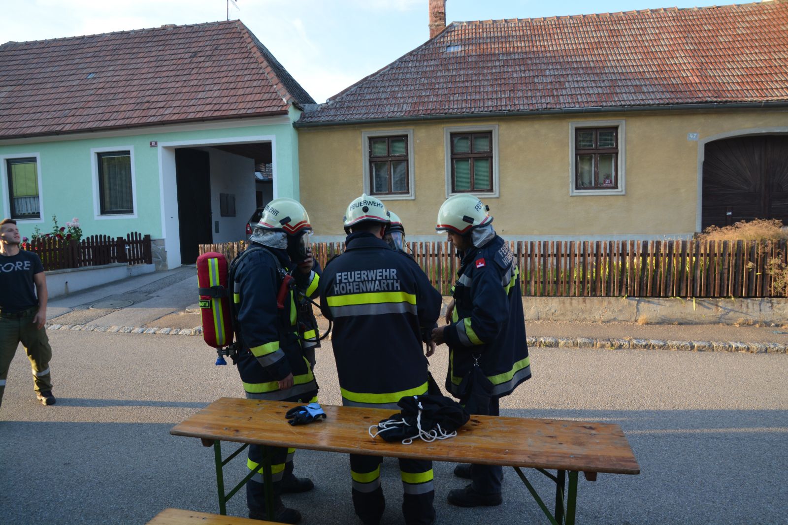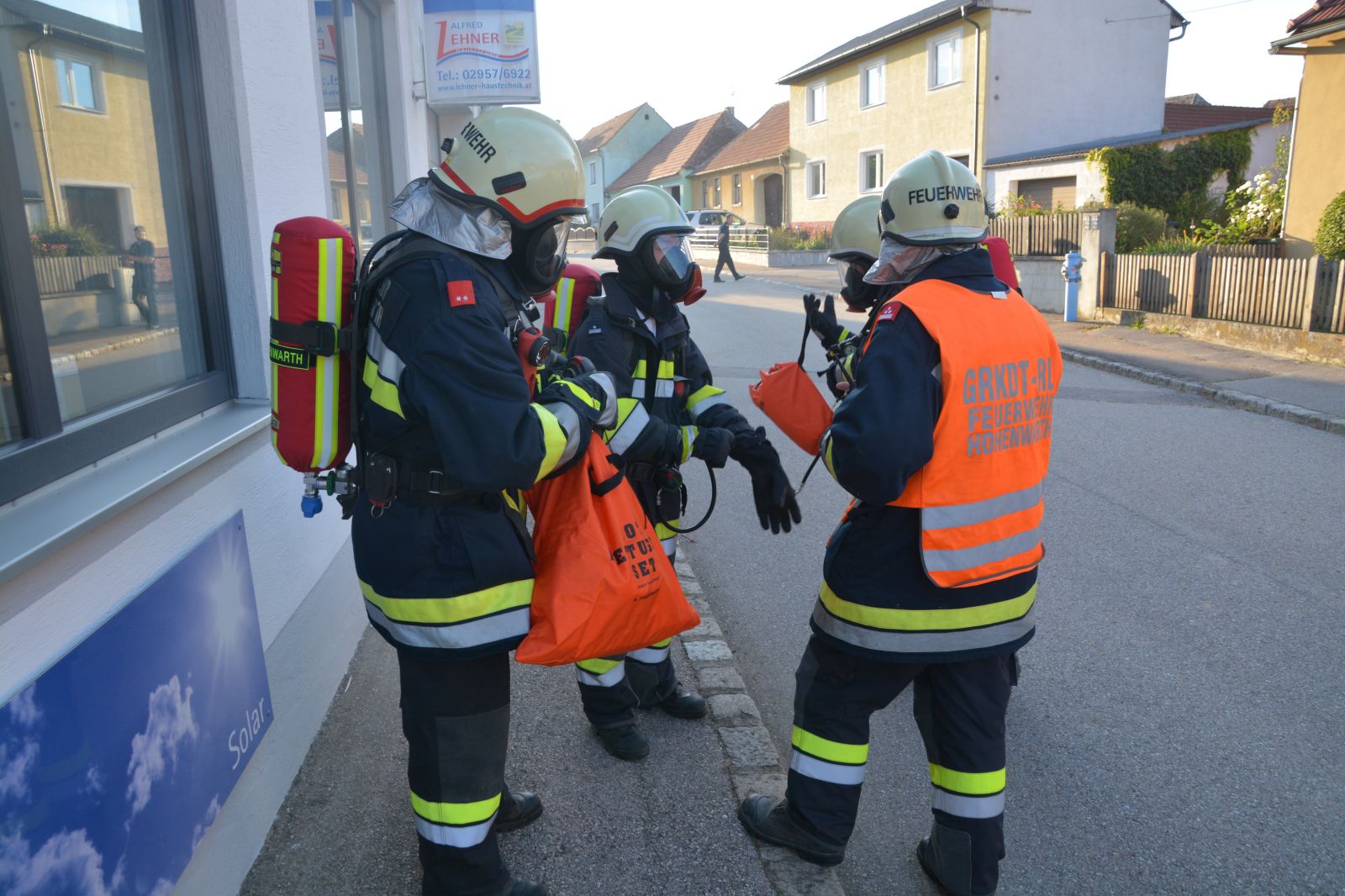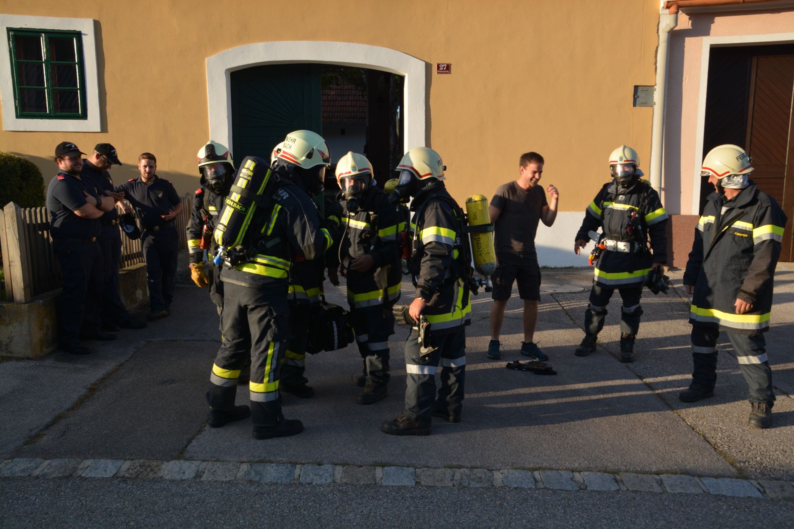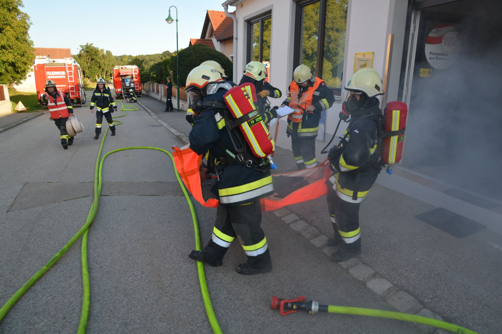 Feuerwehrkameraden rüsteten sich mit dem schweren Atemschutz aus und begaben sich auf die Suche. Es wurden mehrere Atemschutztrupp abwechselnd hineingeschickt. Jeder Trupp musste eine vermisste Person finden. Die letzten zwei Trupps sollten jeweils eine Gasflasche finden und sichern.