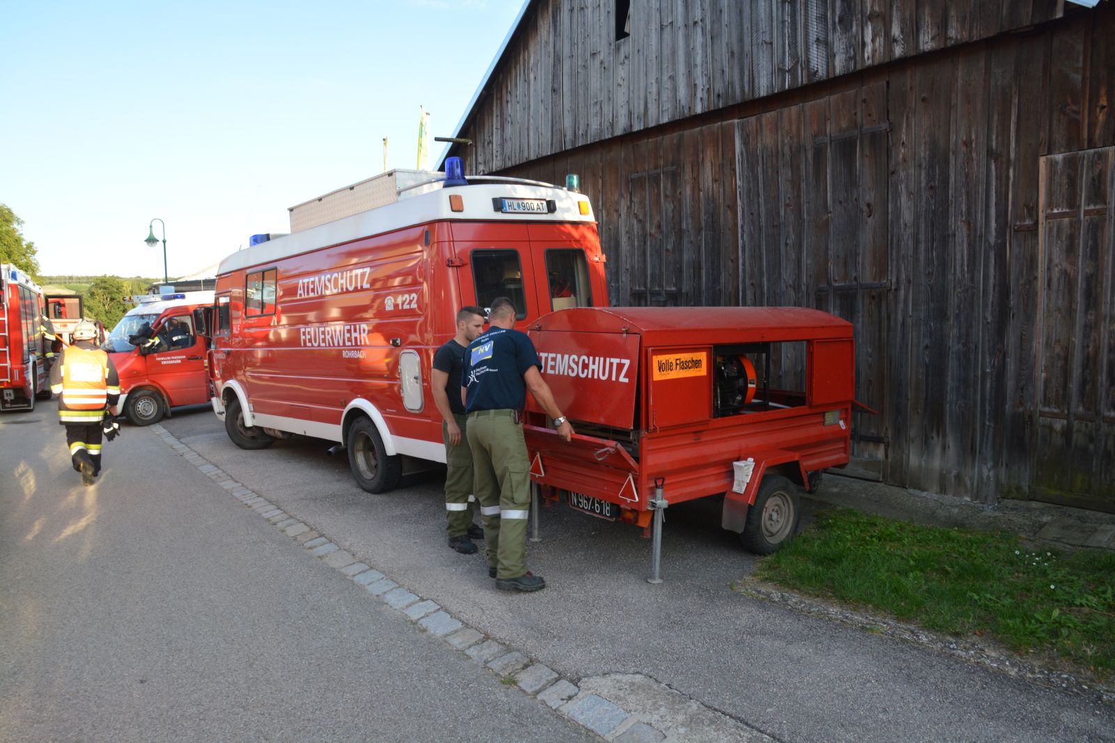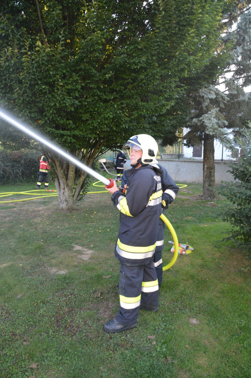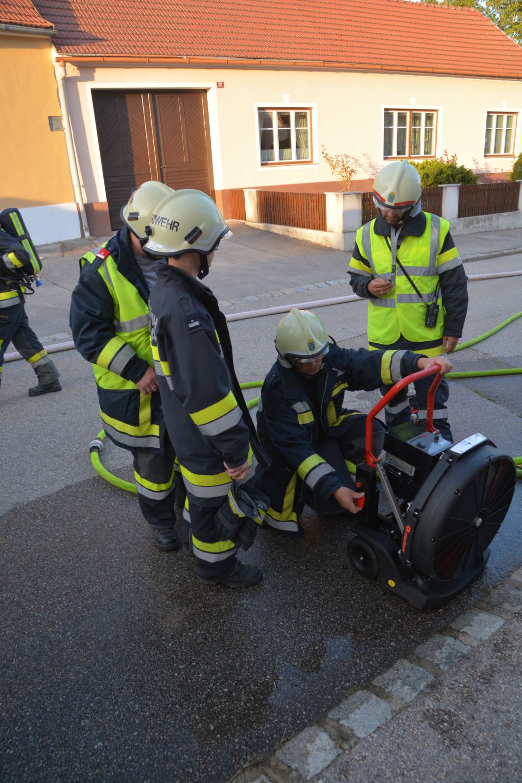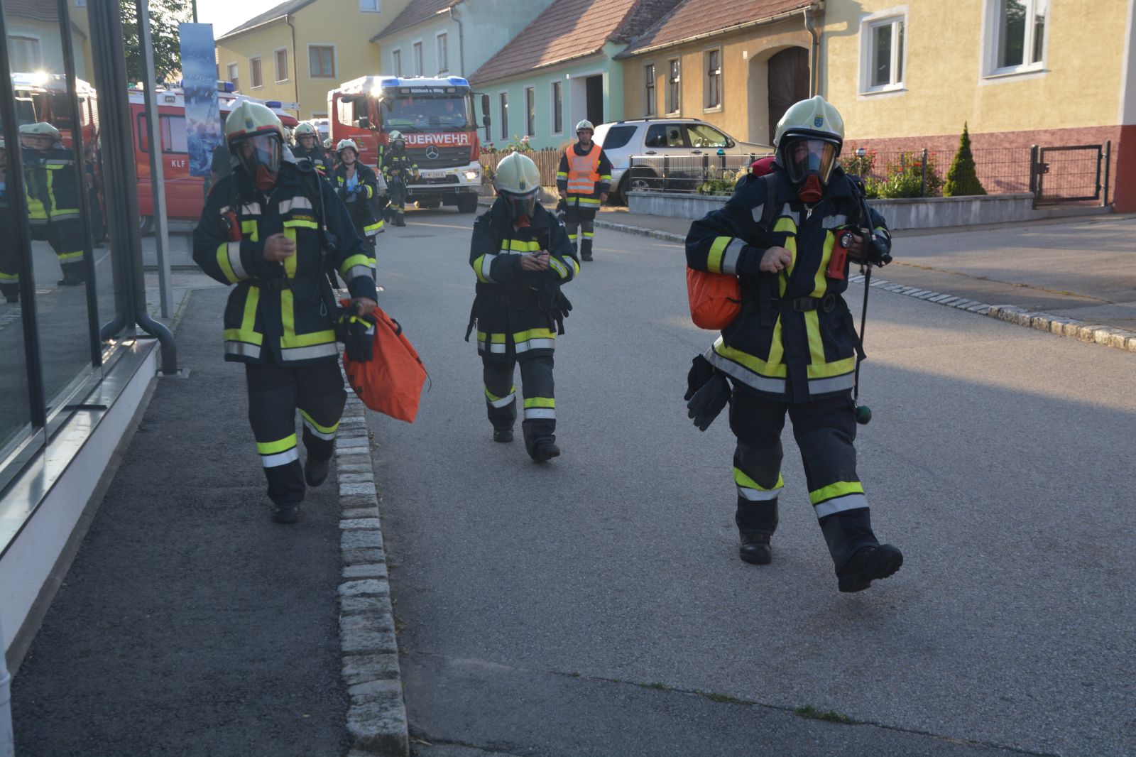 Feuerwehrkameraden rüsteten sich mit dem schweren Atemschutz aus und begaben sich auf die Suche. Es wurden mehrere Atemschutztrupp abwechselnd hineingeschickt. Jeder Trupp musste eine vermisste Person finden. Die letzten zwei Trupps sollten jeweils eine Gasflasche finden und sichern.