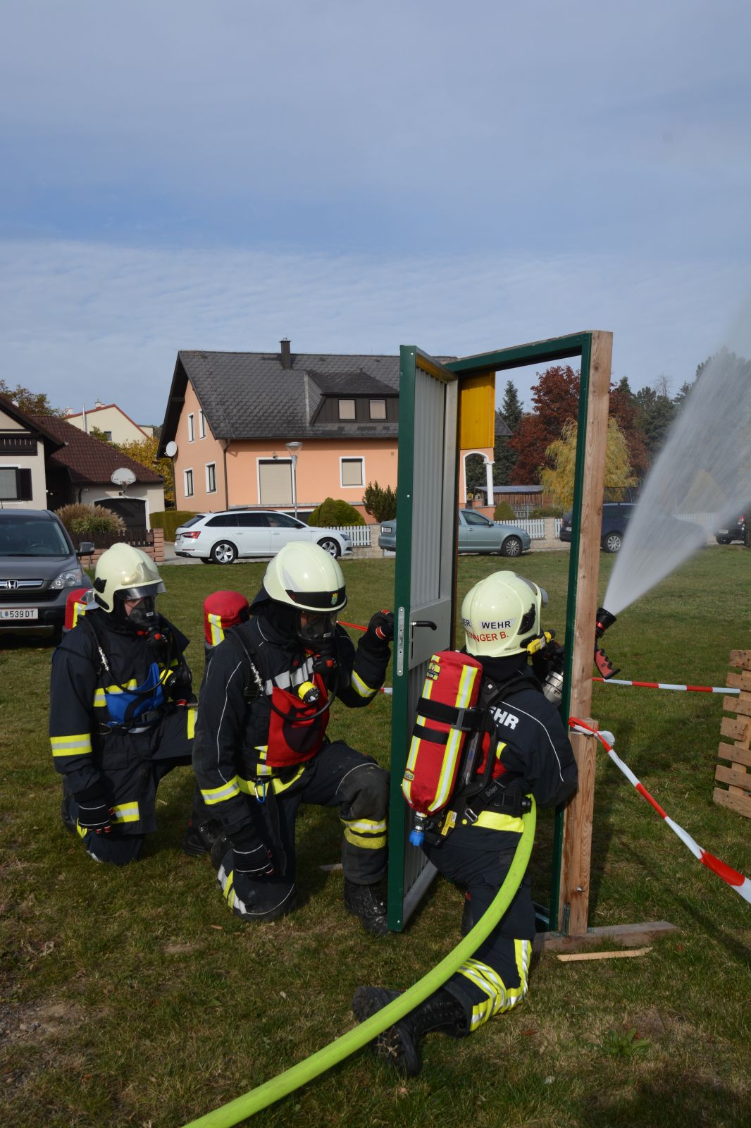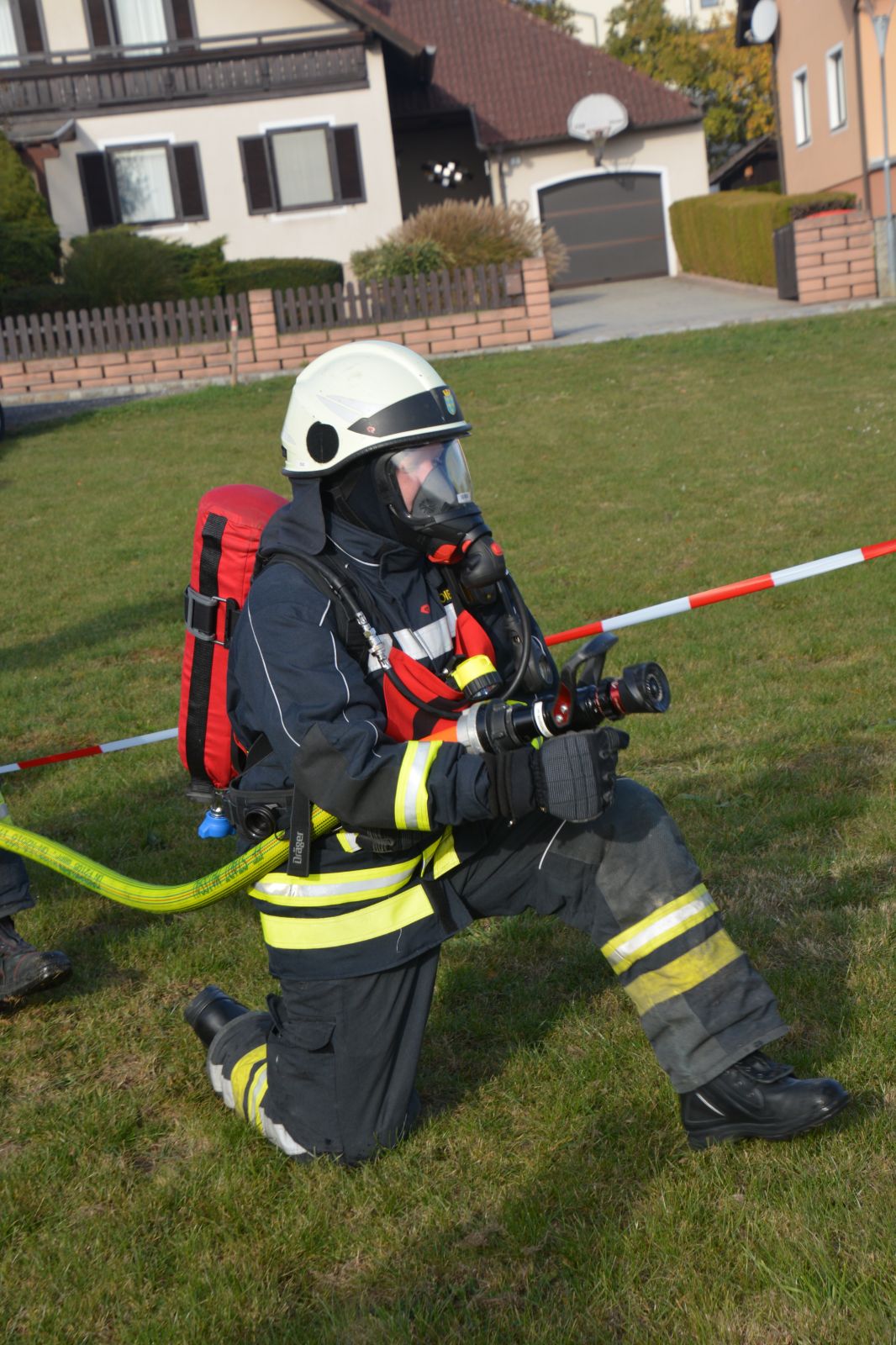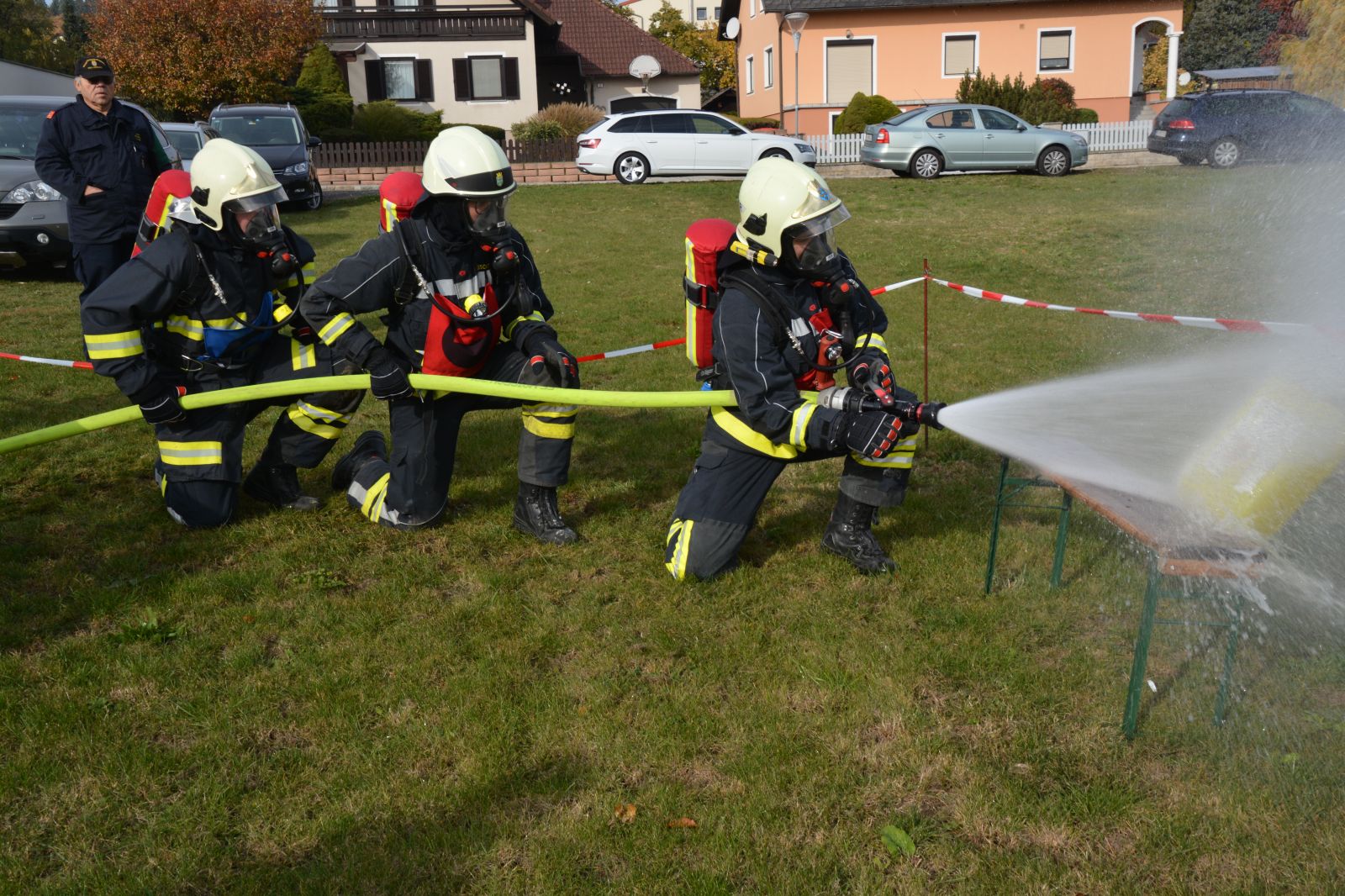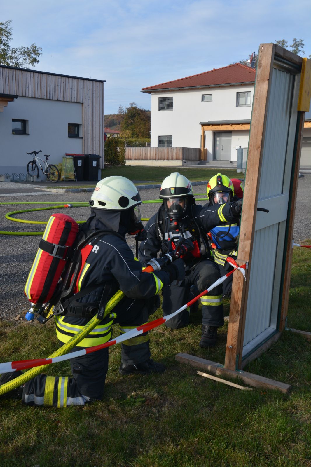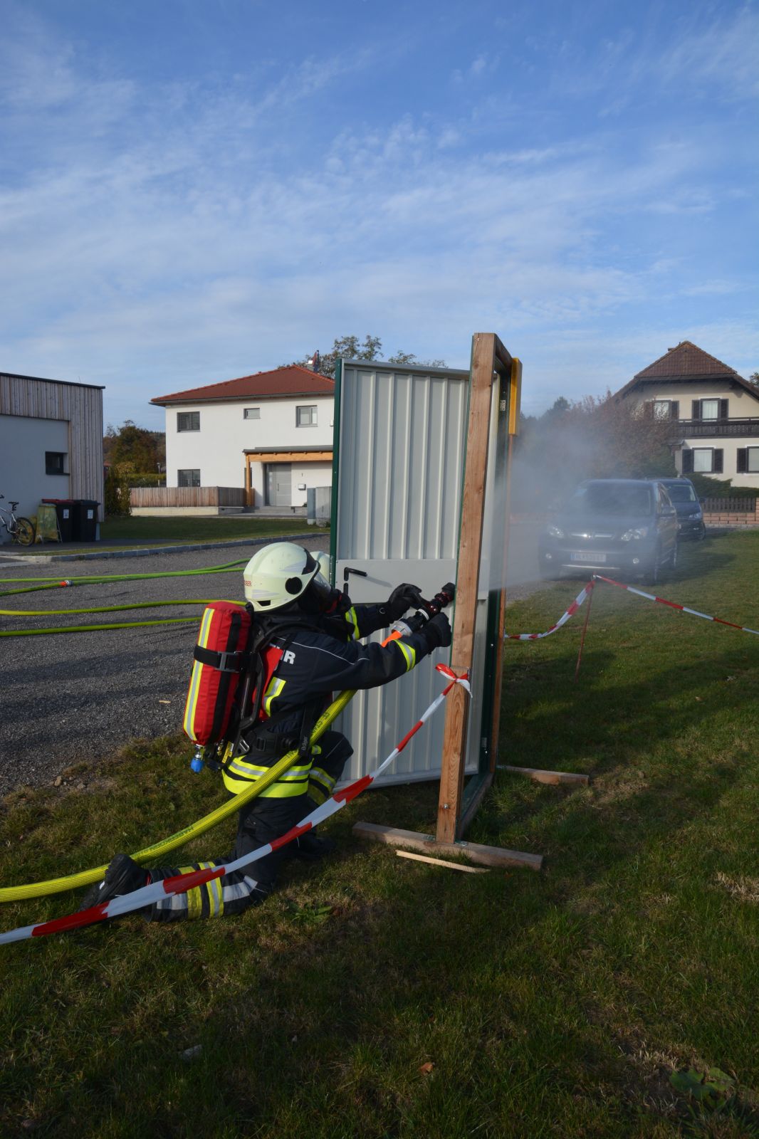 Im praktischen Teil musste ein simulierter Zimmerbrand gelöscht werden. Dabei musste der Innenangriff mit Atemschutz in einer vorgegebenen Zeit absolviert werden.