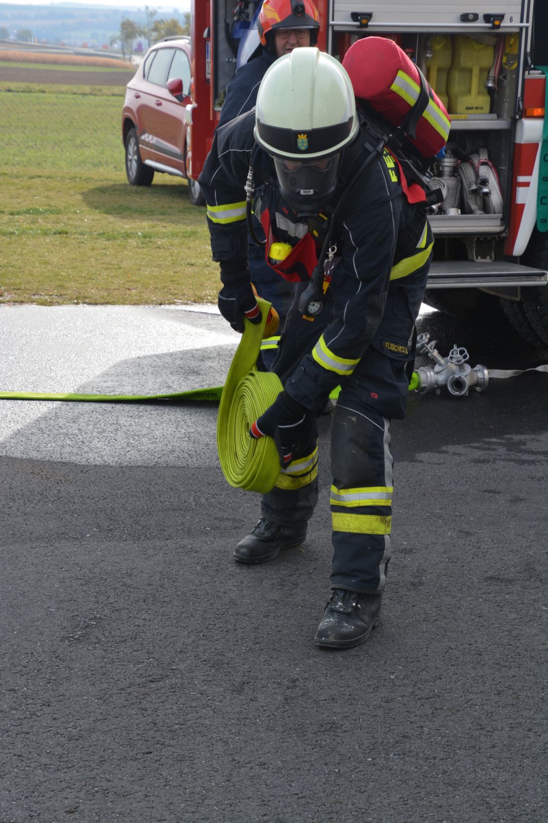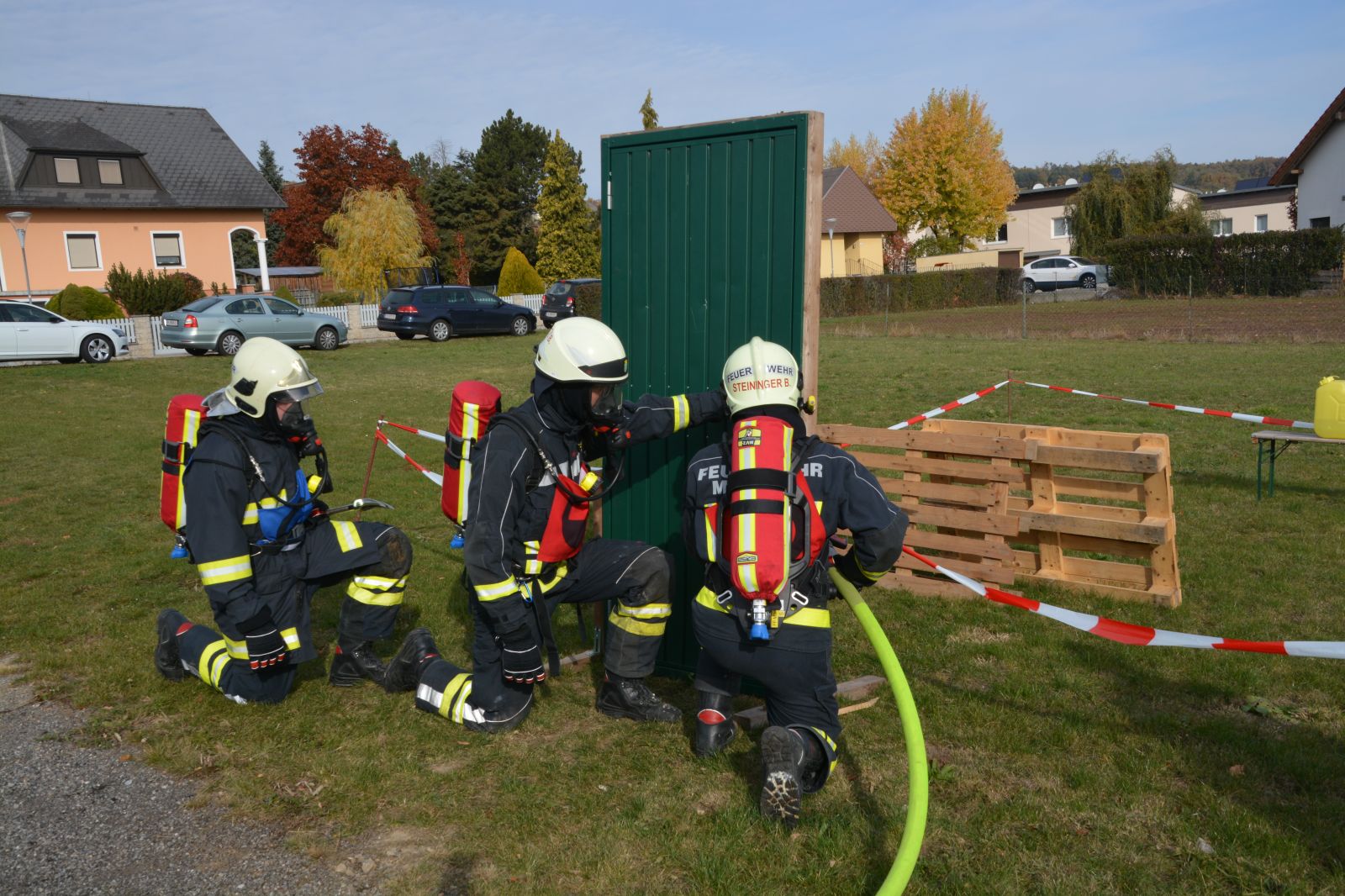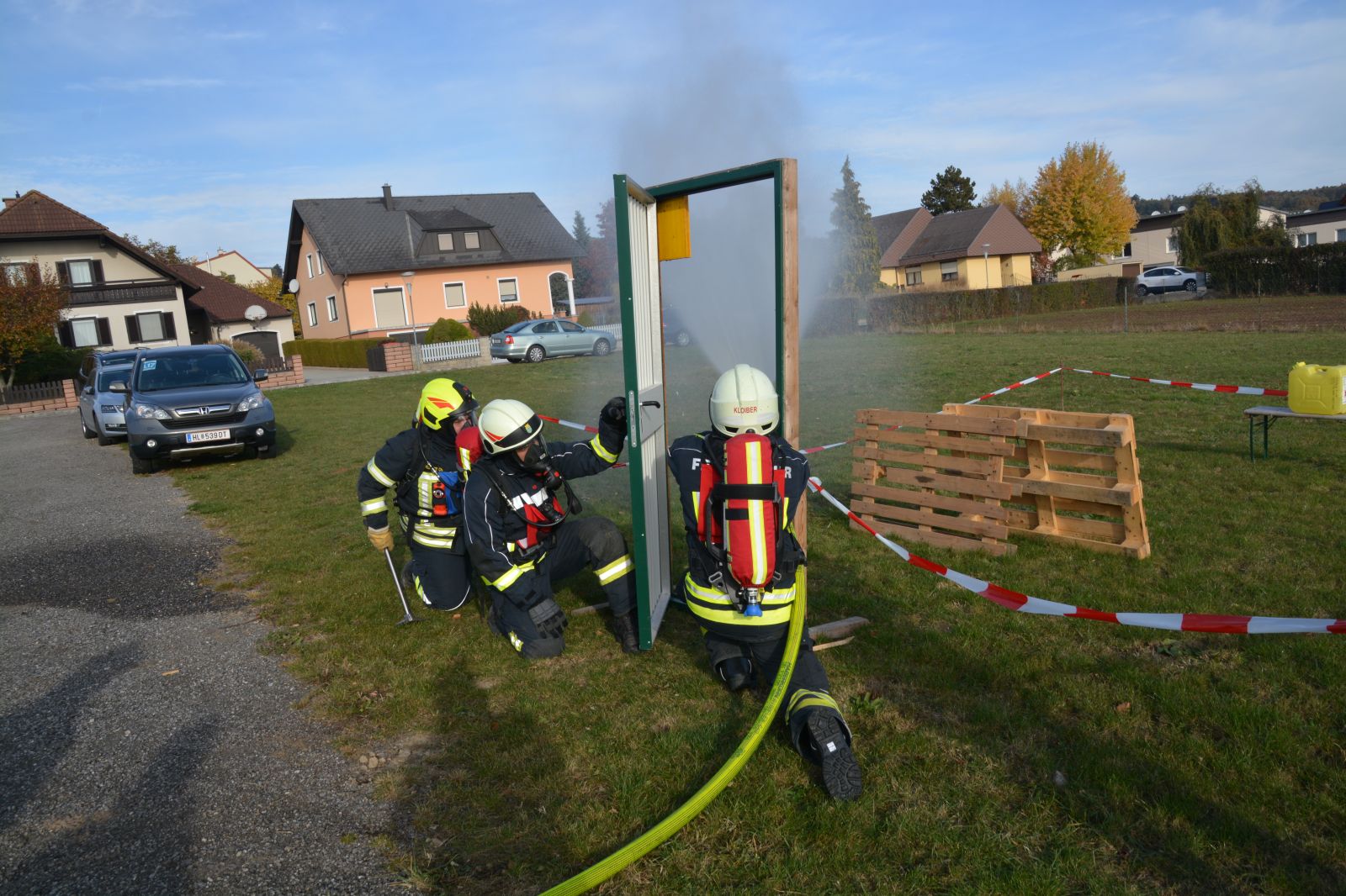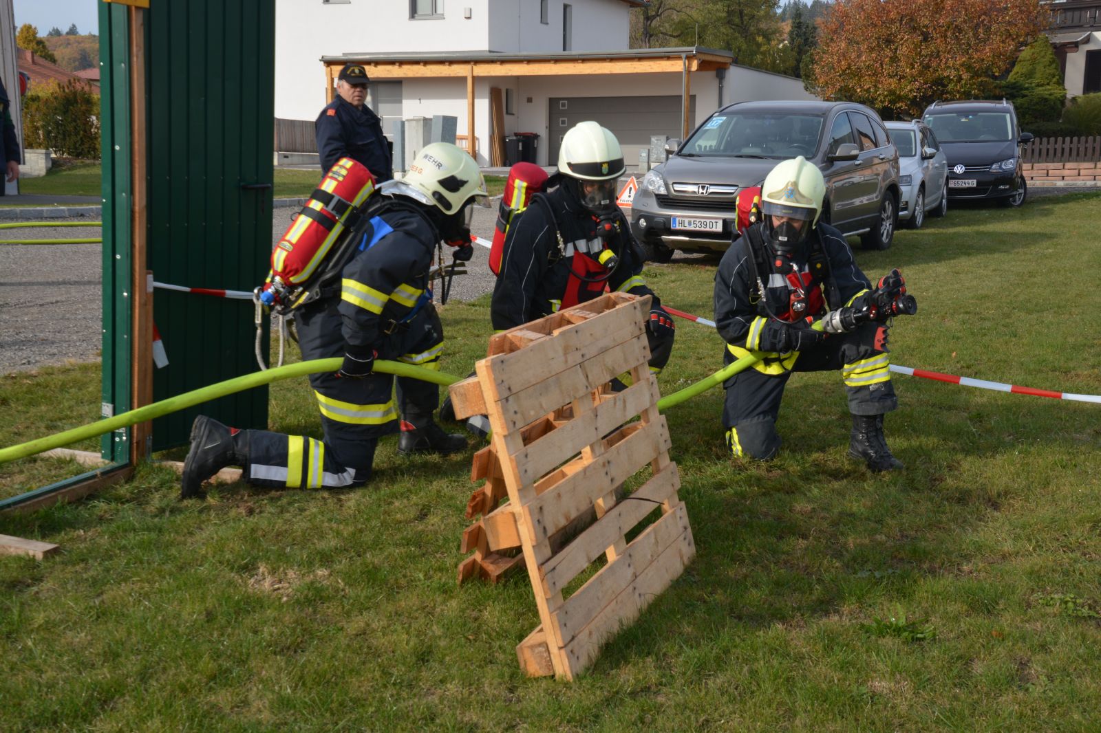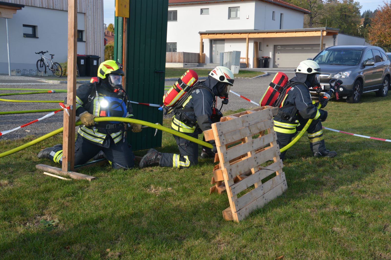 Im praktischen Teil musste ein simulierter Zimmerbrand gelöscht werden. Dabei musste der Innenangriff mit Atemschutz in einer vorgegebenen Zeit absolviert werden.