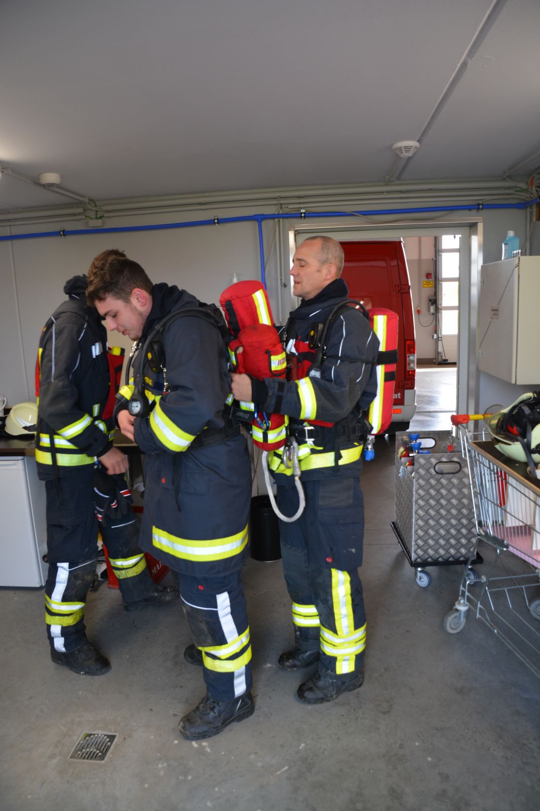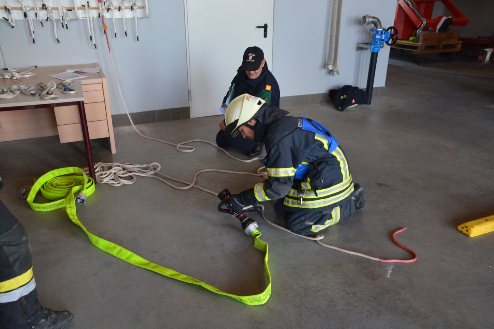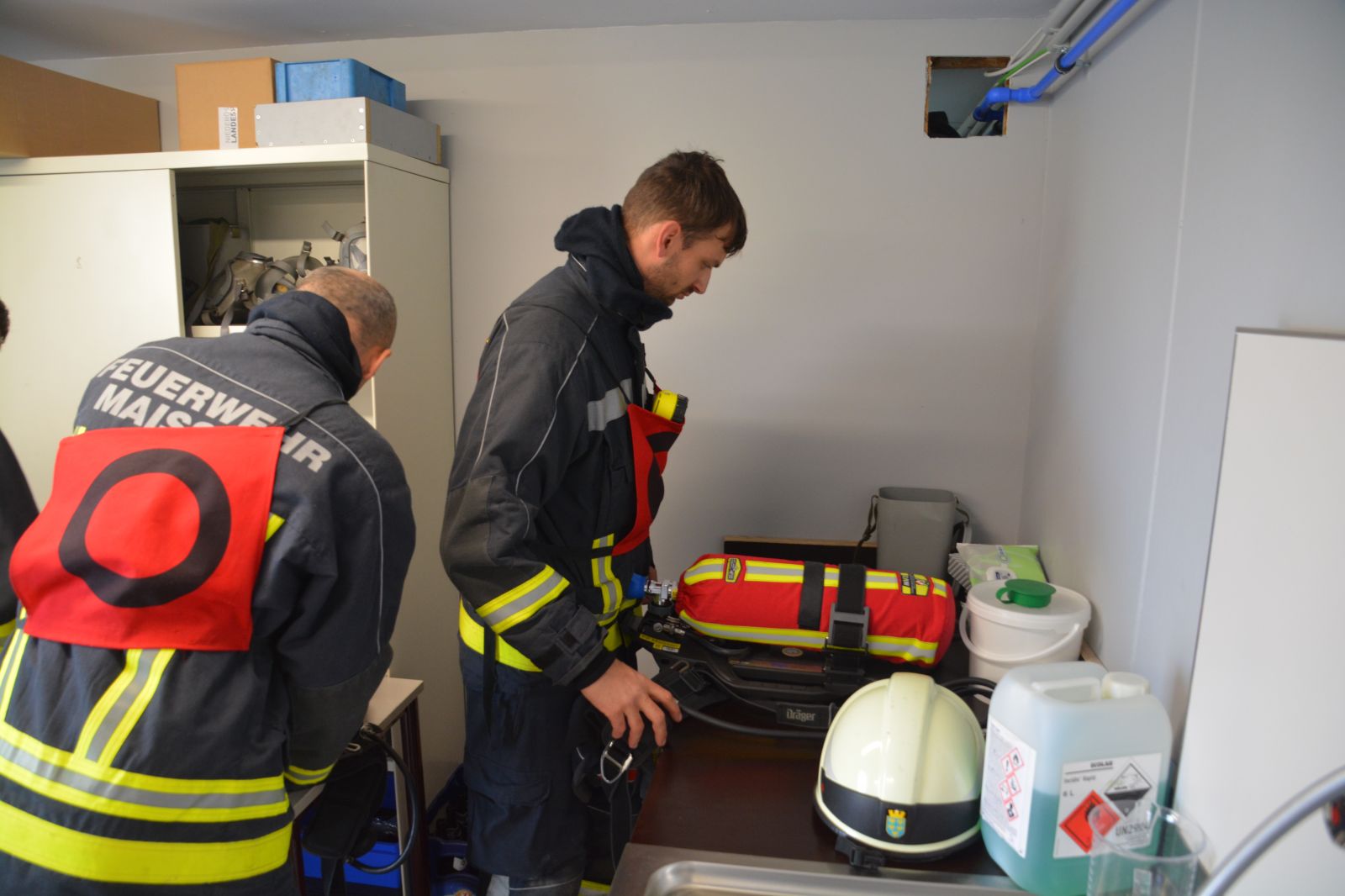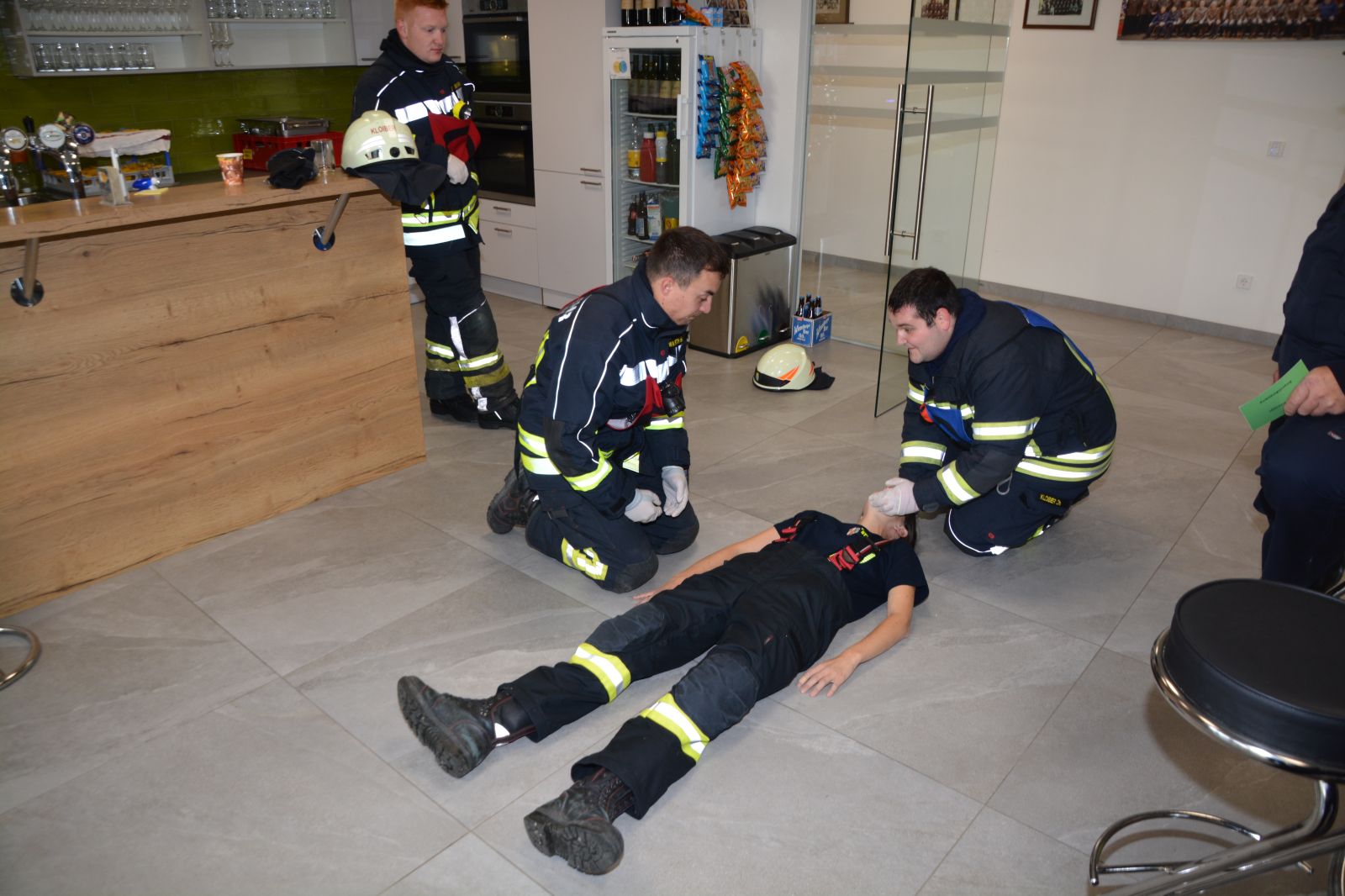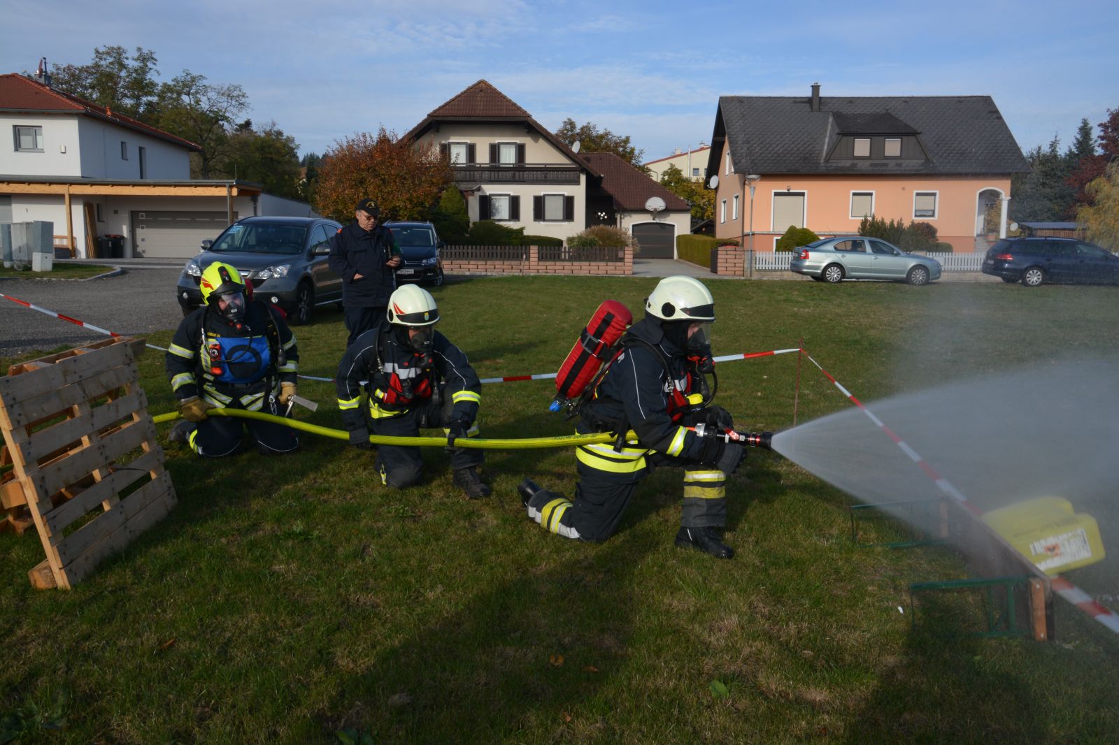 Im praktischen Teil musste ein simulierter Zimmerbrand gelöscht werden. Dabei musste der Innenangriff mit Atemschutz in einer vorgegebenen Zeit absolviert werden.