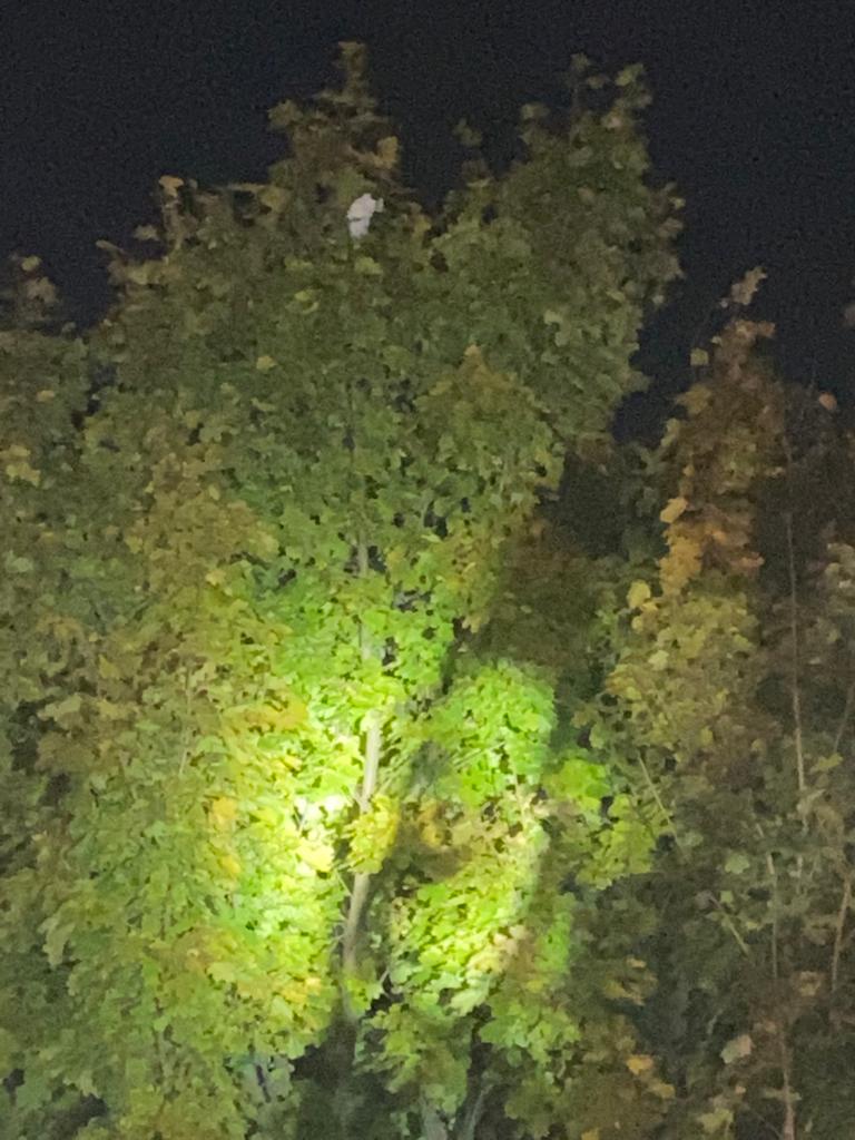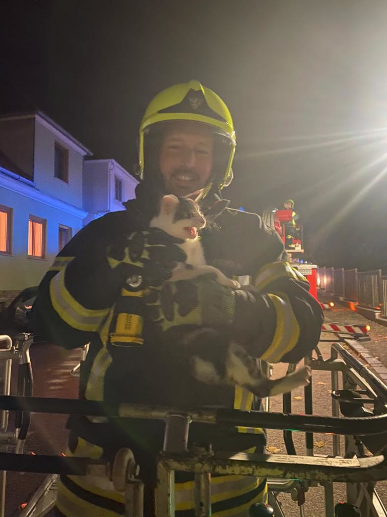 Ein Junge Katze war auf die Spitze eines ca. 10 Meter hohen Baum geklettert und konnte nicht mehr zurück. Mit dem Korb der Drehleiter wurde, von der Straße aus 22 Meter in den Garten, die Katze behutsam von der Baumspitze gerettet und unbeschadet dem überglücklichen Katzenbesitzer übergeben. Nach 30 Minuten konnten die Einsatzkräfte wieder ins Feuerwehrhaus einrücken.