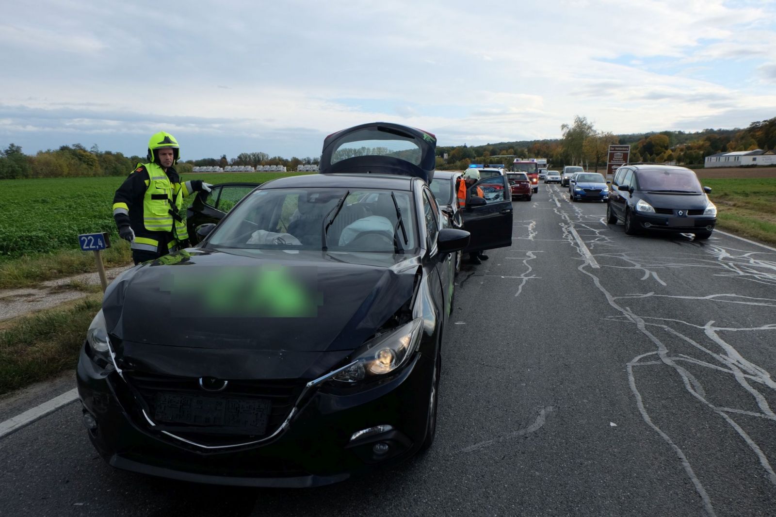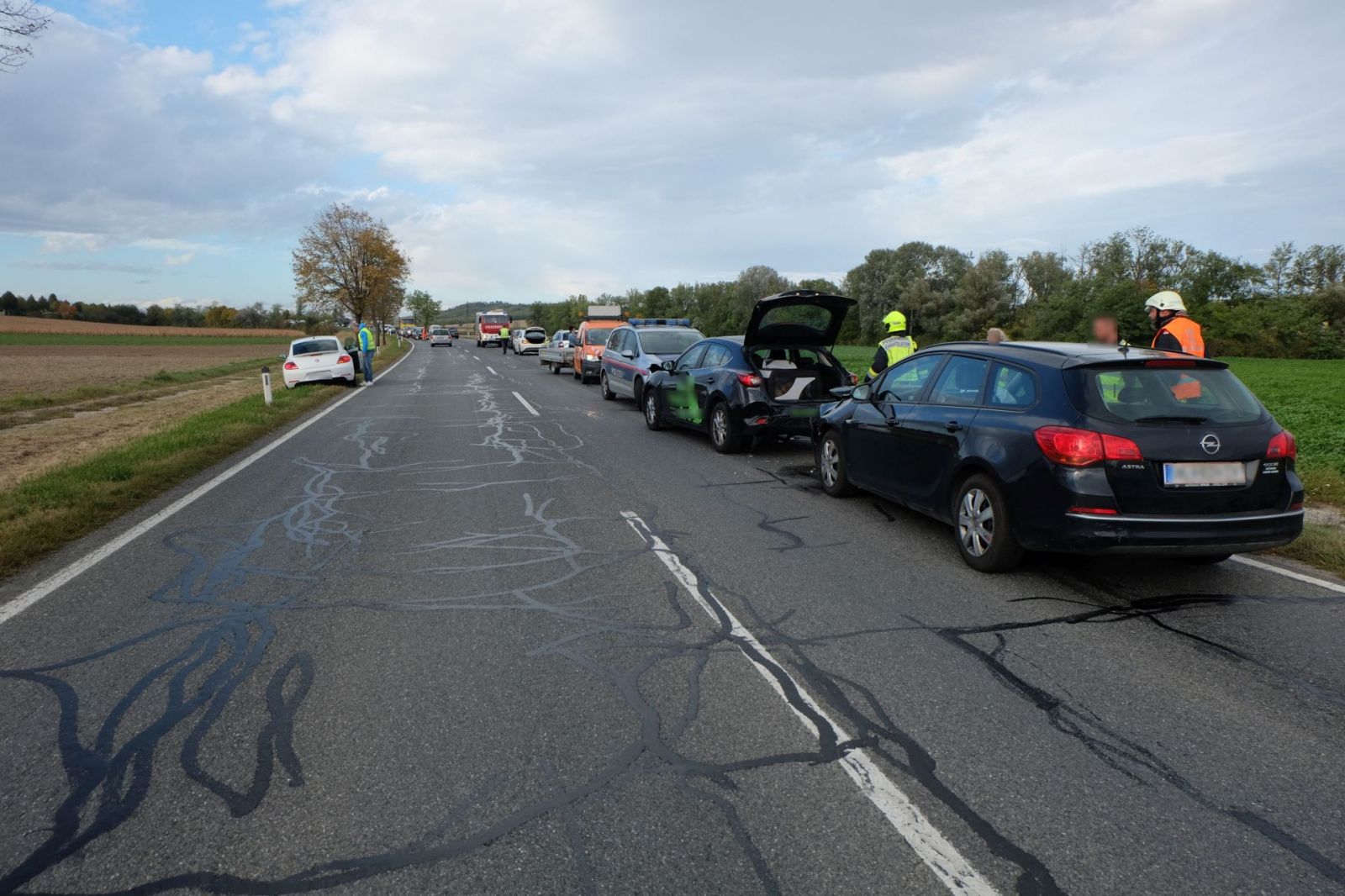Aus unbekannter Ursache bremste ein Pkw-Lenker stark ab. Dahinter fahrende Lenker konnten nicht rechtzeitig reagieren, wodurch in Summe sieben Fahrzeuge beschädigt und zum Teil fahruntüchtig auf der B4 zum Stillstand kamen.