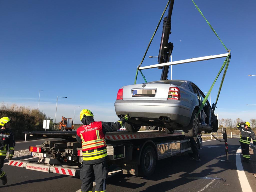 Der Lenker eines PKW war aus unbekannter Ursache mit der Leitschiene kollidiert, dabei wurden das rechte Vorderrad sowie beide Türen der rechten Seite abgerissen. Der Lenker konnte das Fahrzeug selbstständig und unverletzt verlassen, Polizei und ASFINAG waren anwesend.