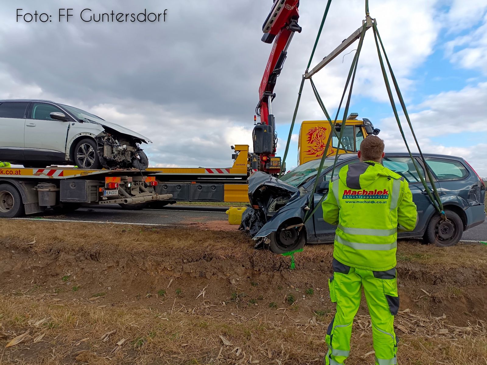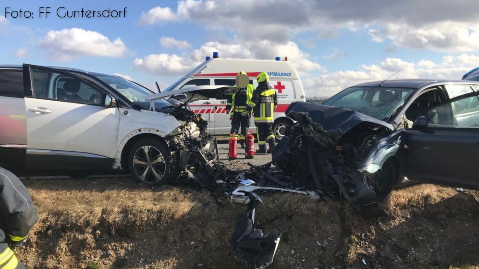 Auch zu Mittag am 12. Februar heulten in Guntersdorf die Sirenen. T1 – Verkehrsunfall mit 6 verletzten Personen lautete der Alarmierungstext. Binnen weniger Minuten rückten die Kameraden zur Einsatzstelle auf der B303 Richtung Jetzelsdorf aus, wo sich dem Einsatzleiter folgendes Bild bot: Zwei PKW waren frontal zusammengestoßen, mehrere Verletzte befanden sich in der unmittelbaren Umgebung, darunter auch Kinder. Das Rote Kreuz war bereits mit einem Fahrzeug bereits vor Ort, ebenso die Polizei. Umgehend wurde die Unfallstelle mit doppeltem Brandschutz gesichert und mit der Betreuung der Fahrzeuginsassen begonnen. Nach und nach trafen weitere Kräfte des Roten Kreuzes ein, welche von den Feuerwehrkameraden bei der Versorgung unterstützt wurden. Im weiteren Verlauf trafen auch zwei Notarzthubschrauber ein, welche die schwer verletzten Personen abtransportierten. Nachdem alle Beteiligten abtransportiert wurden, begannen die Kameraden mit der Reinigung der Fahrbahn und dem Einsammeln der herumliegenden Fahrzeugteile. Als auch die Unfallfahrzeuge durch die Firma Machalek verladen waren konnten noch ausgelaufene Betriebsmittel gebunden werden. Nach knapp zwei Stunden konnte die Einsatzbereitschaft wieder hergestellt werden.