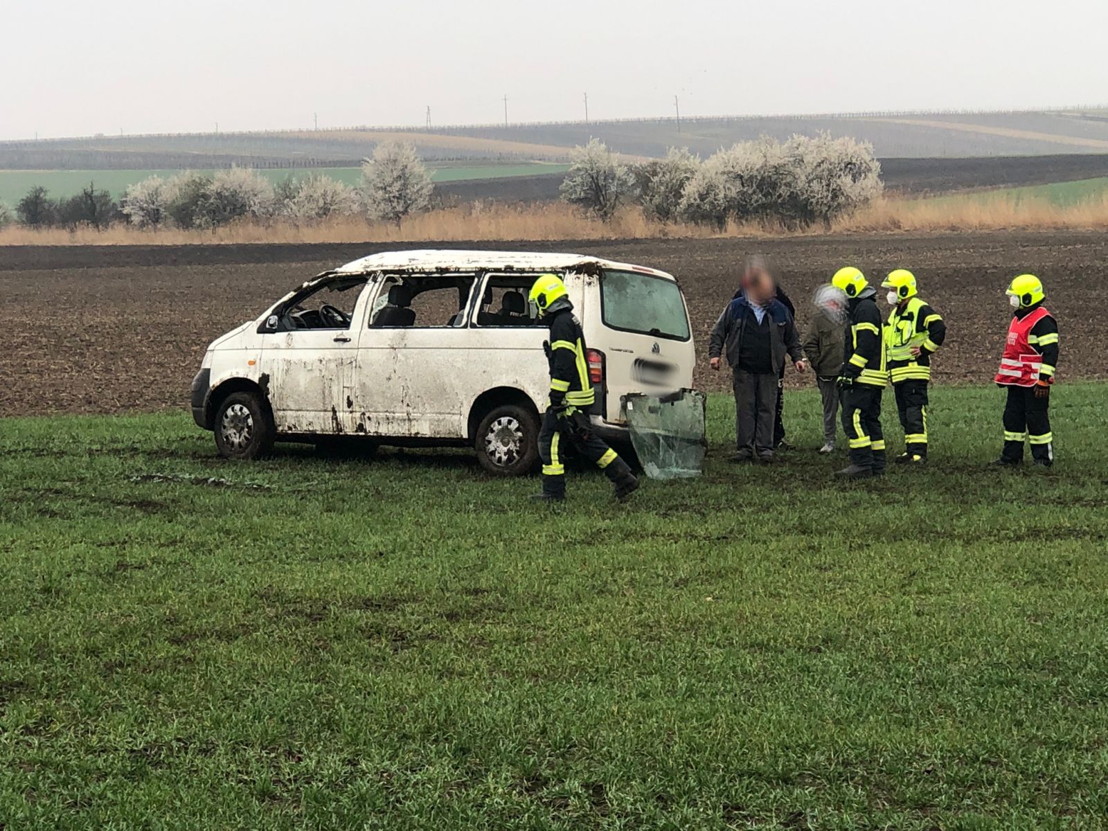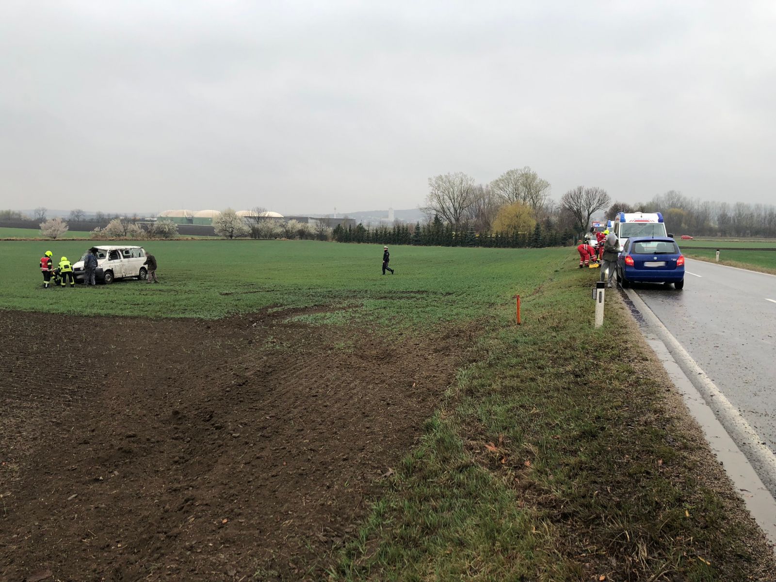 Ein VW-Bus kam auf regennasser Fahrbahn ins Schleudern, überschlug sich mehrmals und kam ca. 50 Meter von der Straße entfernt auf allen 4 Rädern zum Stillstand.