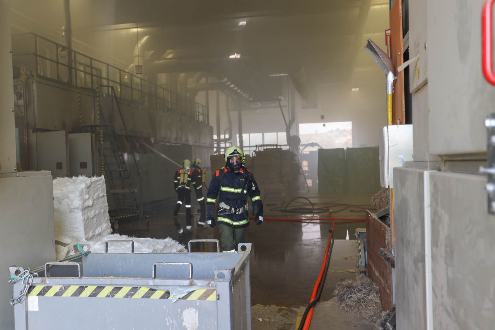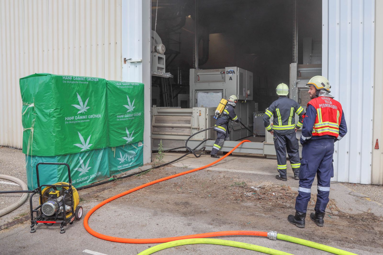 In einer gewerblich genutzten Halle entzündete sich der Inhalt einer weitläufigen Anlage und füllte die Halle rasch mit dichtem Rauch. Mehrere Atemschutztrupp wurden deshalb umgehend zur Brandbekämpfung in die Halle geschickt. Der Löschangriff mit zwei Leitungen zeigte rasch Wirkung und der Brand konnte rasch unter Kontrolle gebracht werden.