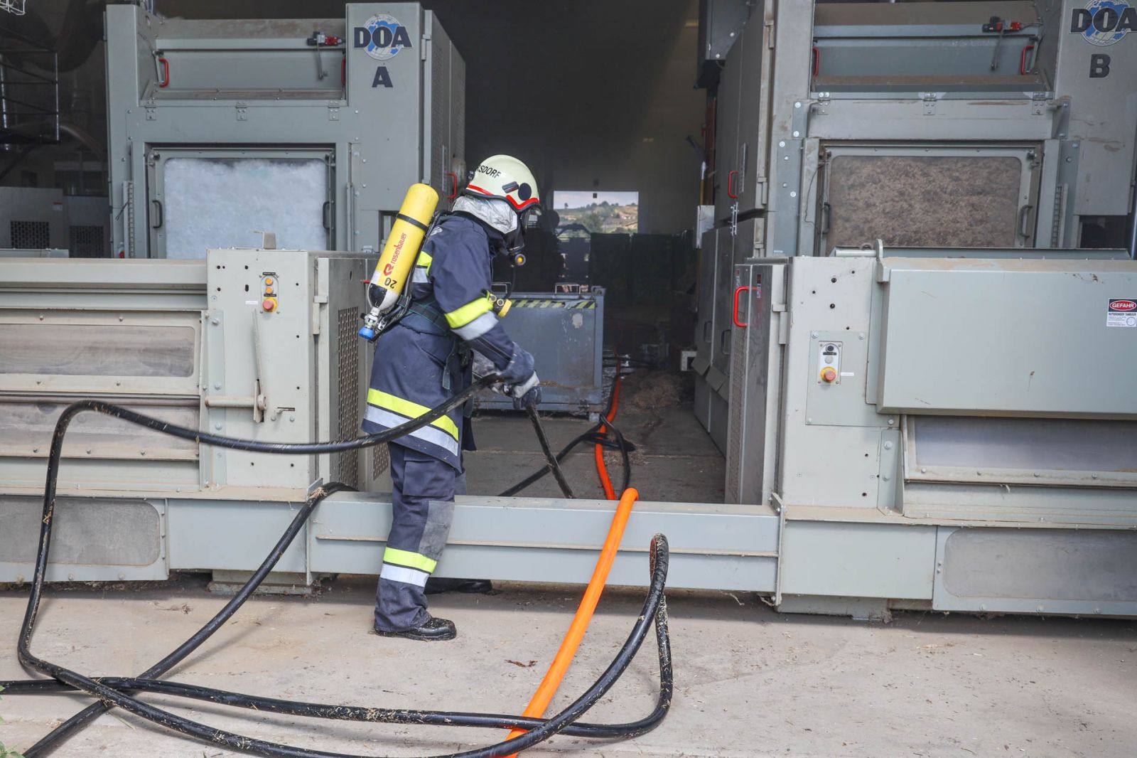 Die Nachlöscharbeiten innerhalb der weitläufigen Anlage gestalteten sich als schwierig und deshalb wurden noch weitere Feuerwehren alarmiert. Insgesamt waren 13 Atemschutztrupps im Einsatz.