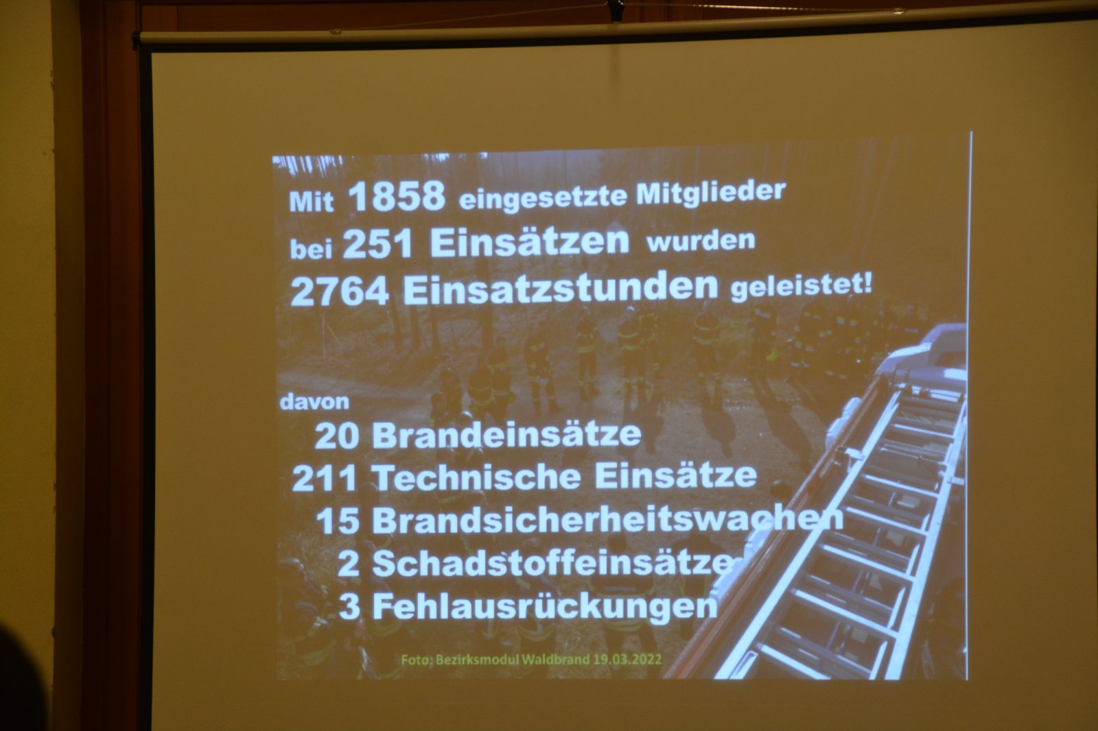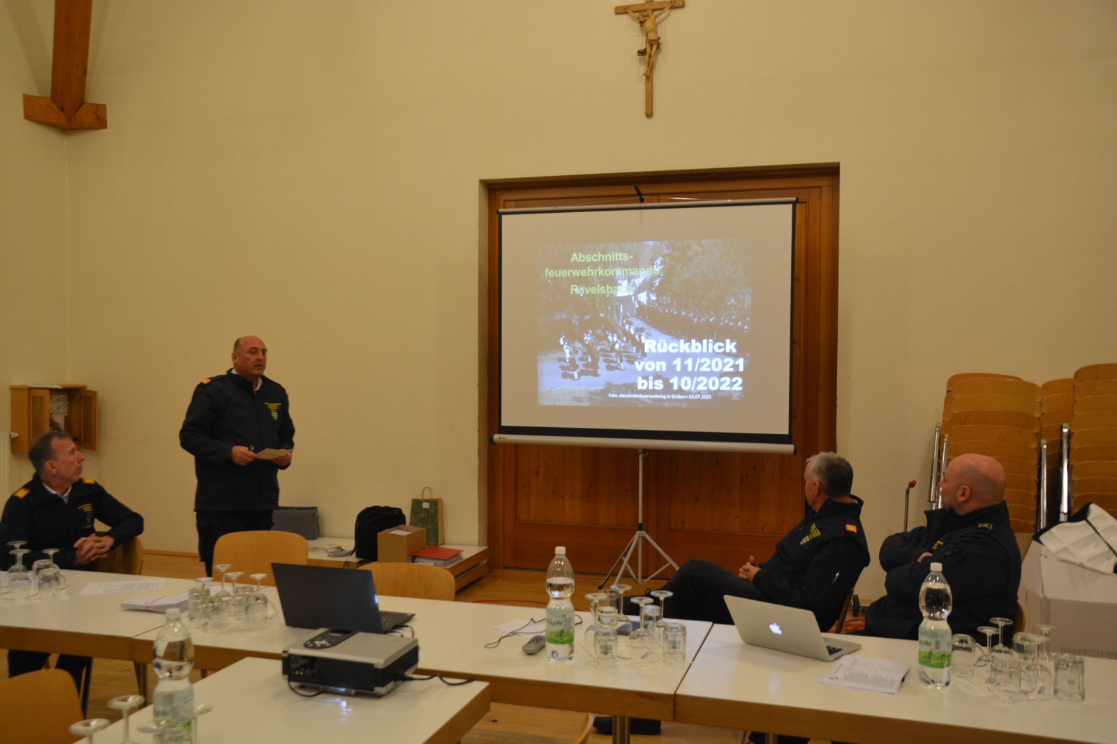 Danach startete die Sitzung mit dem Totengedenken. Dann machte BR Andreas Schwingl einen Jahresrückblick vom Oktober 2021 bis Oktober 2022. Der Abschnitt Ravelsbach besteht aus 26 Feuerwehren und 1061 Mitgliedern (702 Männer, 73 Frauen, 229 Reservisten, 36 Burschen und 21 Mädchen). Diese Feuerwehrkameraden führten seit November 2021 251 Einsätze mit 2764 Einsatzstunden aus. Die Mehrheit dieser Einsätze besteht aus technischen Einsätzen.