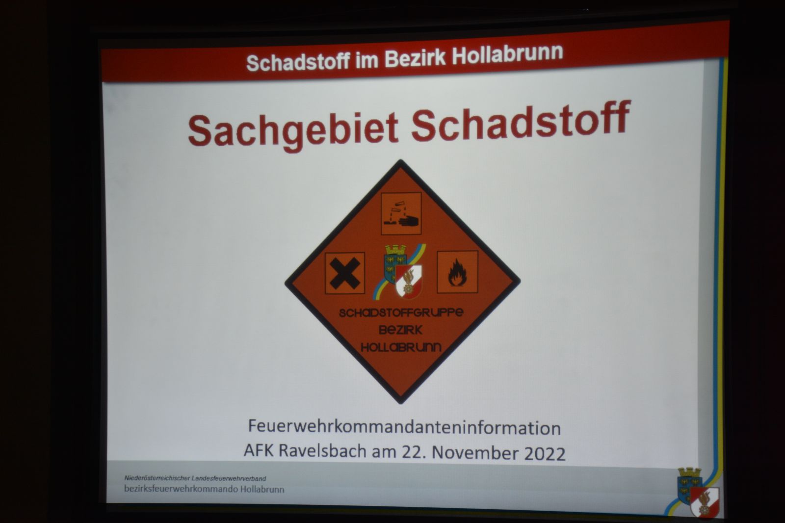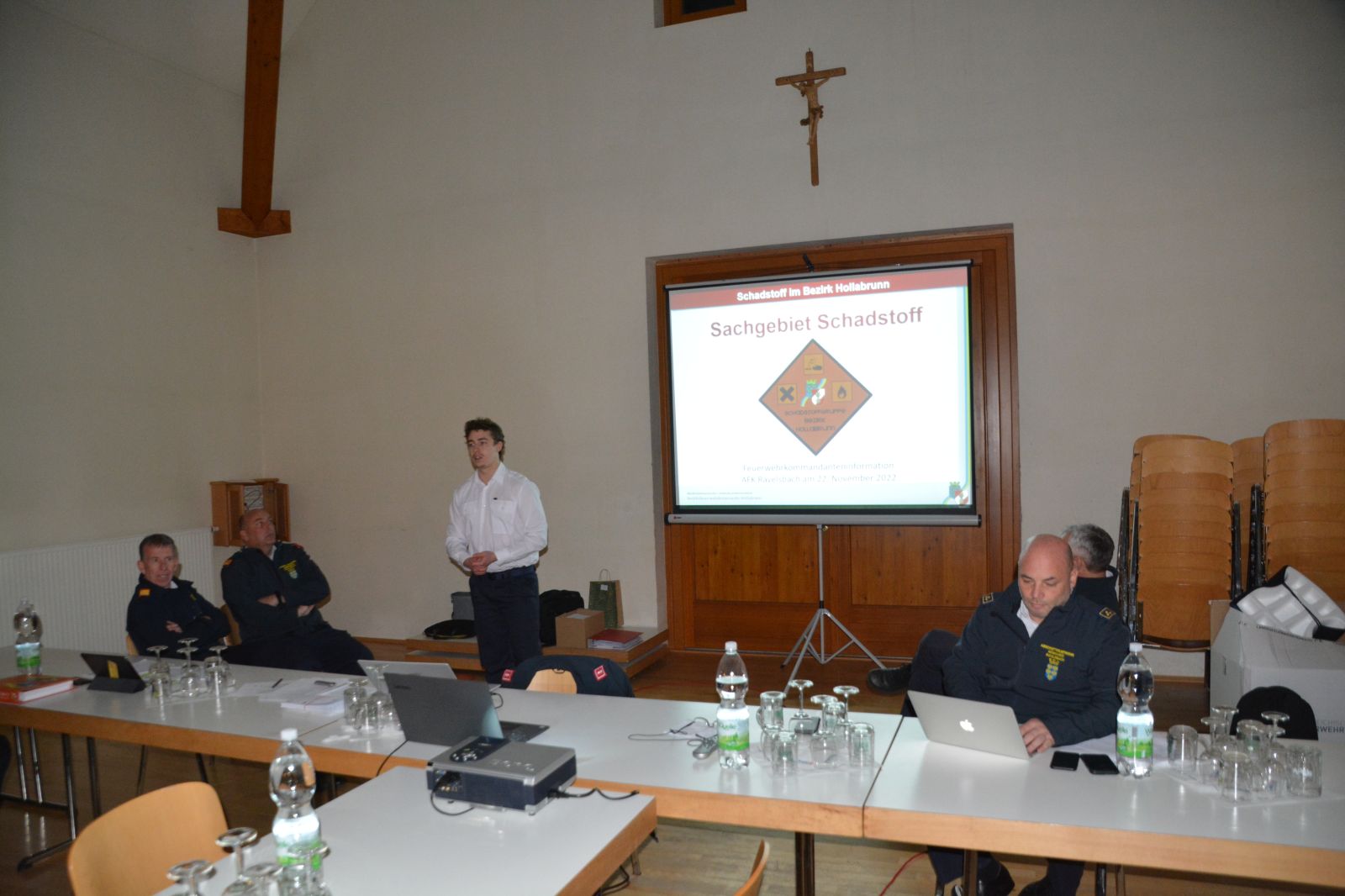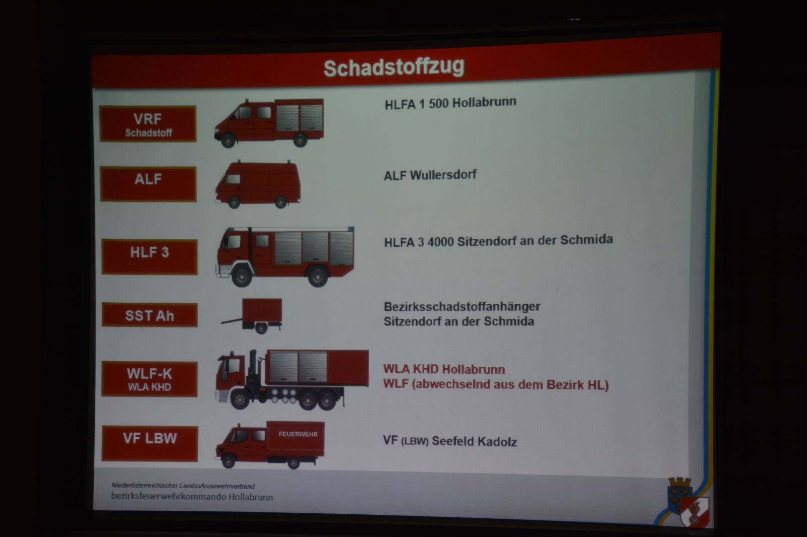 Abschnittskommandant BR Andreas Schwingl begrüßte alle Anwesenden. Danach gab einen Vortrag von ASB Julian Wollner über die neu gegründete Schadstoffgruppe des Bezirkes Hollabrunn. Bis vor 2 Jahren hatte jeder Abschnitt seine eigene Schadstoffgruppe, welche nun zu einer effektiveren Einheit zusammengelegt wurde. Derzeit besteht die Schadstoffgruppe aus 70 Mitglieder von 12 Feuerwehren.
